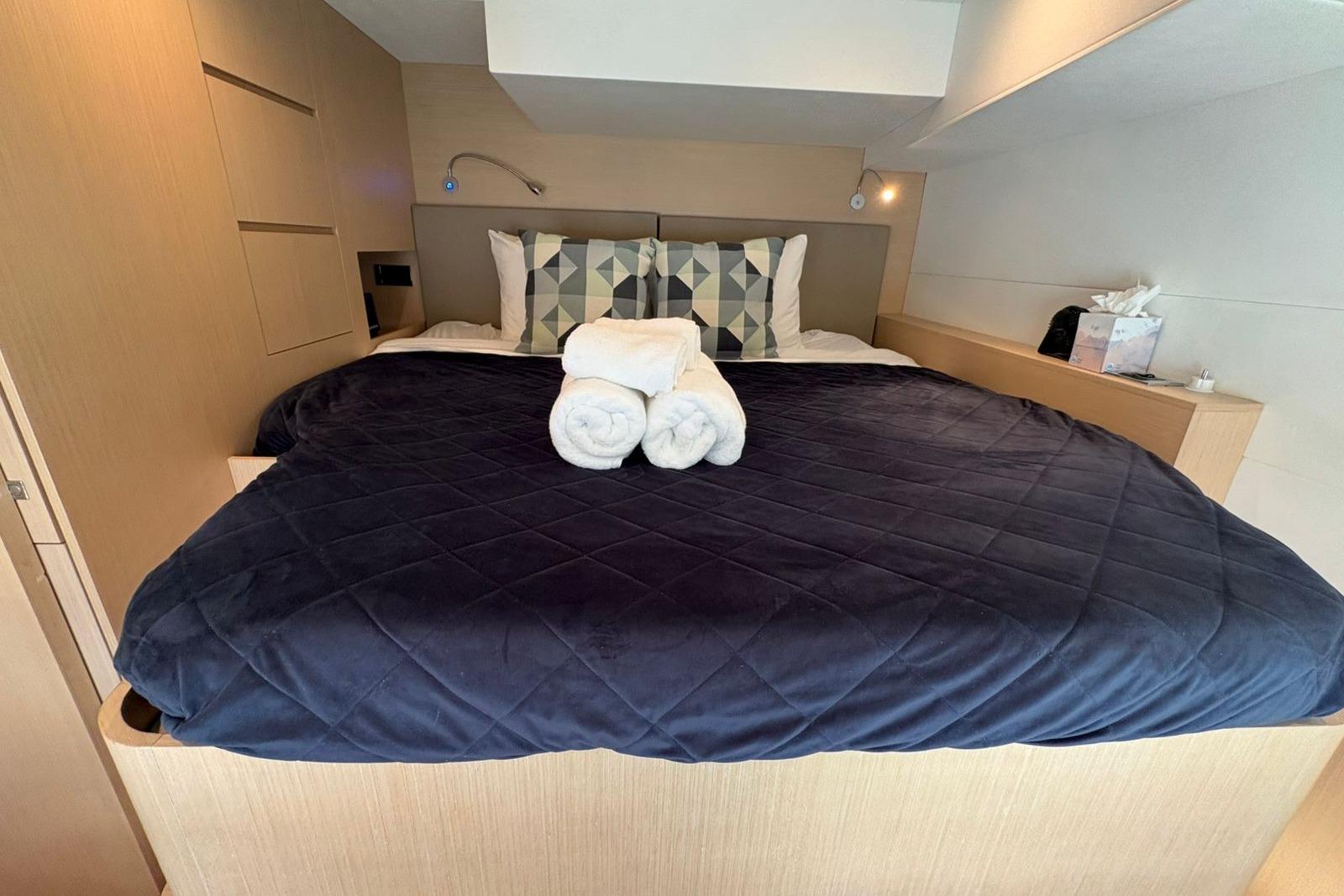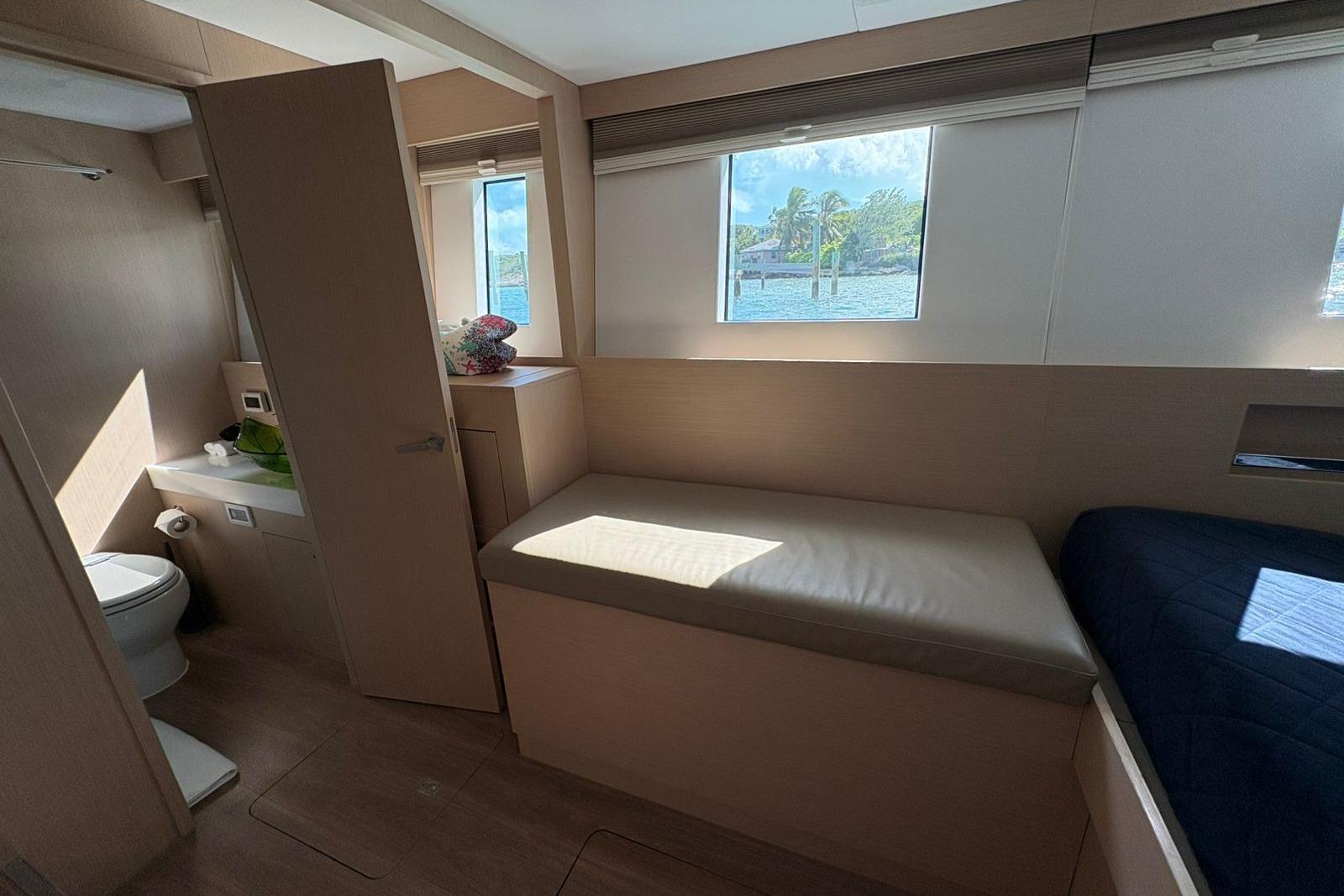 The expansive catamaran design provides exceptional stability and living space. Her open-plan salon offers panoramic views and seamless flow to the aft cockpit — perfect for entertaining or dining al fresco. Below, the Silent 55 features luxurious accommodations for up to 6 guests in elegantly appointed cabins, each with ensuite bathrooms.