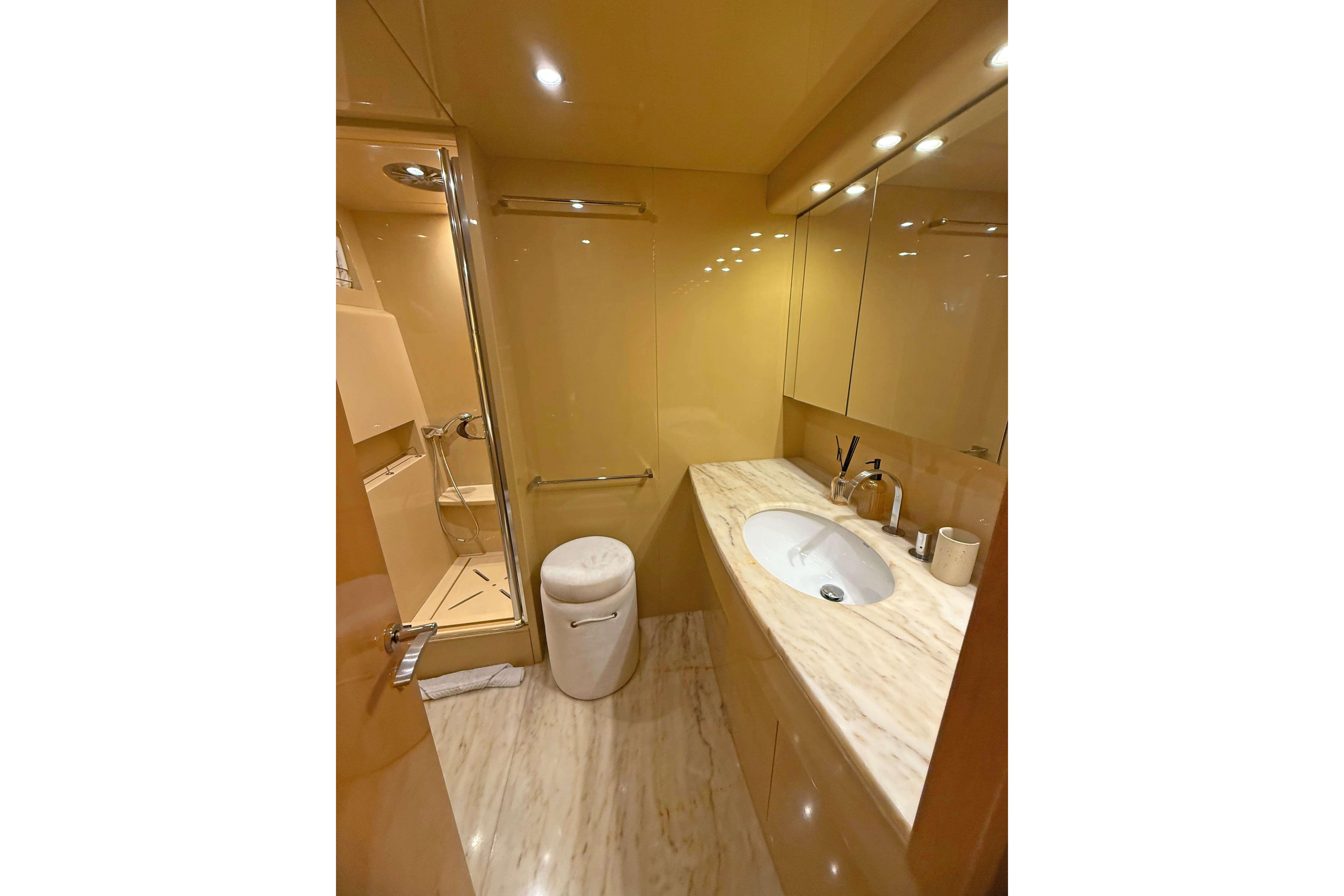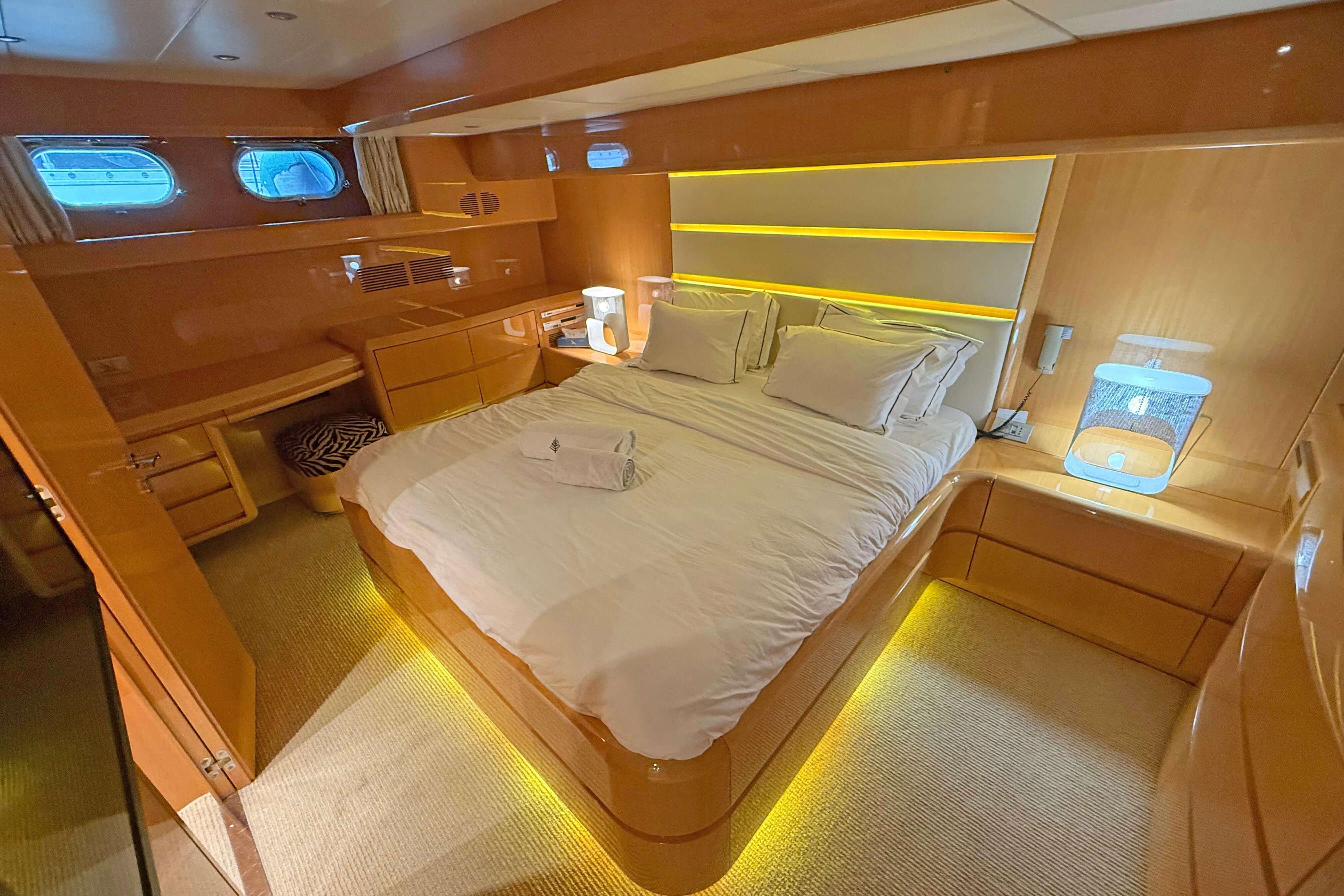 The interior layout accommodates up to nine guests in four well-appointed cabins, including a full-beam master suite, a VIP stateroom, and two twin cabins, one with a Pullman berth. Separate crew quarters for two ensure excellent service and full guest privacy.