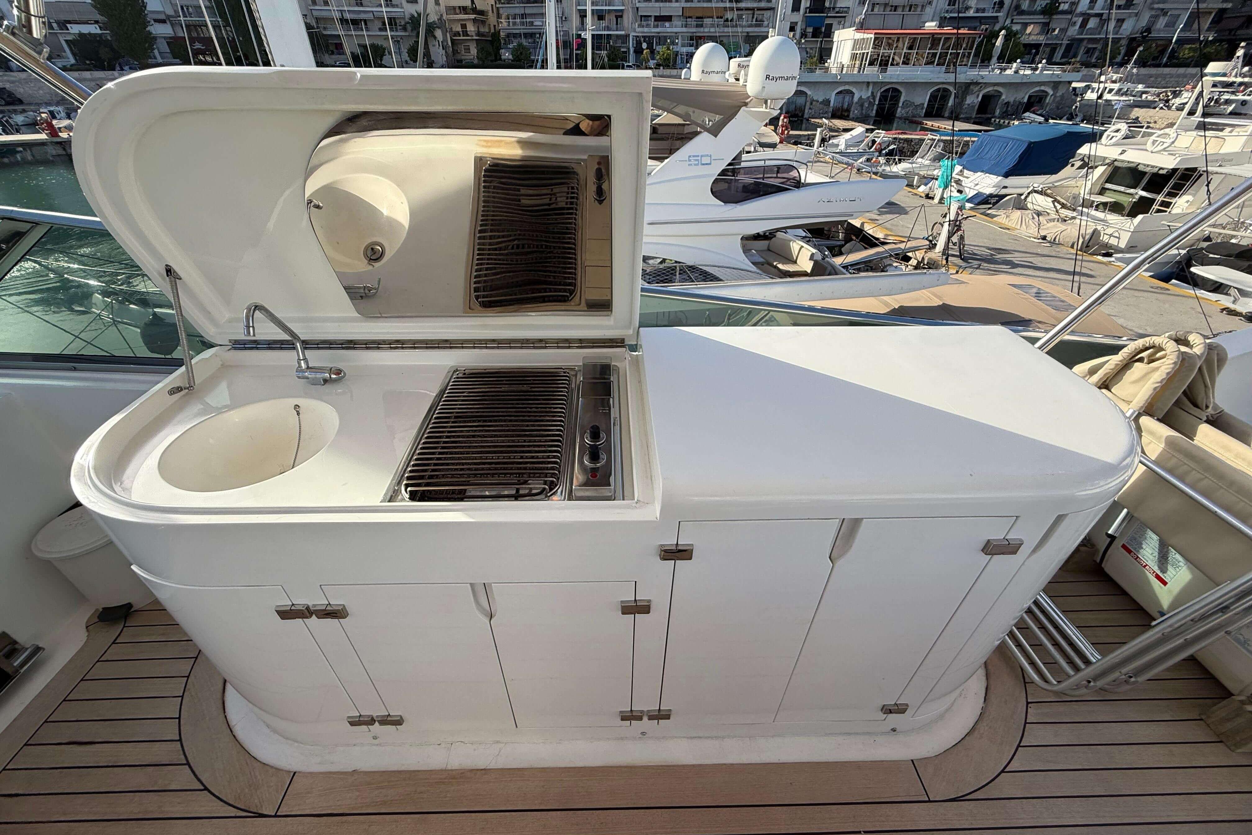 Measuring 21.38 metres in length, with a beam of 5.60 metres and a draft of 2.75 metres, this Maiora 21 offers a generous interior volume of 60.10 gross tons. Her sleek profile and classic design are complemented by reliable propulsion from twin Caterpillar C30 engines delivering 1,550 horsepower each. She cruises comfortably at 20 knots and reaches up to 25 knots at maximum speed. Manoeuvrability is enhanced by the presence of both bow and stern thrusters.