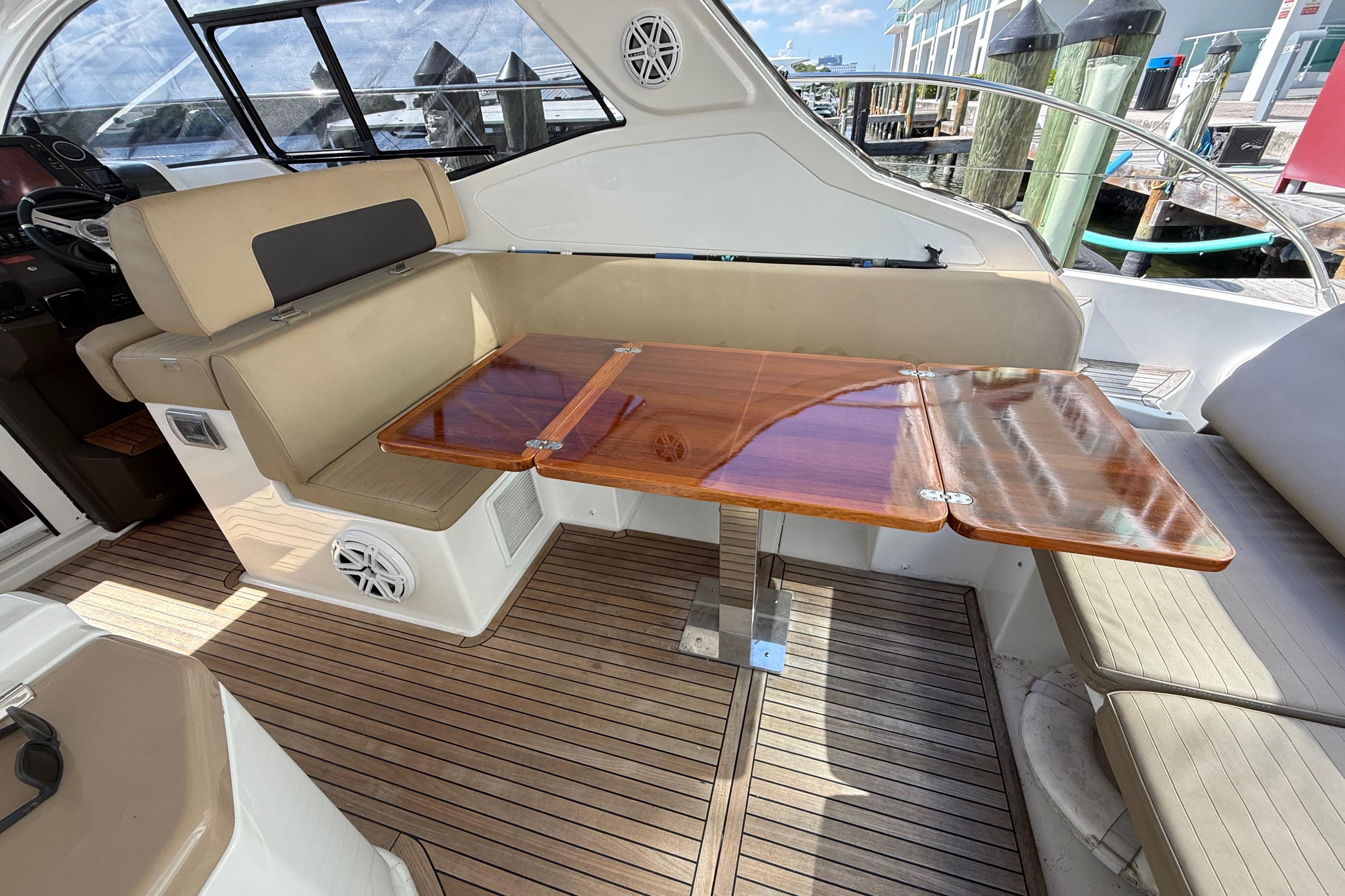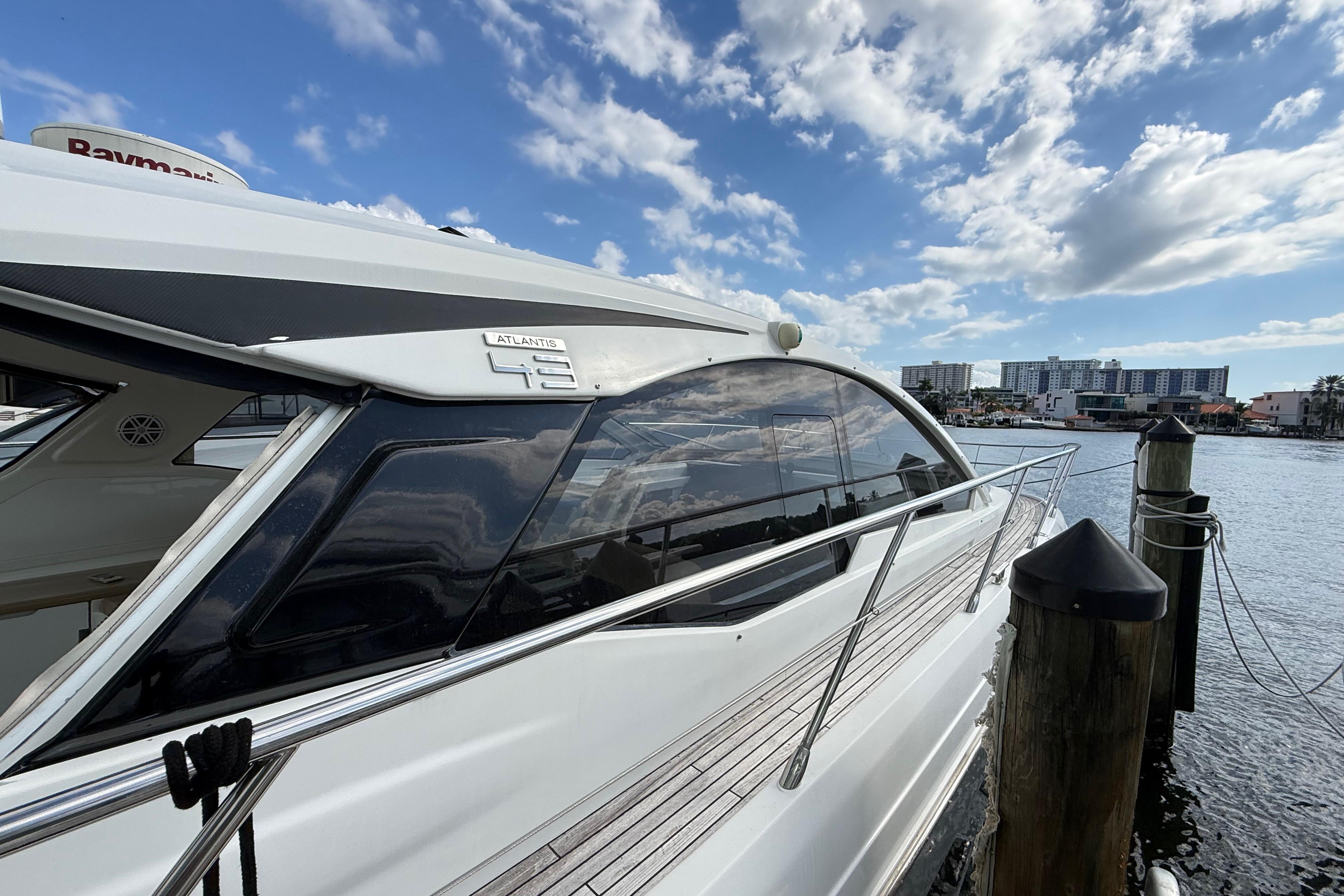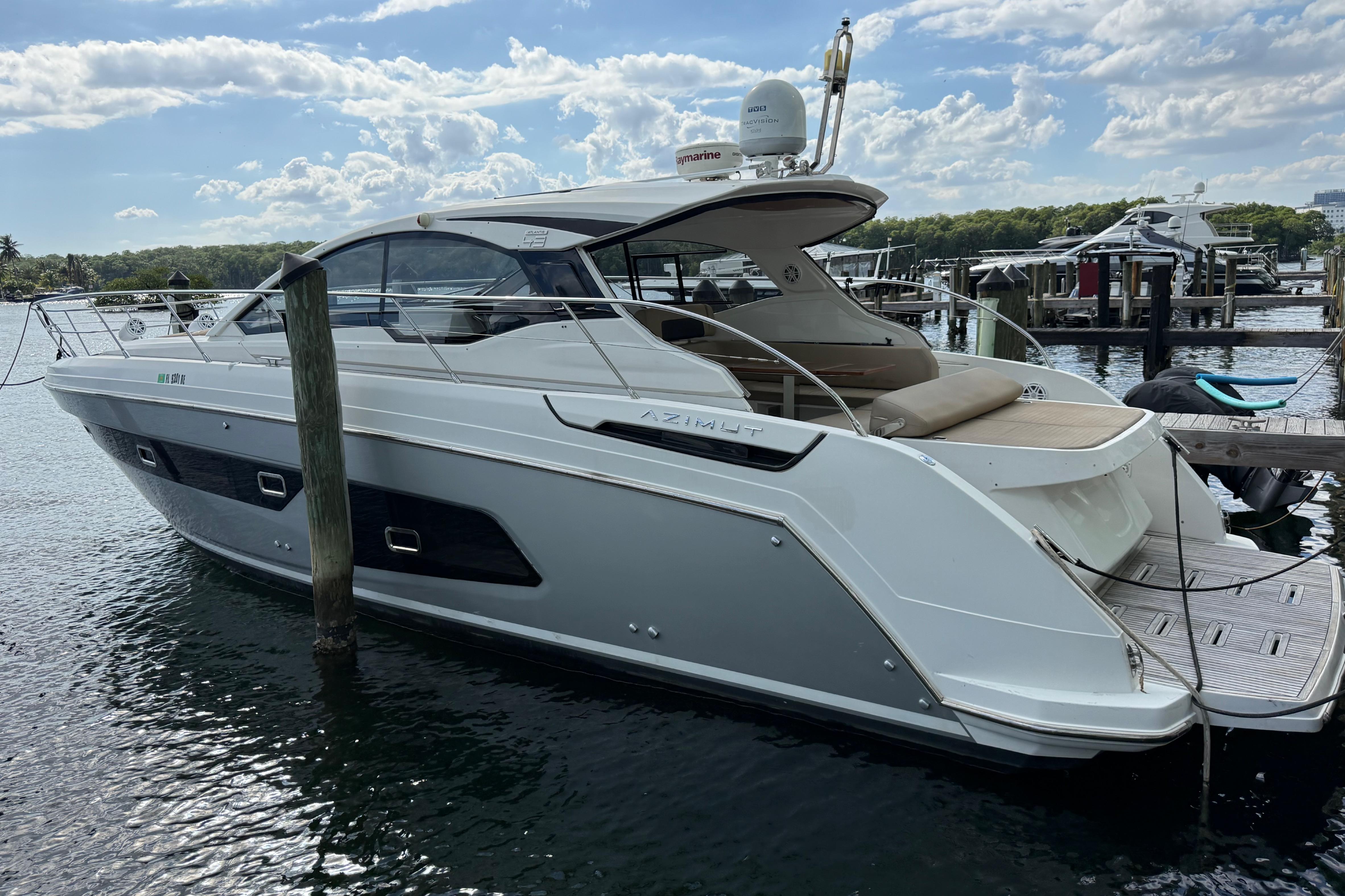This elegant 2016 Azimut Atlantis 43 is presented in excellent condition and powered by twin Volvo Penta D6-400 A-F engines (400 HP each) with 883 hours, serial numbers Port Engine: A446325 and Starboard Engine: A446695. This propulsion package is well-known for its strong performance, efficiency, and smooth maneuvering assisted by the Volvo Joystick Control. The vessel also features a MASE IS 9.6 kW generator, serial G150759 (2016), providing reliable onboard power for air conditioning, galley appliances, and all electrical systems while underway or at anchor. The exterior showcases Azimut’s signature Italian styling with a power sunroof (electric hardtop), a spacious cockpit with a wood table, wet bar, Fusion stereo system, large aft sunpad, wide side decks, and an oversized swim platform. Electronics include Raymarine HybridTouch GPS/Plotter, radar, autopilot, VHF radio, and Volvo engine displays. The interior offers two private cabins—an inviting forward master stateroom and a generous twin guest cabin with a large TV—along with a bright salon, full galley, and a well-appointed head with a separate shower. With its premium finishes, modern layout, strong mechanical package, and exceptional comfort, this Atlantis 43 is perfectly suited for cruising South Florida, the Keys, and weekend escapes to the Bahamas. A clean, stylish, and well-maintained sport cruiser ready for its next owner.