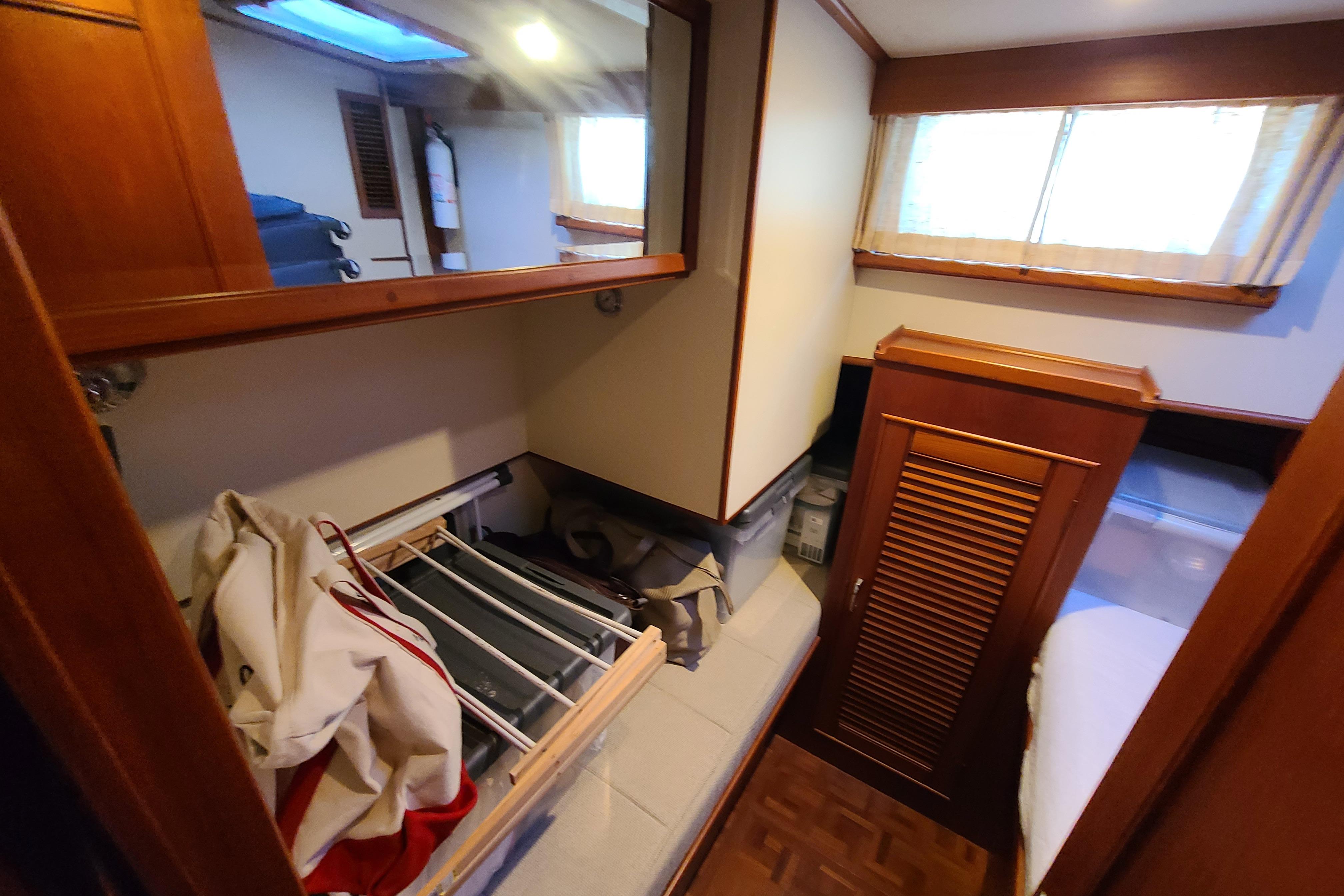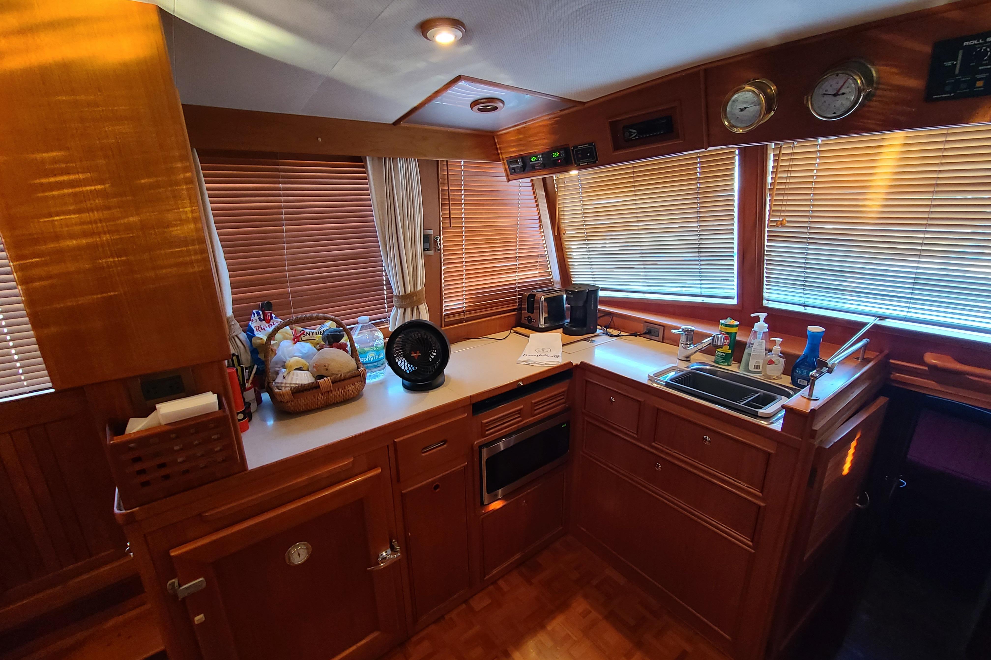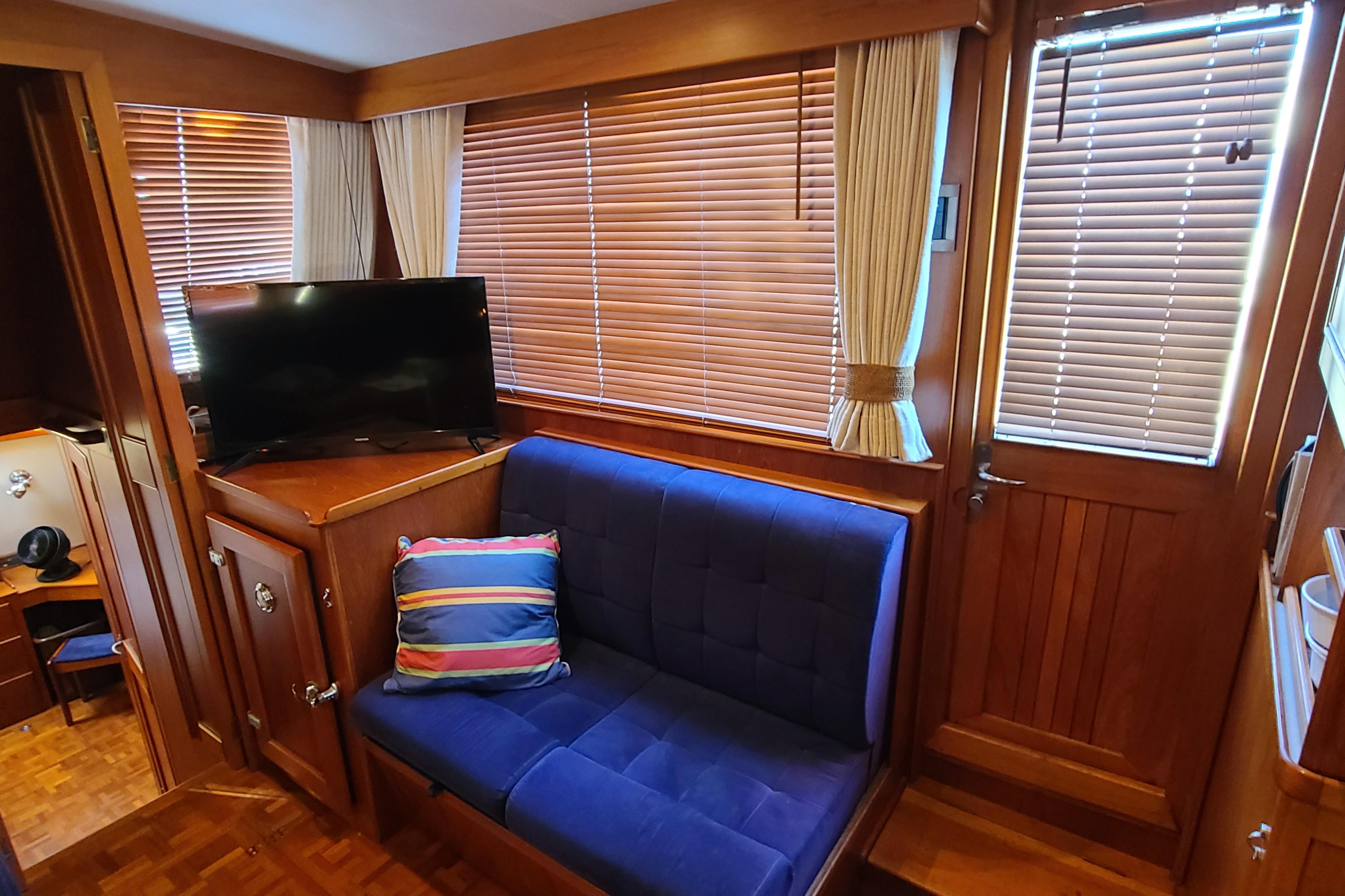 The Grand Banks 46 Classic is the perfect size for many cruising families. She offers plenty of interior space, and yet remains easily manageable for a crew of two. The 46 is available with a number of interior layouts: two forward staterooms or a galley-down version with one forward stateroom - providing extra space in the main saloon. Running the boat from the flybridge, the captain has superb visibility and total command of the ship thanks to the carefully planned steering and navigational area. Wide, walk-around decks and aft cockpit allow for the crew's safe, secure movement while at sea and during docking. In the large cockpit lazarette, in the seat lockers, on the aft cabin roof, and in the forward deck locker, are places for fenders, cleaning supplies, a dinghy, an outboard motor, power cables, dock lines, and more. In the saloon, comfortable seat lockers and a built-in teak table create a friendly and secure atmosphere underway or at anchor. The main saloon offers a panoramic view. An inside steering and navigational station provides a comfortable, dry haven for the helmsperson. The large owner's aft cabin can be arranged either with two seagoing berths or with a walkaround, queen-sized bed. The engine room, with over five-feet of headroom, has ample space for the generator, refrigeration compressor, and optional air conditioning equipment. Many owners have installed water makers, inverters, extra generators and other optional accessories in the large, well thought-out engine room. Several engine options are available from an economical single engine installation to twin turbocharged diesels. Cruising speeds range from 8 to 14 knots with top speeds to 18 knots.