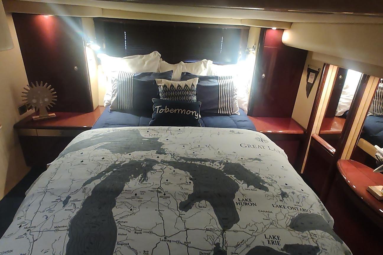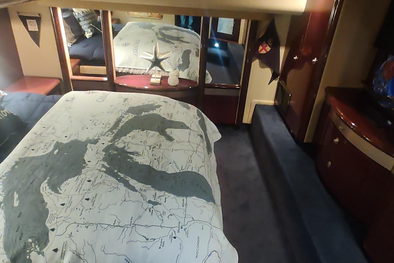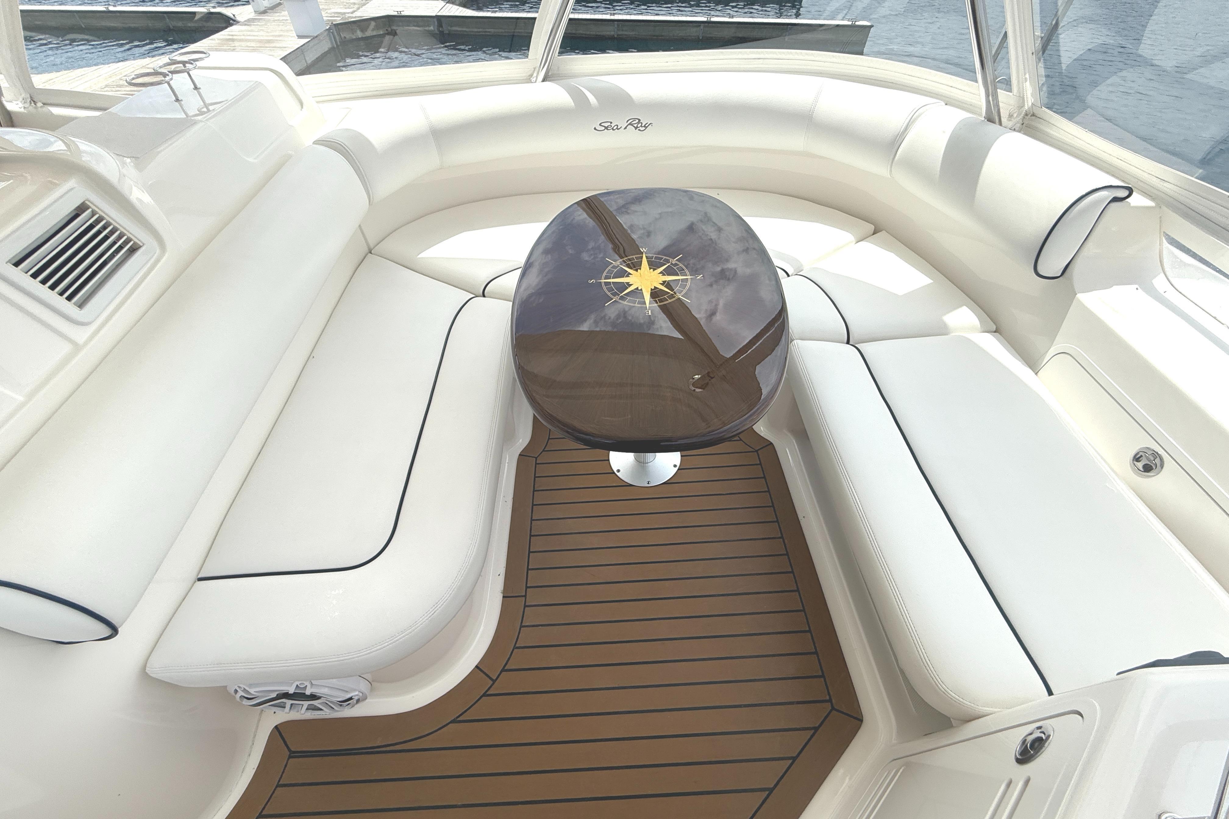 Key features- A full-beam master stateroom equipped with a 20" LCD flatscreen TV and an en suite head and shower.- Innerspring mattresses in both the master and forward staterooms for maximum comfort.- A standard bridge refrigerator, perfect for refreshments.- A fiberglass hardtop with a 20x20 hatch and an electronics box, providing excellent protection and utility.- Bridge Isinglass enclosure with U-zips, offering versatility in various weather conditions.- Bridge air conditioning for optimal comfort on warmer days.- Twin thigh-rise helm chairs with an up/down feature, ensuring a comfortable driving experience.- A standard sofa with a pullout bed, providing extra sleeping capacity.- A solid-wood dinette tabletop, adding a touch of elegance.- A fully equipped galley featuring a refrigerator and freezer with a built-in icemaker, microwave, and a Krups coffeemaker.- Standard tile flooring in the guest head.- Two full heads with separate showers, offering privacy and convenience.- A standard bow thruster for easy maneuvering.- Dripless shaft logs with an extra seal carrier kit, enhancing reliability.- A high-water bilge pump and alert system at the helm for added safety.- A Bose Lifestyle 48 interior stereo system for premium entertainment.- Sirius satellite receiver with antenna for a wide range of audio options.- Standard Sea Ray Navigator III, an advanced navigation system.- A potable water manifold system with individual shutoff valves, simplifying maintenance.