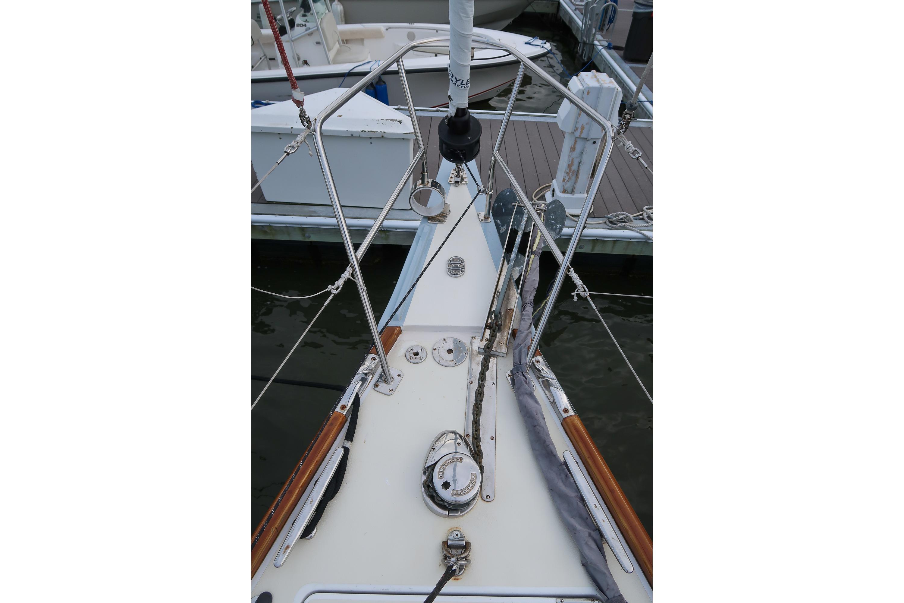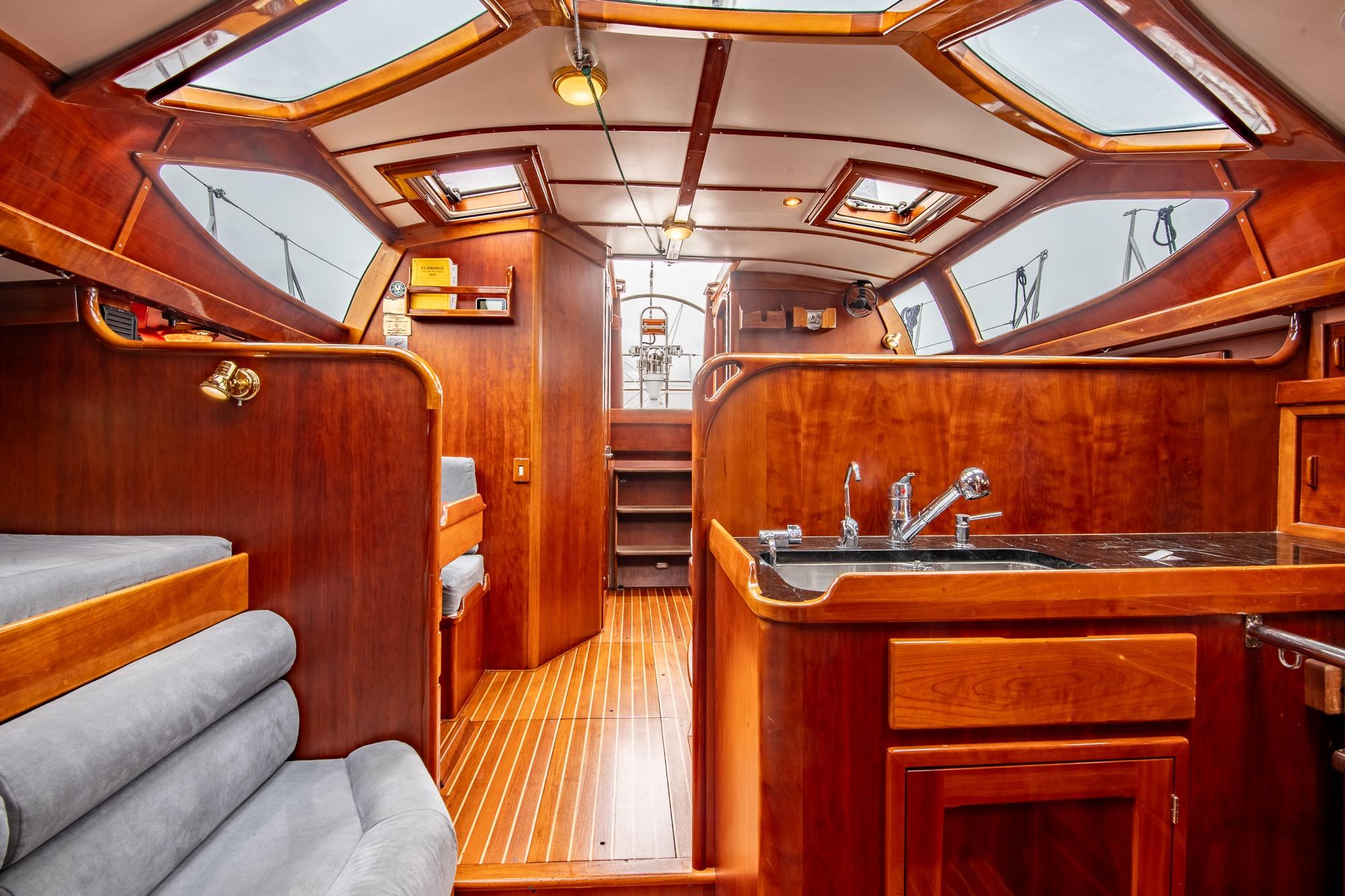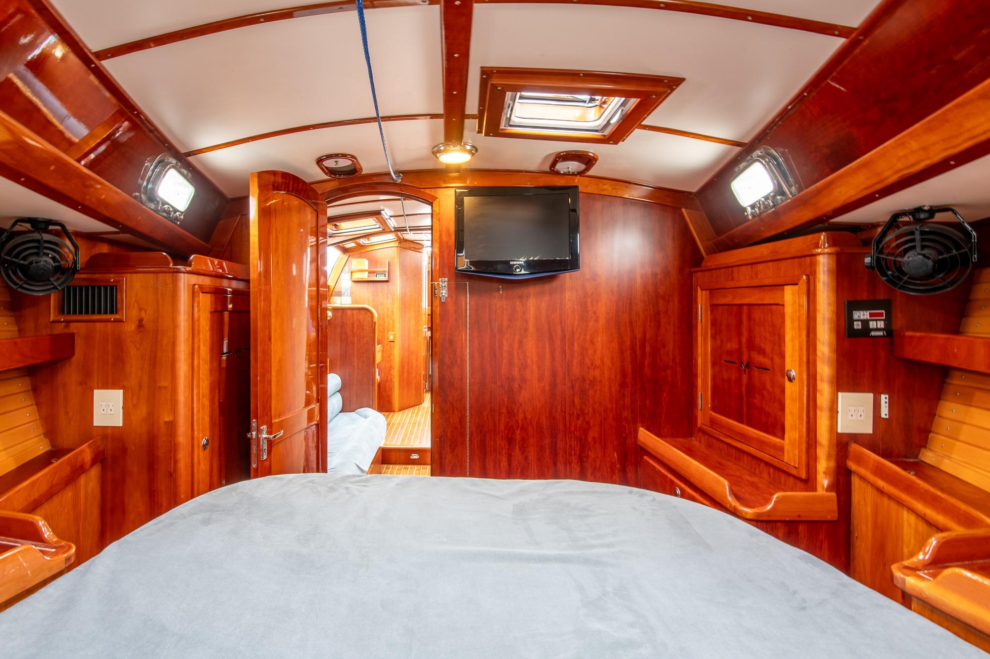 A step down from the raised salon is the galley to port with a settee and pilot berth opposite to starboard for visiting the cook or a comfortable berth underway near the center of gravity. The forward cabin with a centerline queen berth is forward.