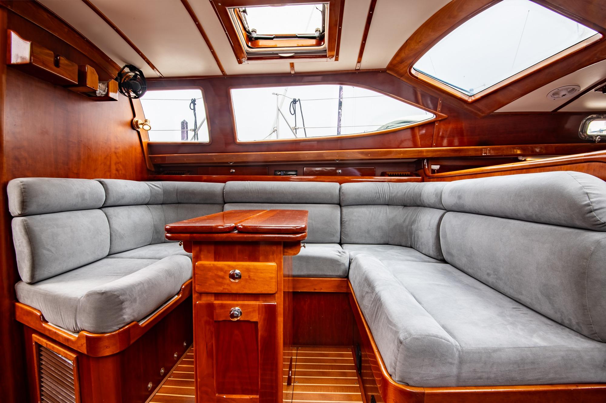 NEXT BOAT’s raised salon provides an open, light interior with an easy connection to the cockpit. Walking down the few easy steps from the cockpit one arrives in the raised salon area with views to the outside through the large side and forward windows. Immediately to port there is a private aft cabin with a double berth. Opposite to starboard is a large head with separate shower stall and wet locker, convenient to the companionway. Forward of the aft cabin and head is the U-shaped dinette to port and the nav station opposite to starboard.
