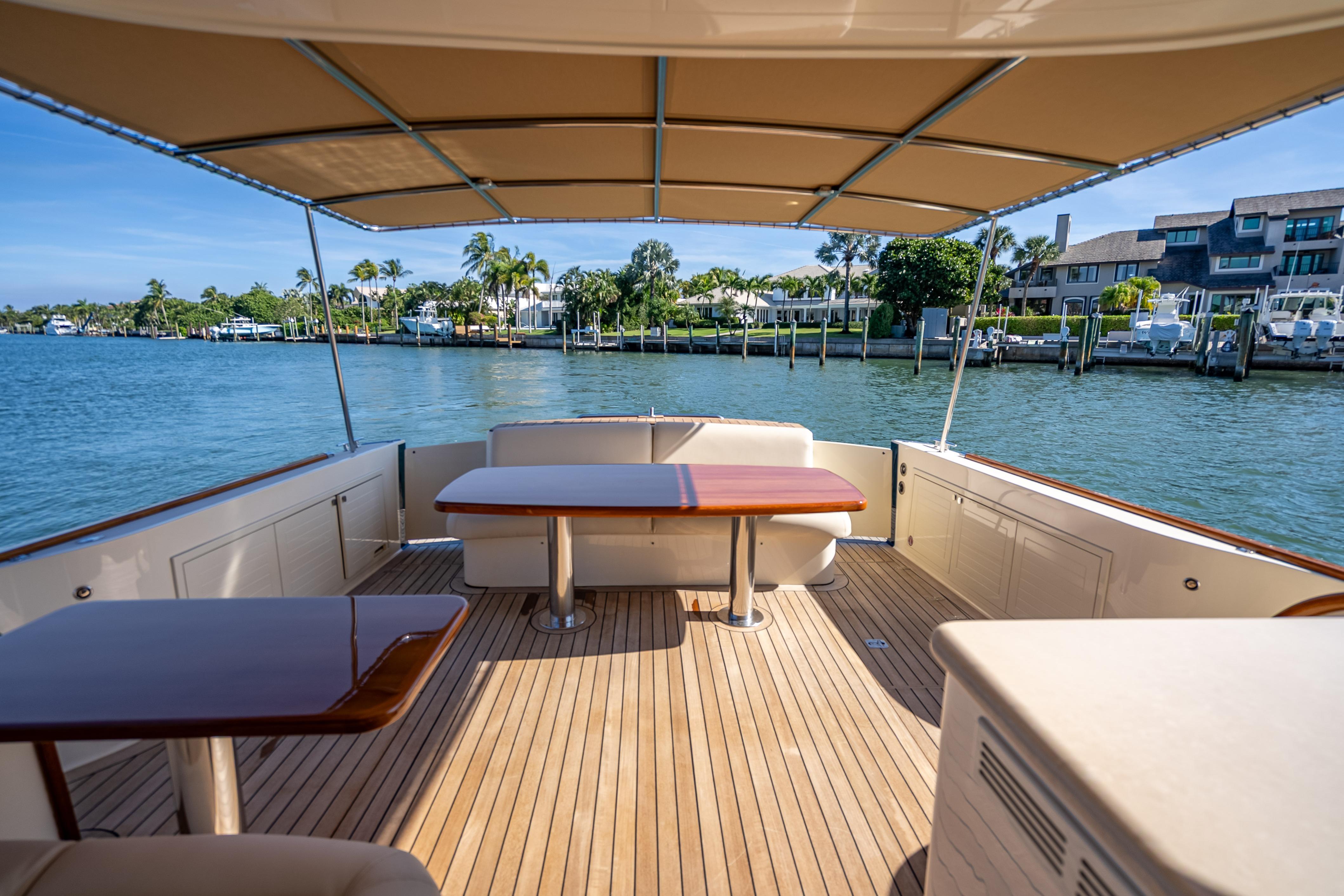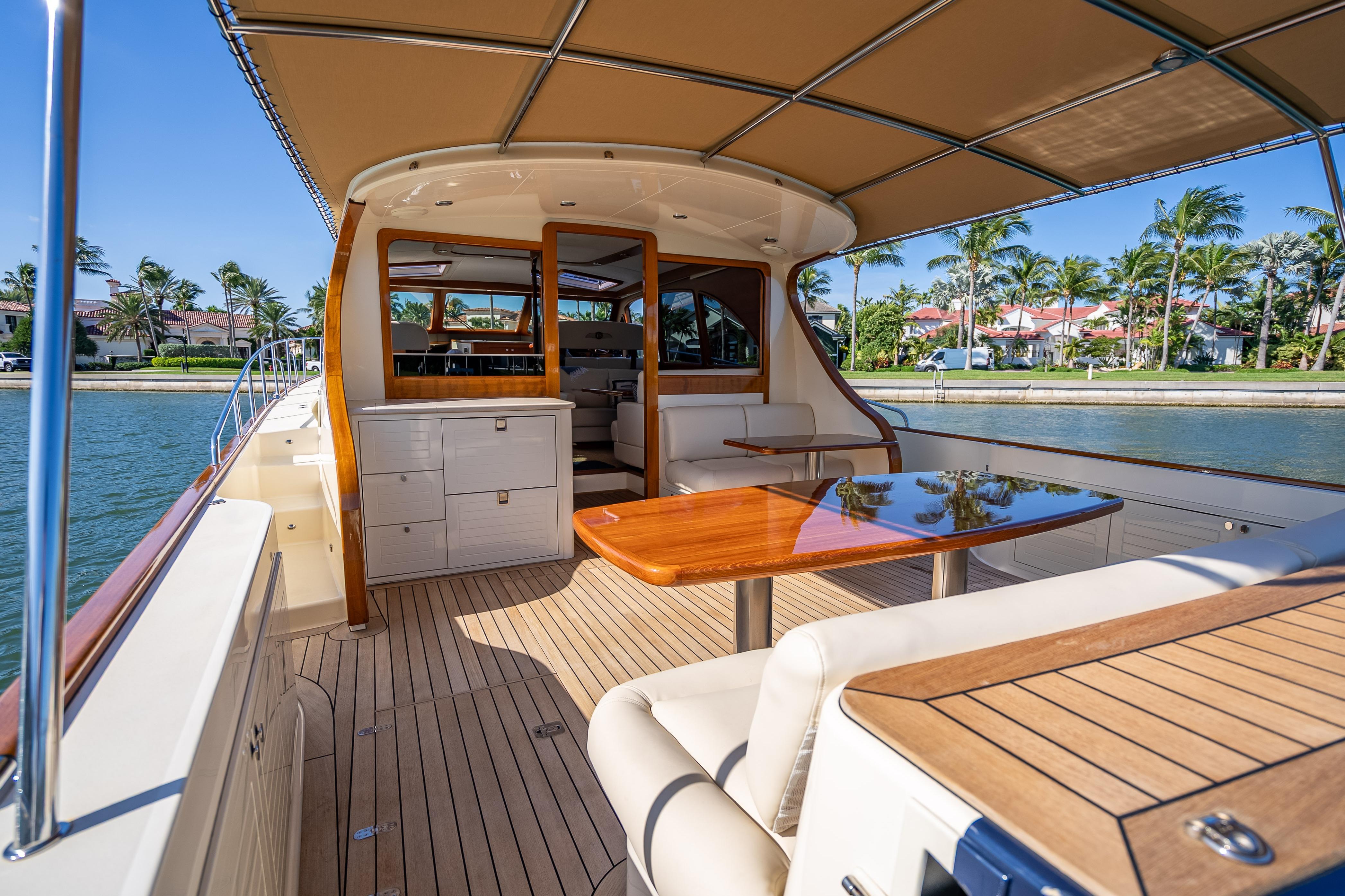 - Custom Layout with aft port L-Galley and fore-aft stbd settees with hydraulic hi-lo table with folding leaves