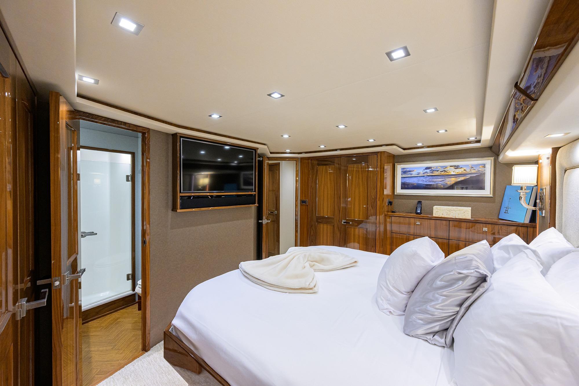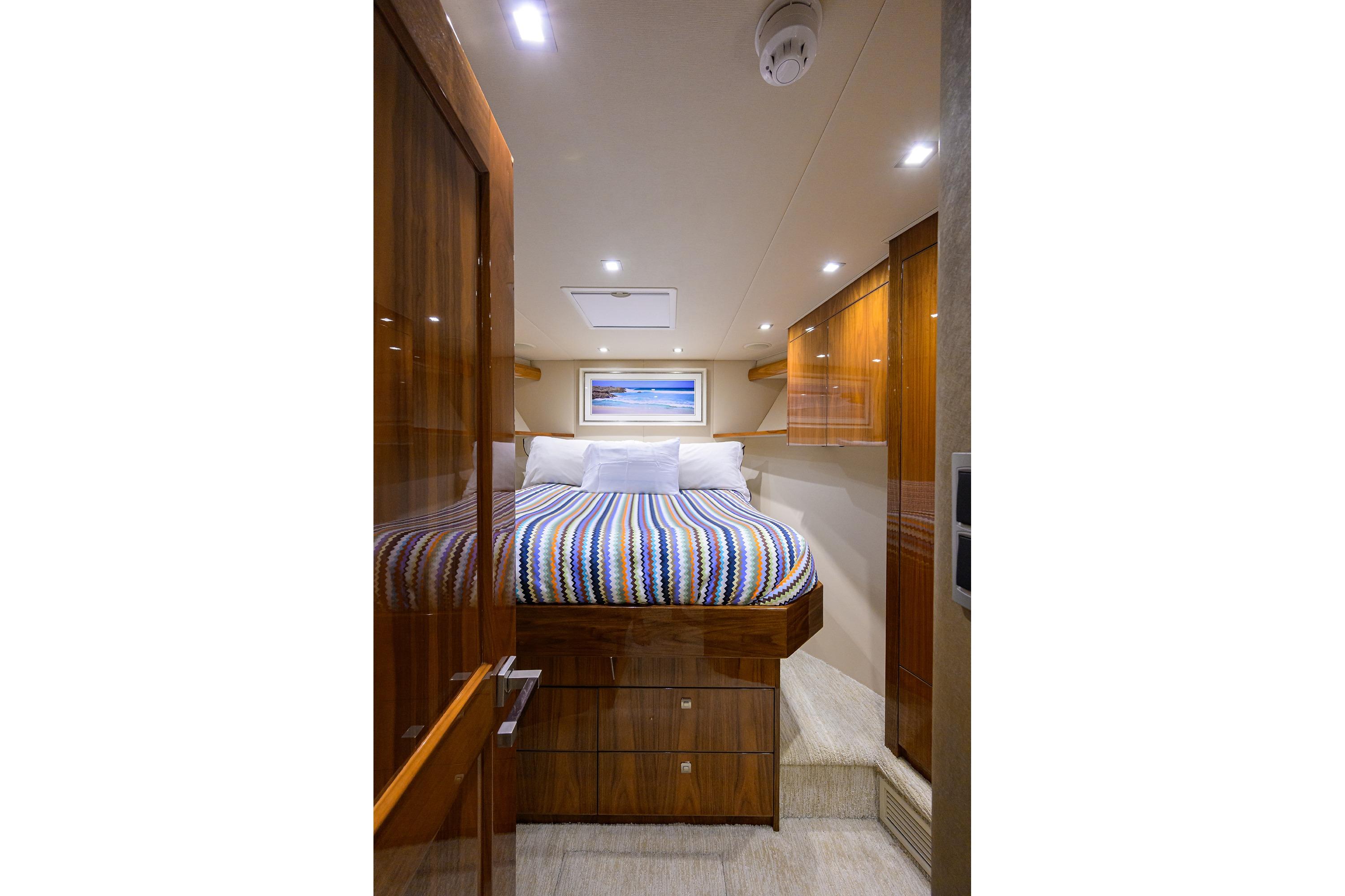 The interior showcases Viking’s signature walnut gloss finish with custom décor throughout, including custom Amtico flooring, brushed nickel hardware, upgraded mattresses, custom countertops, and abundant storage. Multiple social areas- the salon, dinette, enclosed bridge, mezzanine, and cockpit- make TORTA perfectly suited for extended fishing trips or relaxed cruising with guests.