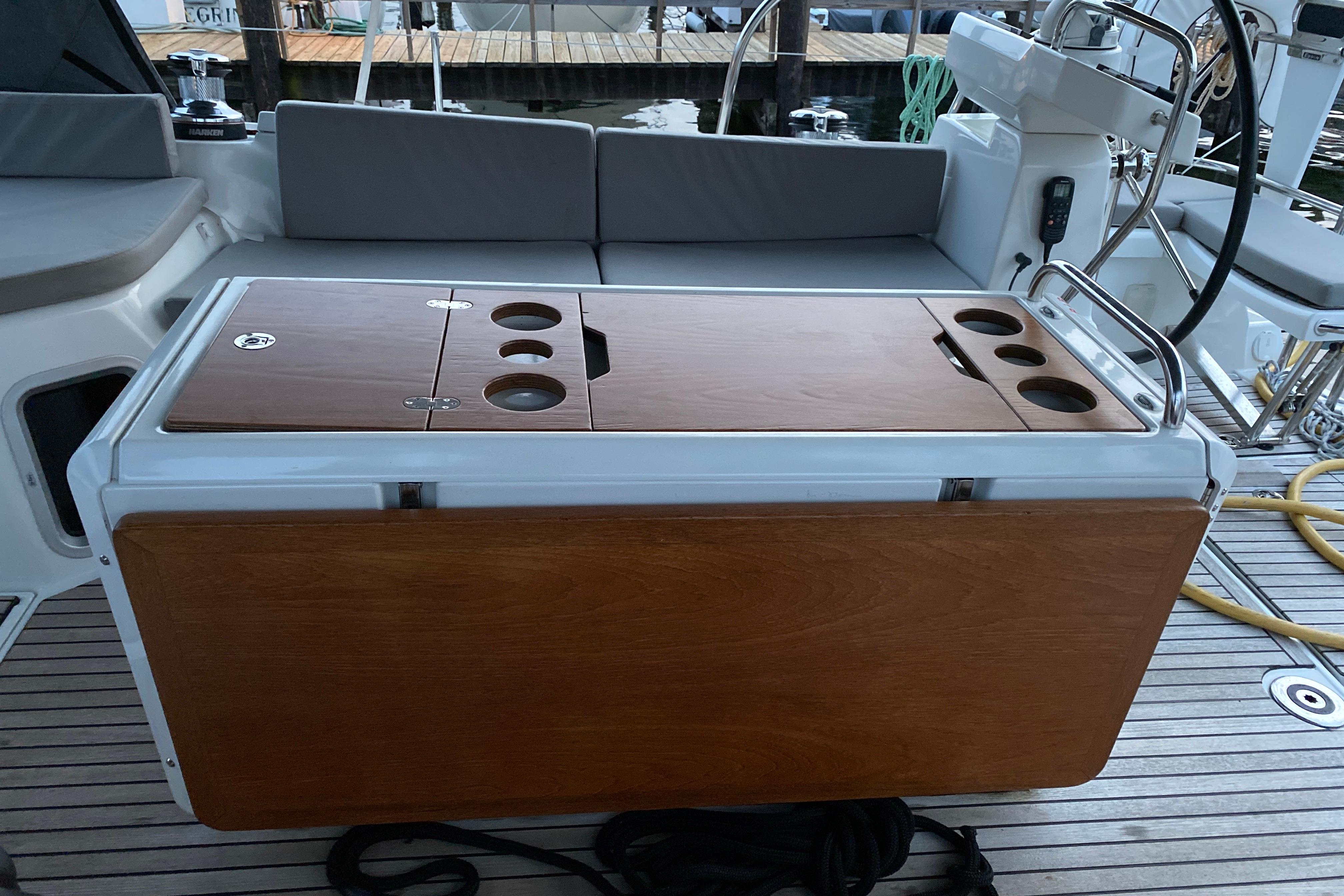 Dining Area with seating for 6 persons, large cockpit varnished teak table