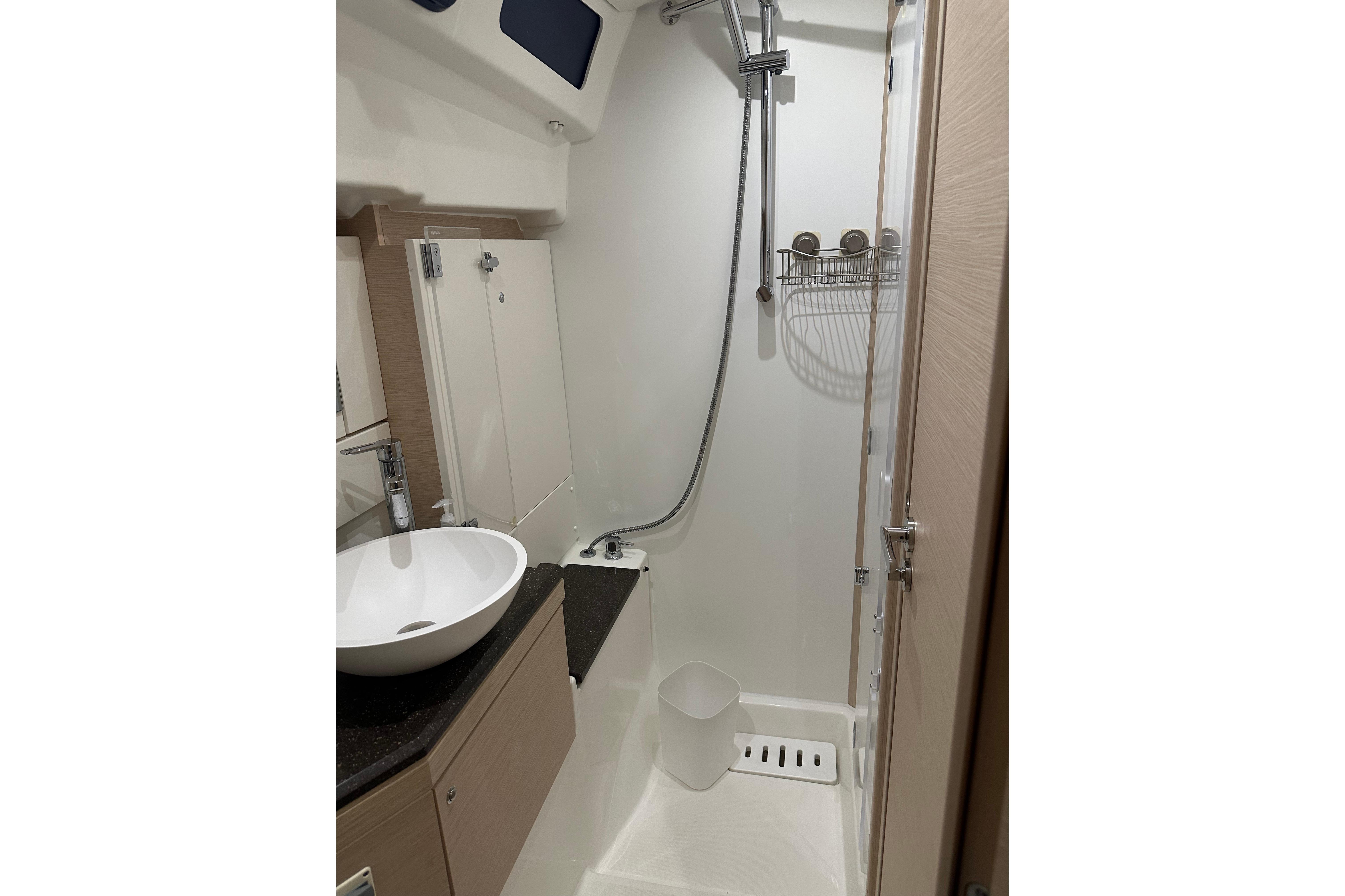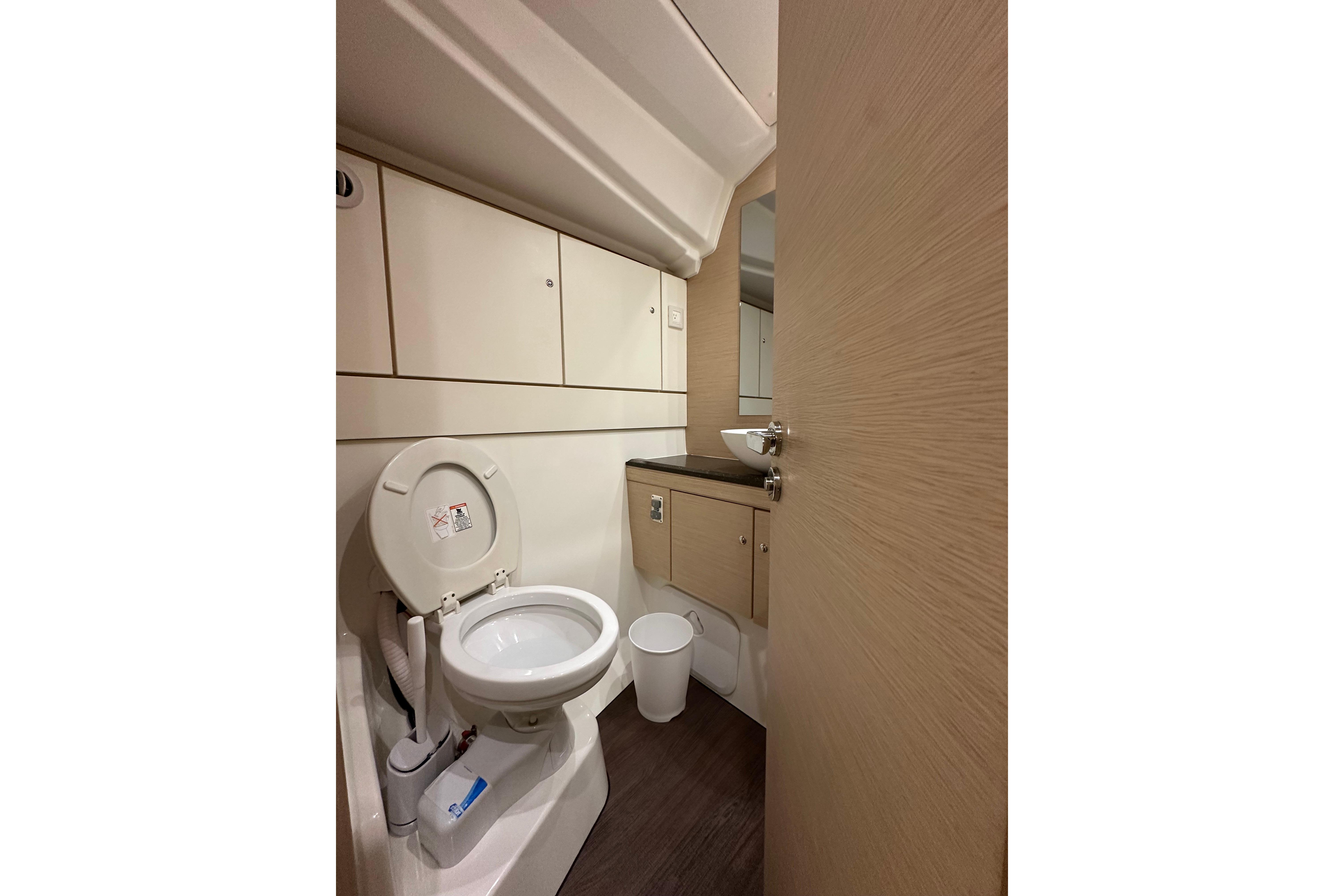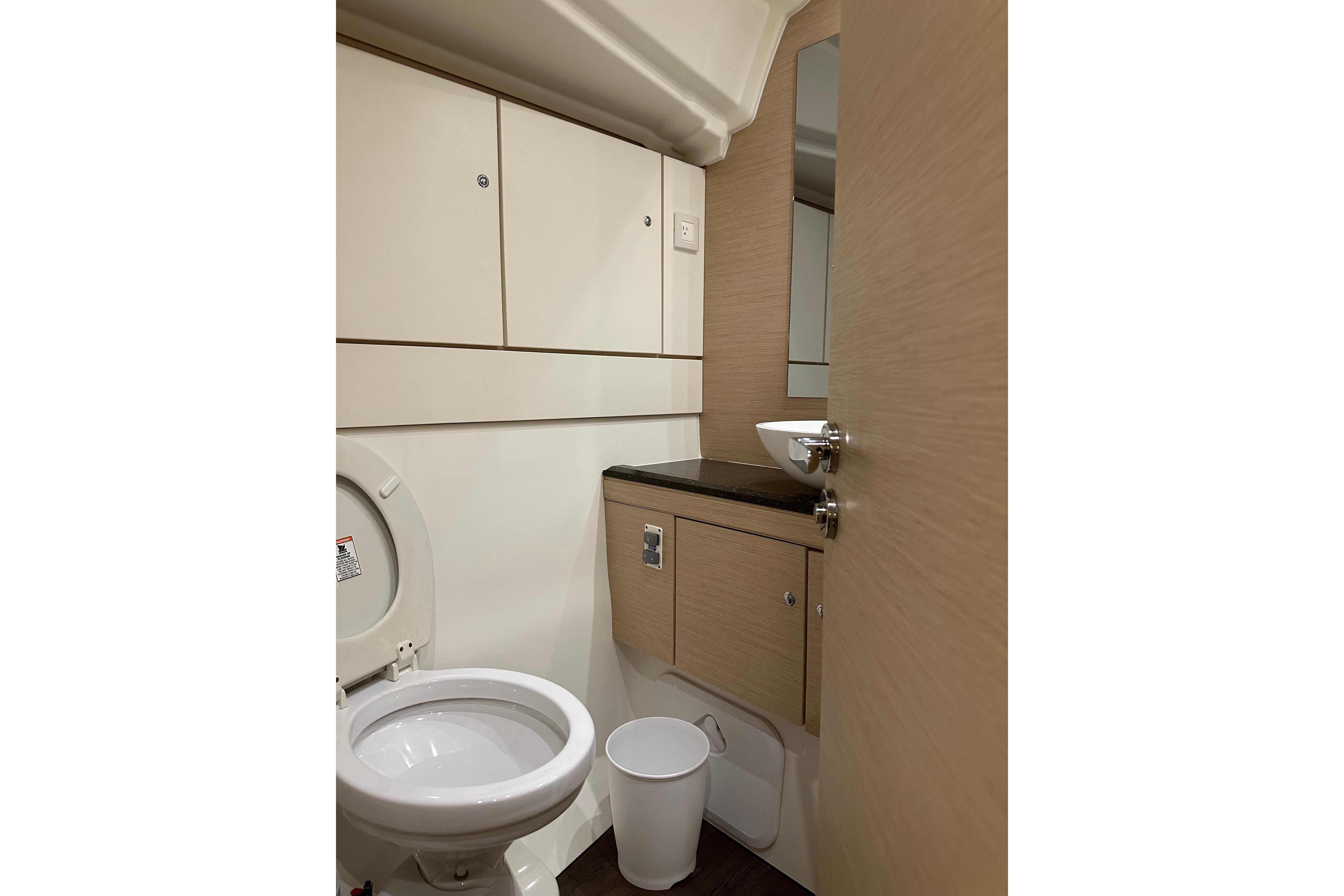 Forward is the master cabin with a 7' queen innerspring mattress with a seat on either side. Two hanging lockers with drawers below, lockers along each side of the berth, and large drawers below the berth provide ample storage. There are two hull ports and two large deck hatches for ventilation and light overhead. There is an en-suite head with an overhead hatch. It features a quiet flush electric Jabsco toilet and a standing shower separated by a Perspex door and Corian® shower seat.