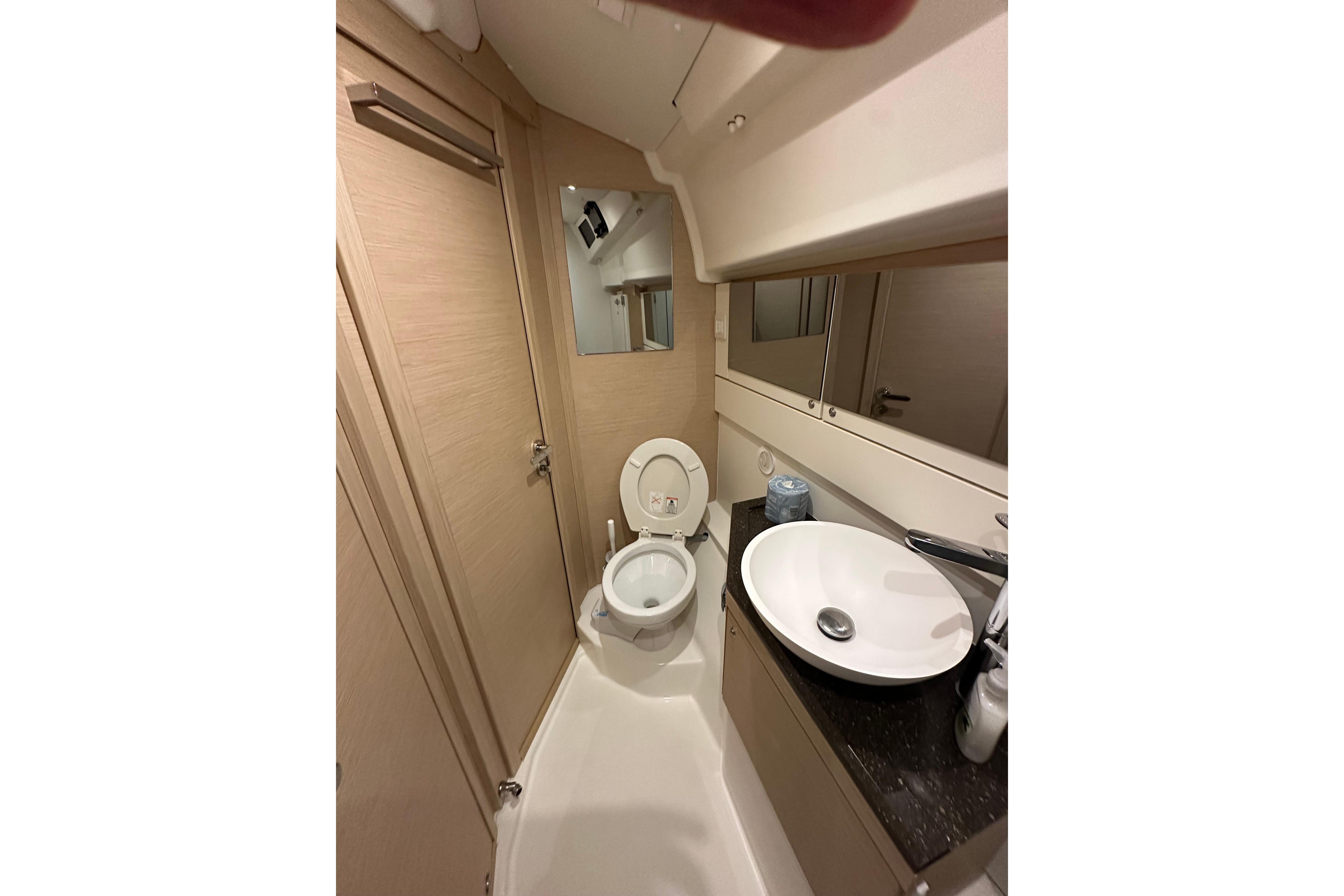 A comfortable forward facing nav station with large chart table is found on the port side of the saloon. The VHF, Fusion stereo, tank and battery monitors, and electronic control panels are within easy reach. Aft of the nav station is a head with an electric quiet flush Jabsco toilet and separate shower. The head has doors to both the salon as well as to the aft VIP cabin.