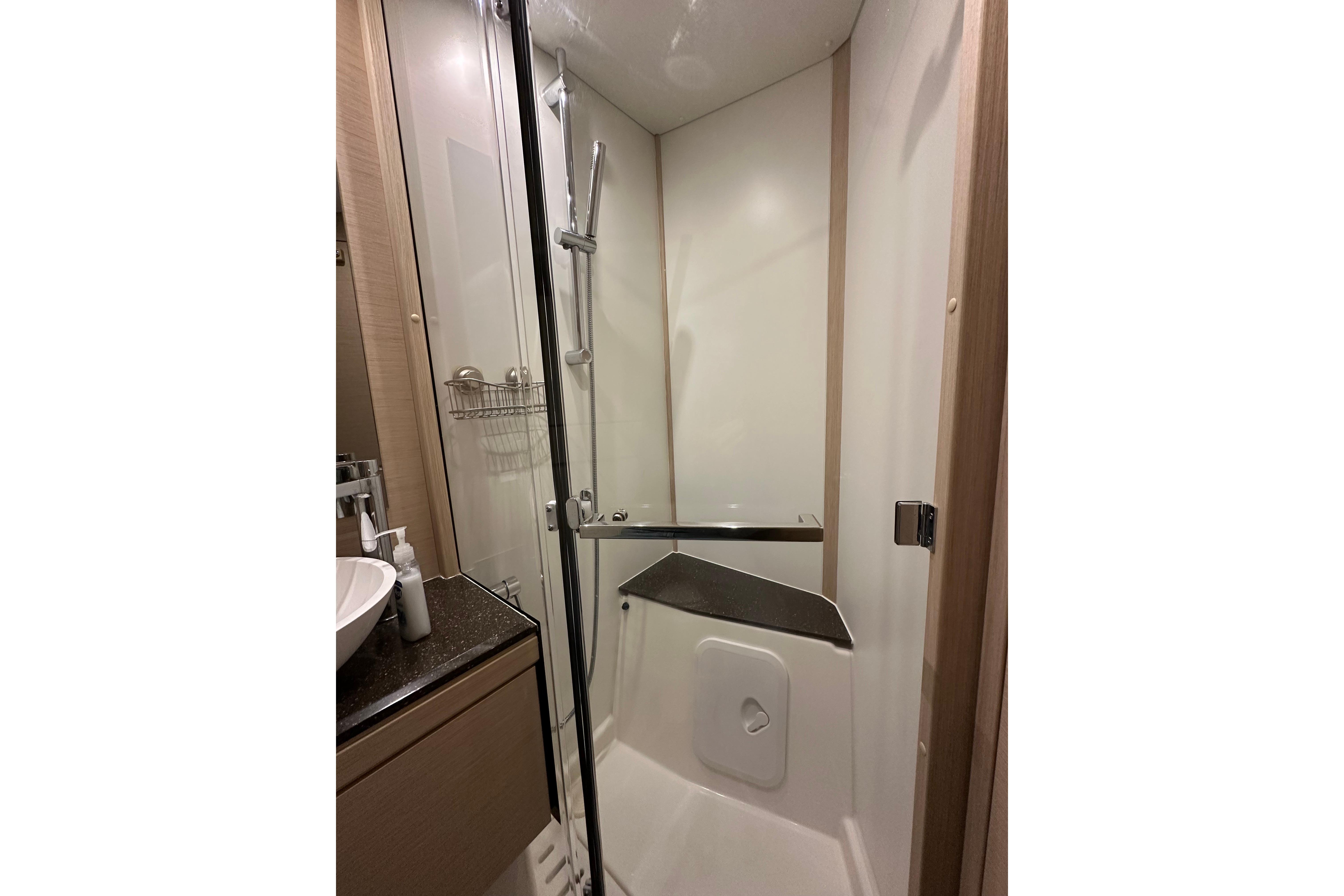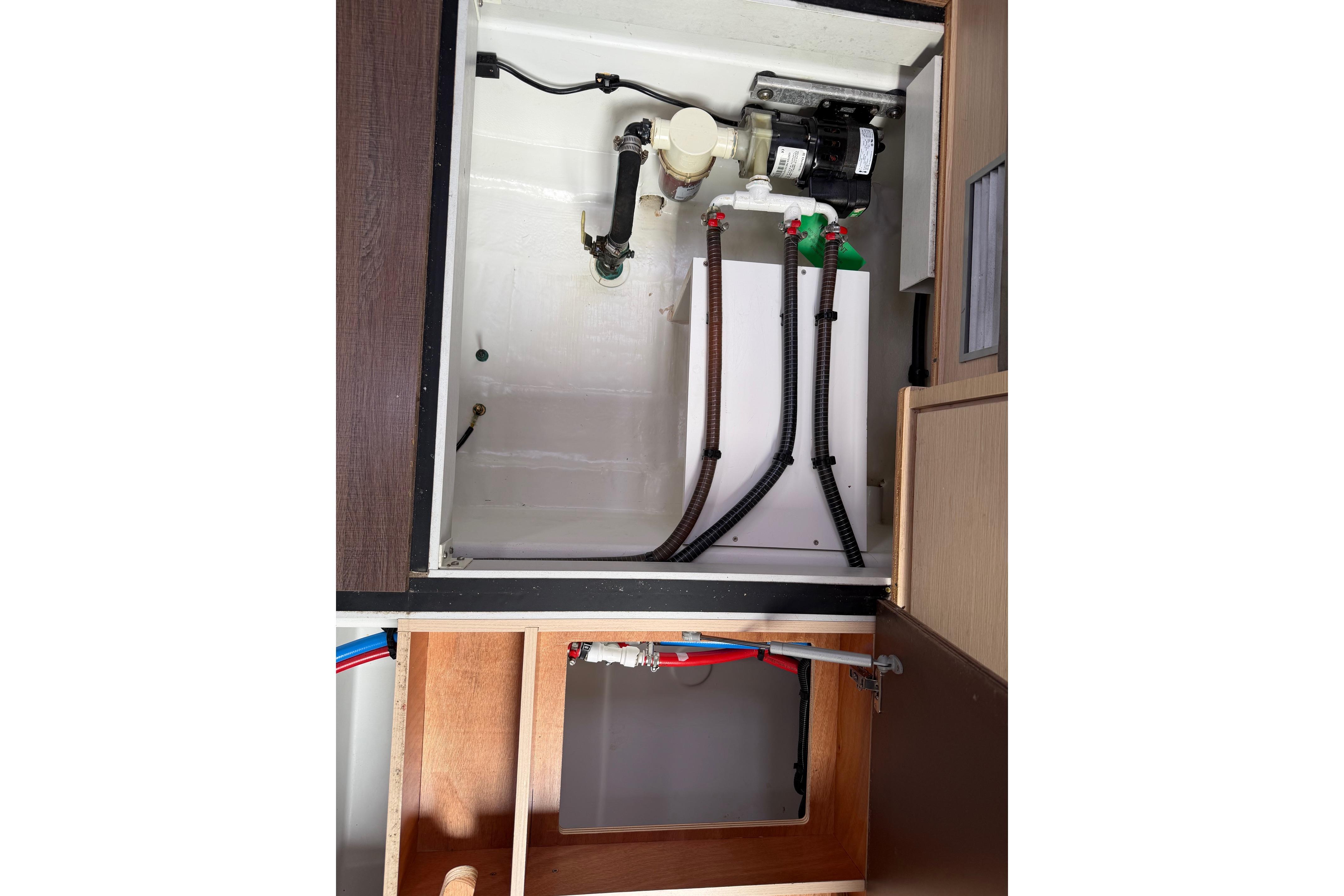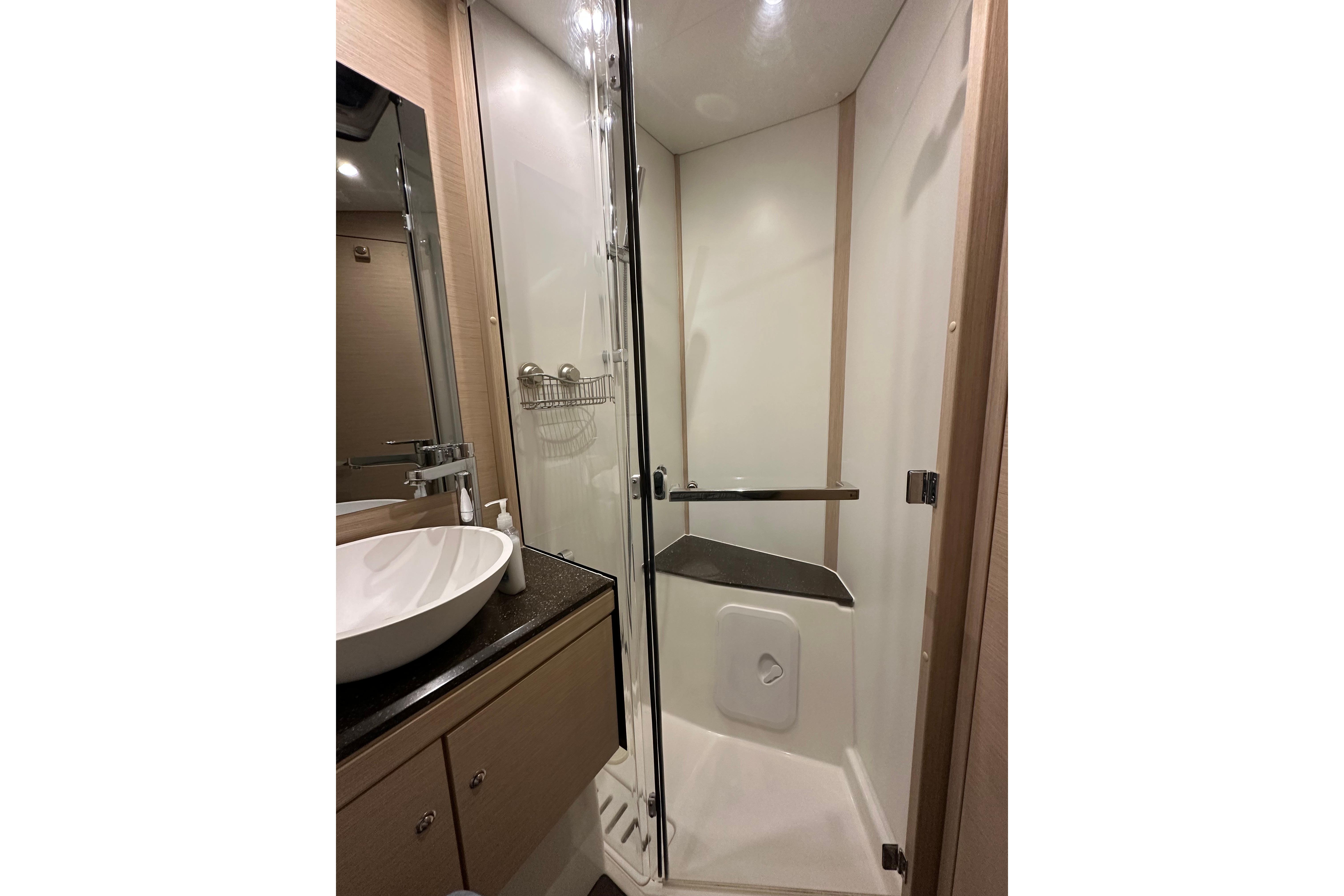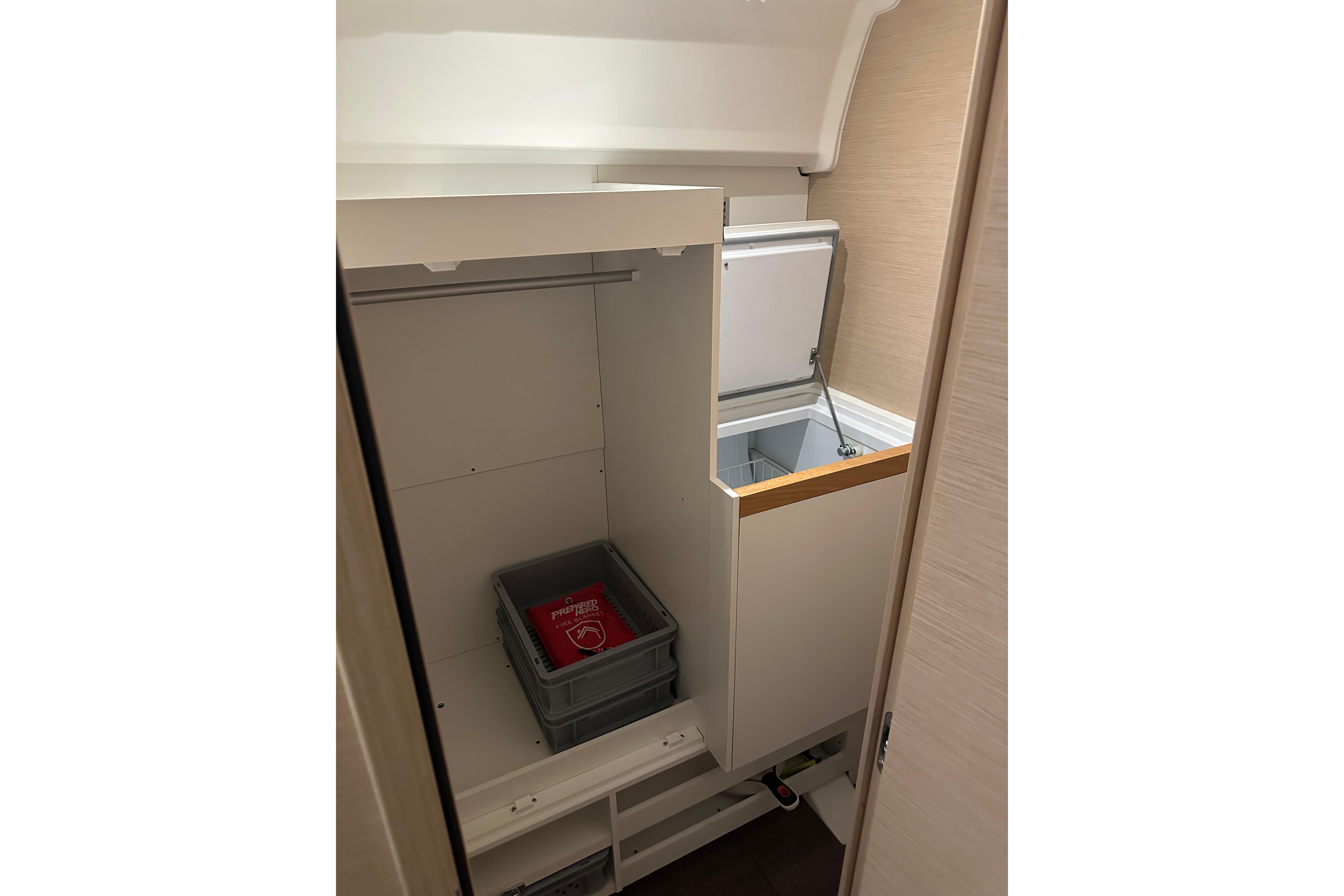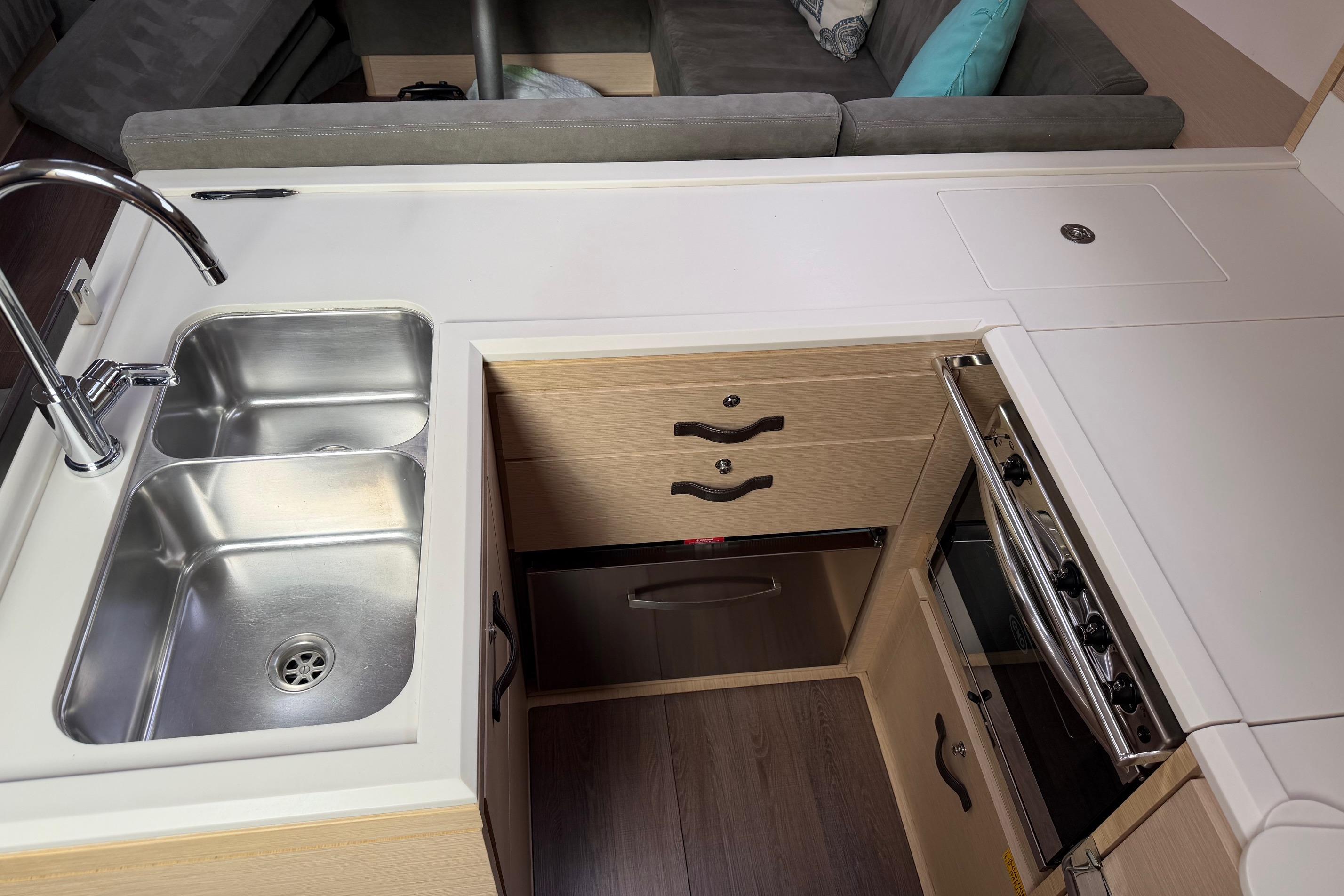 On the starboard side of the salon there is a large U-shaped galley with Corian® countertops. There are double stainless steel sinks with covers. Soft close fully extending drawers and multiple lockers provide ample storage space. There is a waste bin integrated into the countertop. A 3 burner Eno stove with oven and an overhead recirculation extractor hood. There is a sliding Corian cover over the cooker for more counter top space. There is a microwave oven. A new (2024)130L / 34 US Gal combination 12V fridge/freezer and a 115V Freezer drawer with ice maker provide excellent storage. Aft of the galley is a utility room with another refrigerator and space for a washing machine or food storage.
