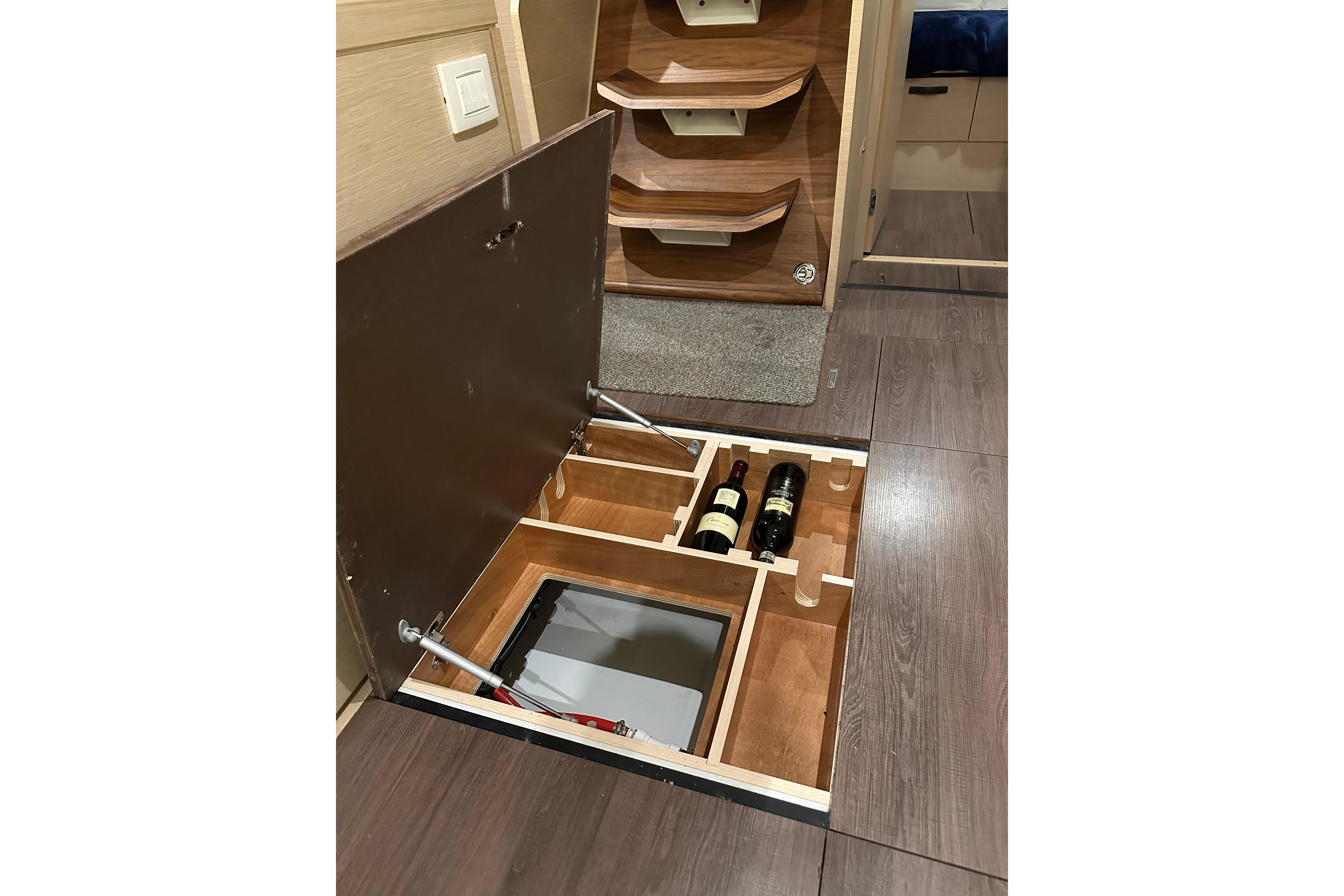 The roomy saloon has a large L-shaped settee to starboard with a folding table that can seat 8 and lowers electronically to form a queen size berth. To port is a settee that doubles as a sea berth. There is a good view of the sea through hull ports. All upholstery is in stone grey alcantara. There is a retractable 32” TV behind the settee. 4 Large Fixed Hull Ports and 4 Opening Low Profile Hatches provide ambient light and ventilation. All windows have shades and hatches have shades and bug screens. There is a wine cellar under the floor with gas-lifter assisted opening and a second wine storage area forward of the settee. The space is illuminated with both direct and indirect LED lighting.