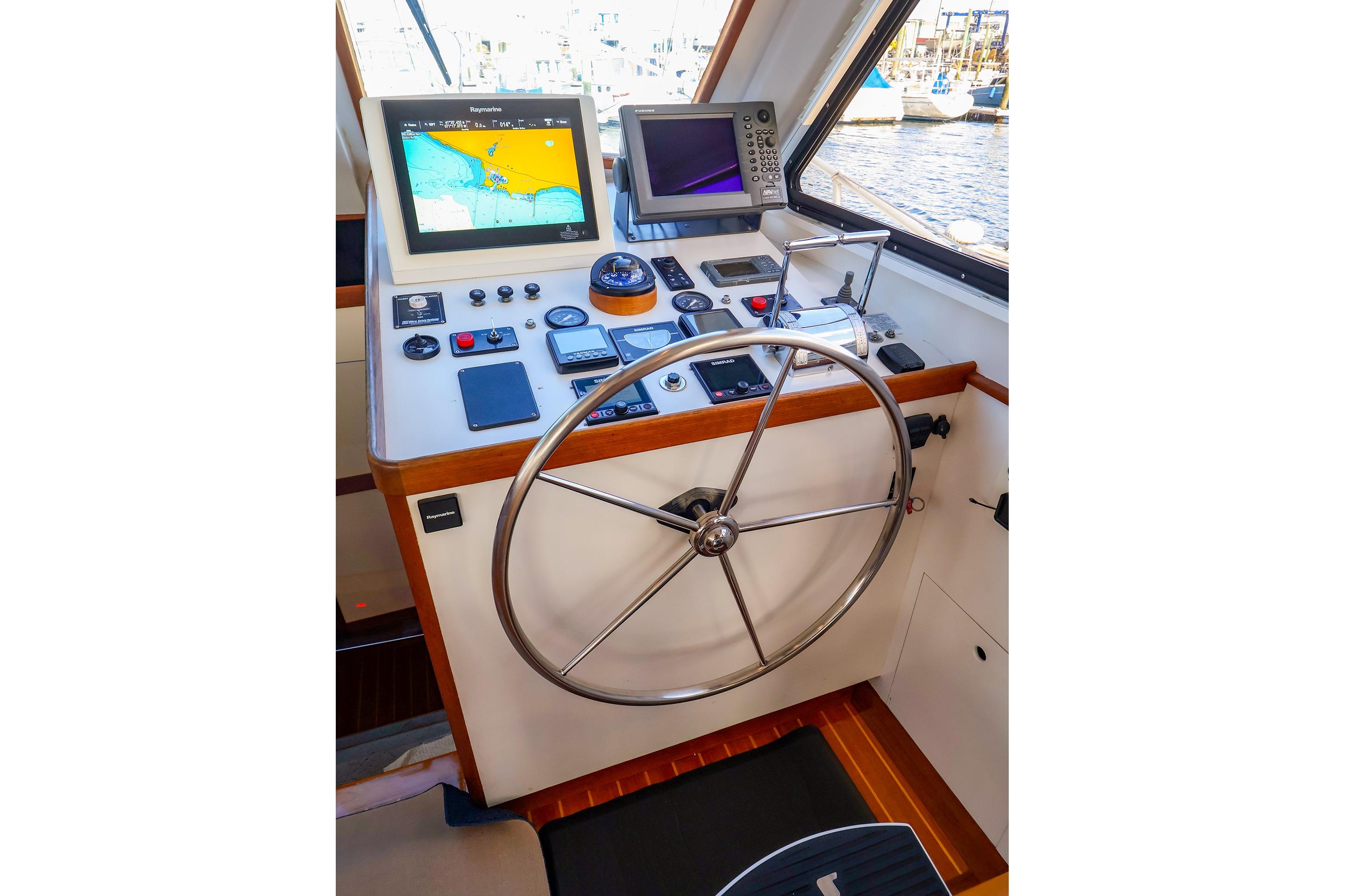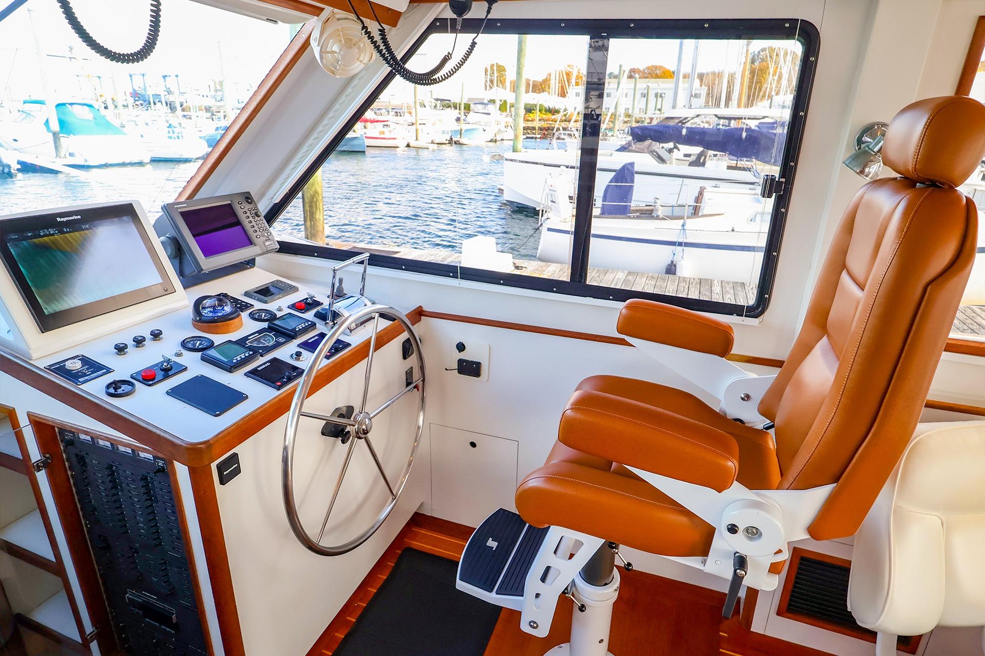 Two steps up through the large aluminum sliding door you enter the fully enclosed 6'8" height bridge deck. You will enjoy a fully equipped helm station to starboard with a NEW fixed brown leather fully adjustable Stidd helm chair. Further aft are twin fixed captains chairs with entertainment console in-between, while across to port is a full length settee that coverts into a double-berth 51"x78" with coffee table that raises and folds out to convert to a dining table for (6) six. A large flat screen TV drops down from the starboard overhead. The exterior views through the large windows are unencumbered.
