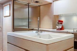 Fresh from a substantial interior refit, the modern teak finishes, expansive saloon, and light–filled cabins create a soothing sanctuary at sea. Her four-cabin layout, including a spacious Owner suite forward, offers comfort and privacy for up to nine guests, while a separate crew aft accommodates up to five crew in three cabins.