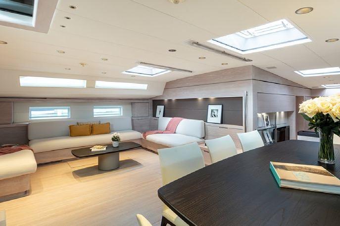 On deck, her generous cockpit is designed for both relaxation and control. Twin helms, elegant sunbathing spaces, and a fold-down transom that transforms into a swim platform make her ideal for both spirited sailing and idyllic anchorages.