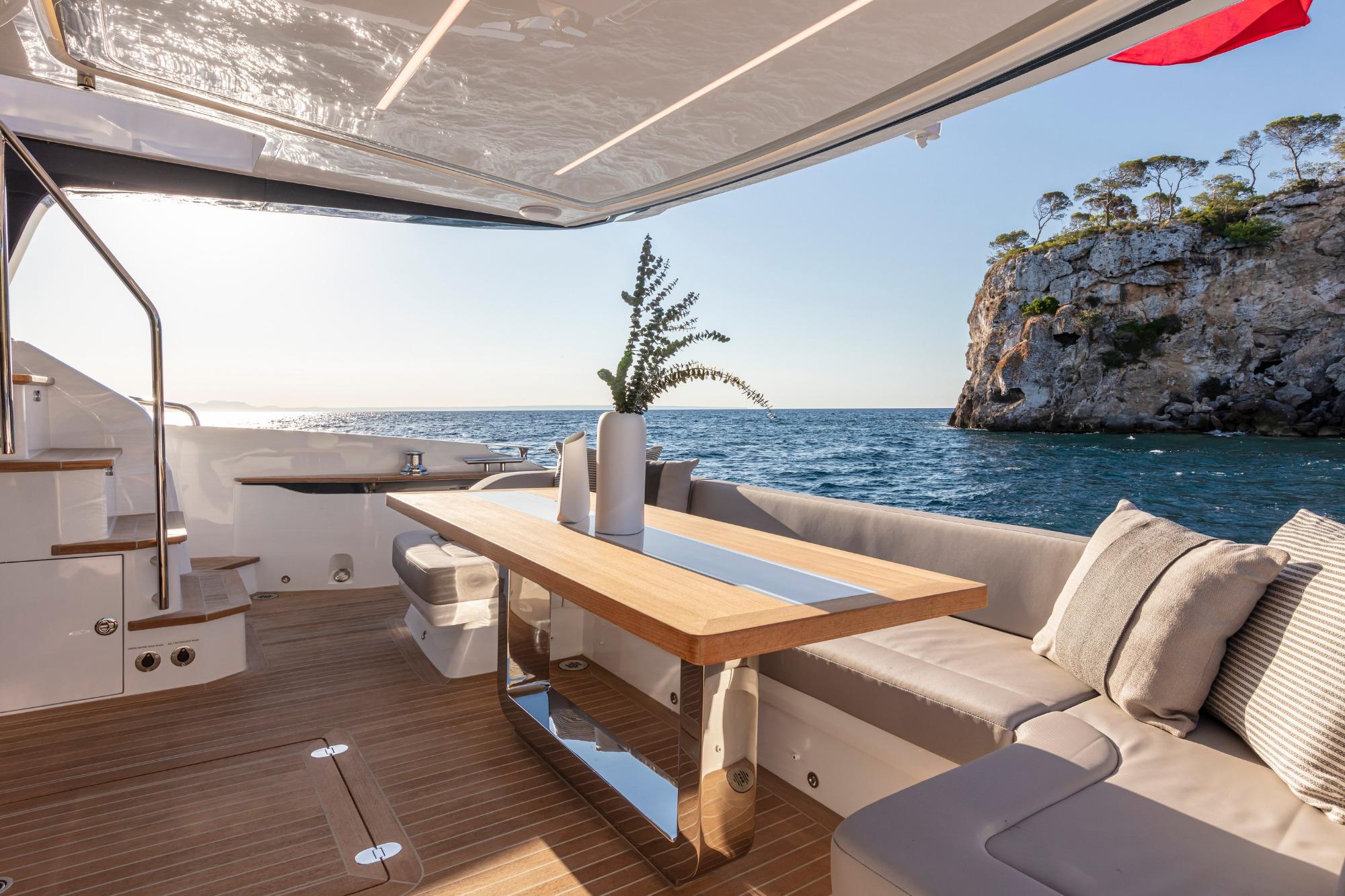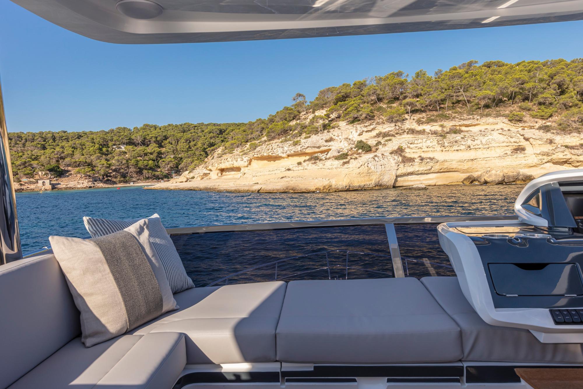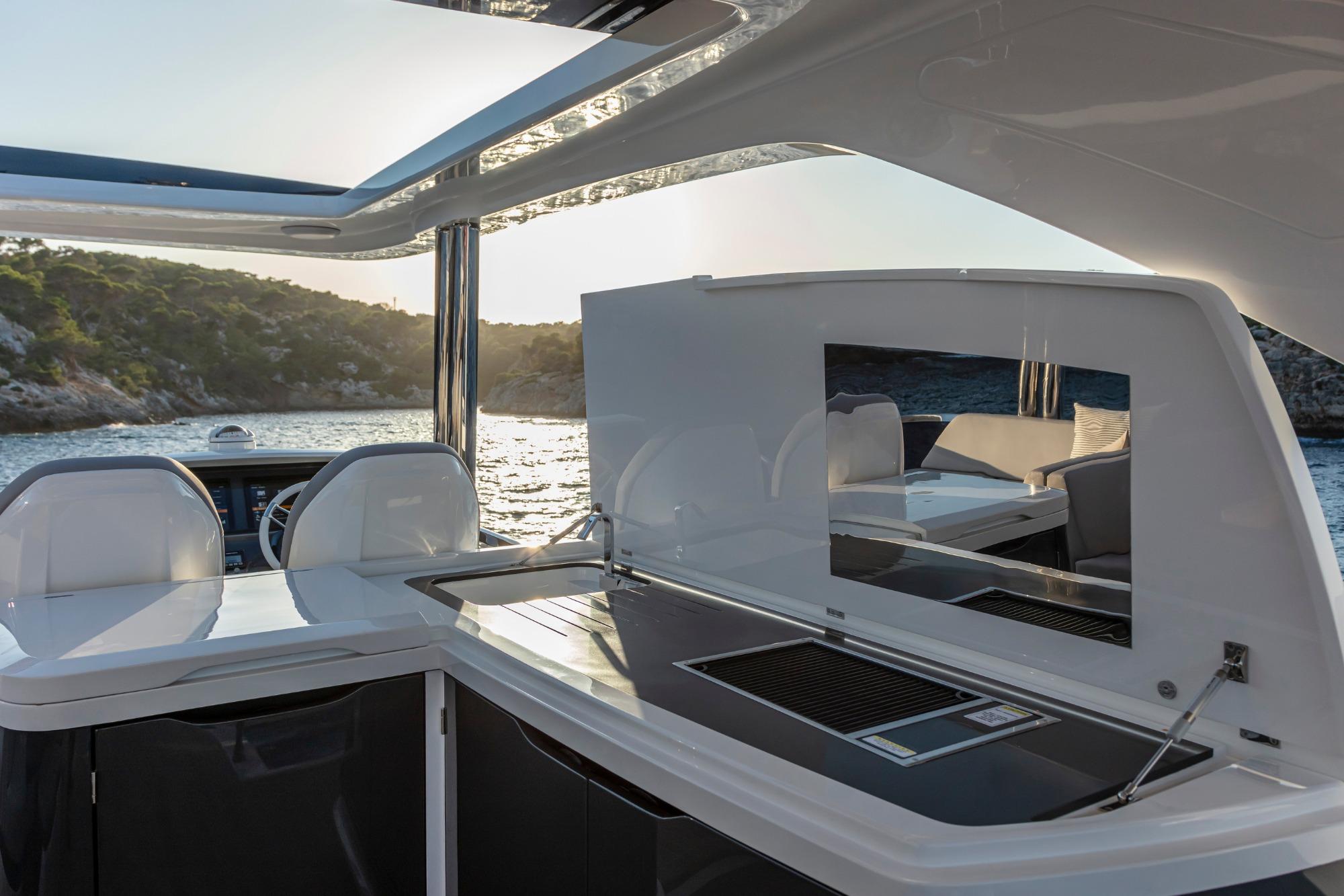 • Gelcoat coloured detailing on flybridge, hardtop, cockpit, and foredeck in silk grey & dark grey.