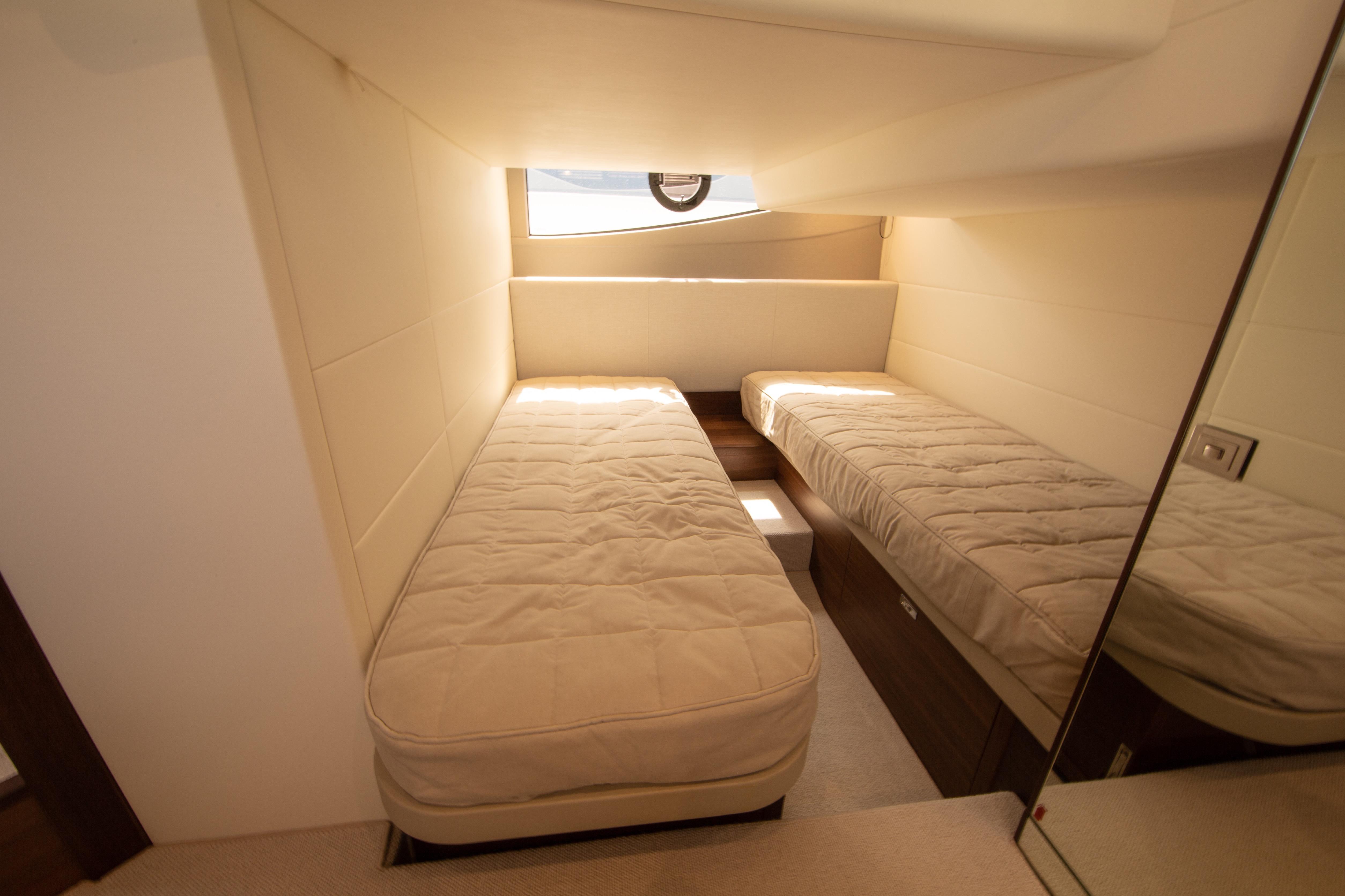 Inside, the V40 reveals a spacious and bright saloon, a modern galley, and two stylish cabins. The forward cabin features a private en-suite bathroom with secondary access from the saloon, while the aft cabin offers twin berths that can convert into a double when needed.