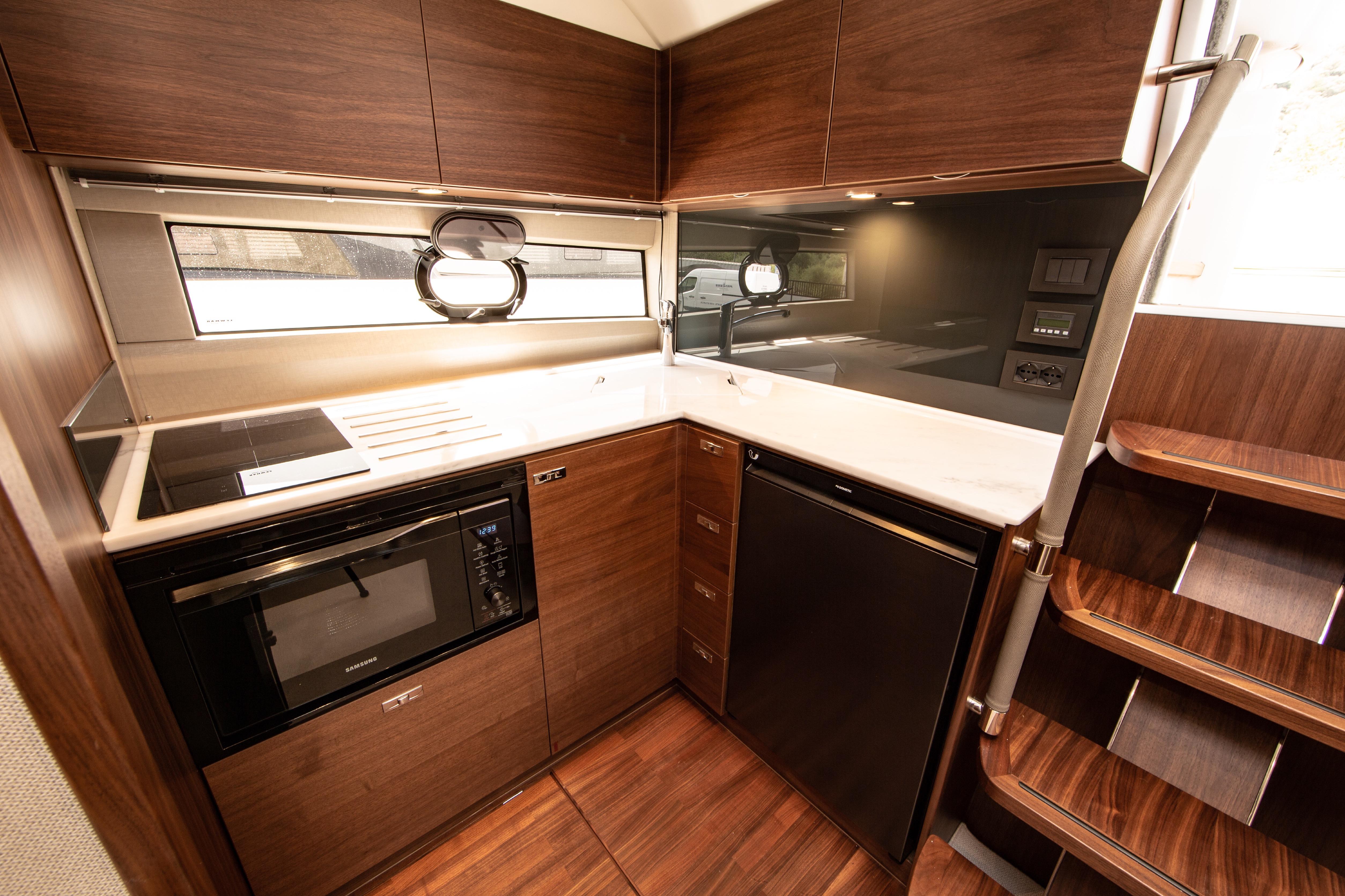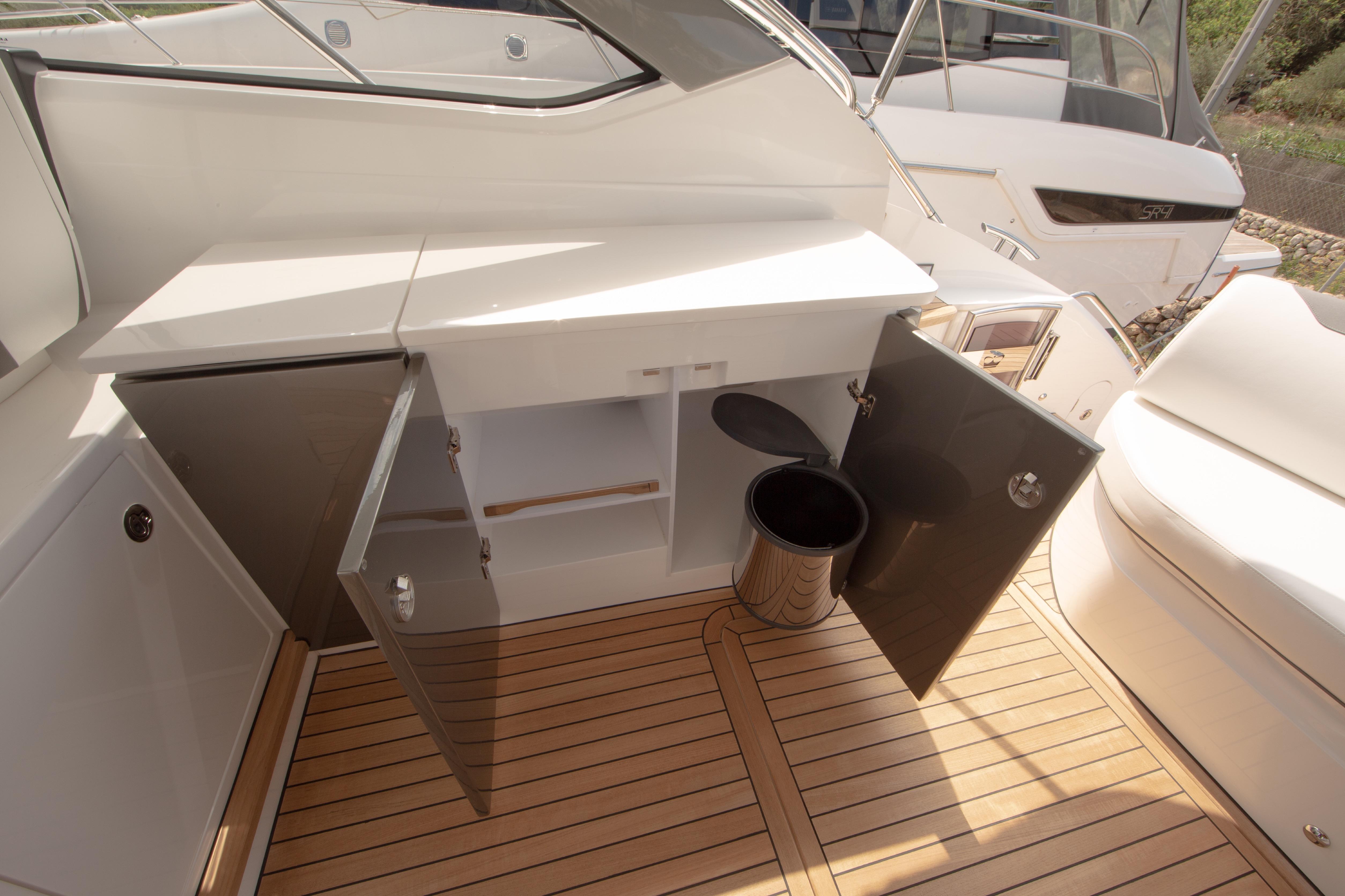 The cockpit is designed for entertaining, with a U-shaped seating area, teak table, and a wet bar equipped with a sink and refrigerator. An electric sunroof and a swim platform provide easy access to the sea, while premium onboard equipment ensures an uncompromising experience.