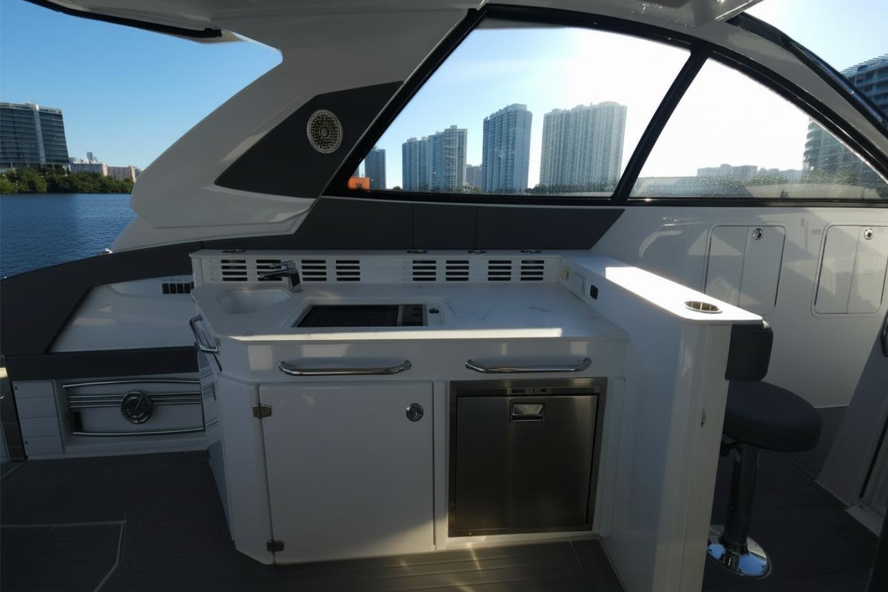The signature fold-down beach door instantly transforms the cockpit into an expansive, open-air lounge perfect for entertaining. The wet bar, electric grill, refrigeration, and U-shaped seating ensure that every guest is comfortable and engaged.