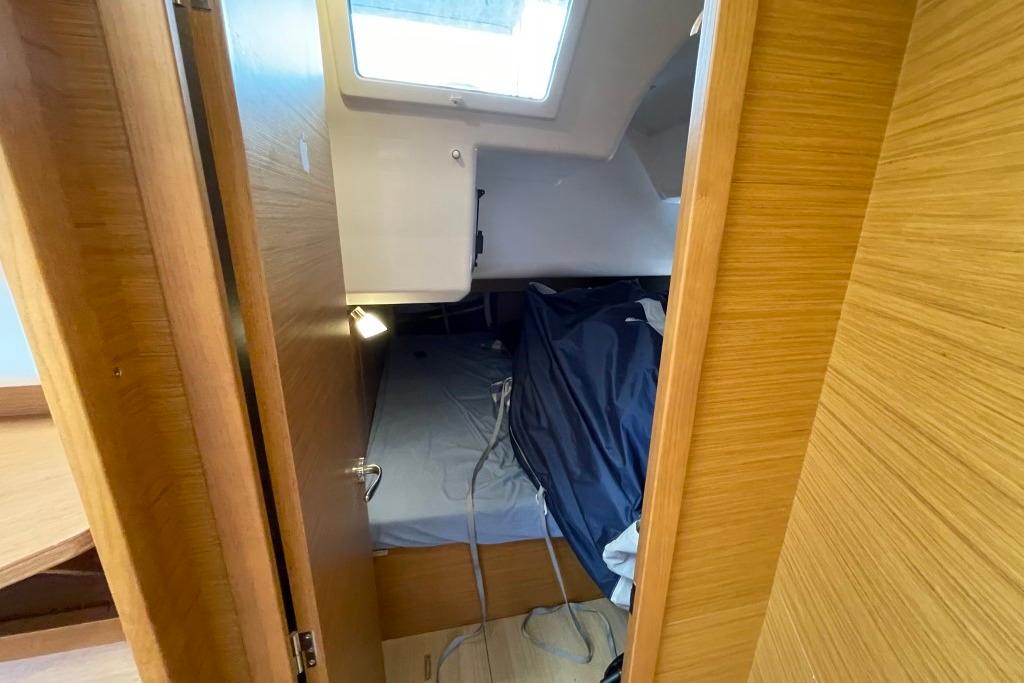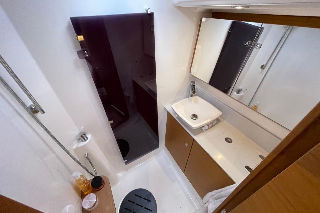 The interior offers a bright and comfortable atmosphere. The forward master suite includes a central double bed, plenty of storage, and a private bathroom with separate shower. The saloon features a central dining table with surrounding sofas, a long portside sofa, navigation area and generous storage. The mid-ship galley is fully equipped with stove and oven, refrigerator, double sink, seawater pump and freezers. Aft, two double cabins share a full bathroom with separate shower.