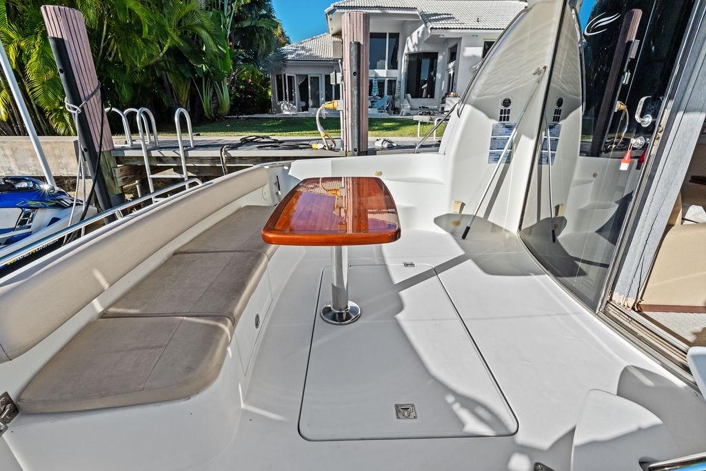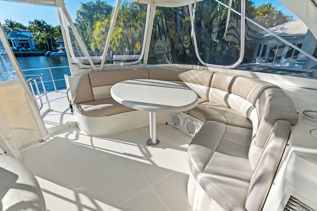 The flybridge is a major highlight with tons of seating, great sightlines, upgraded electronics, and space to relax or entertain.