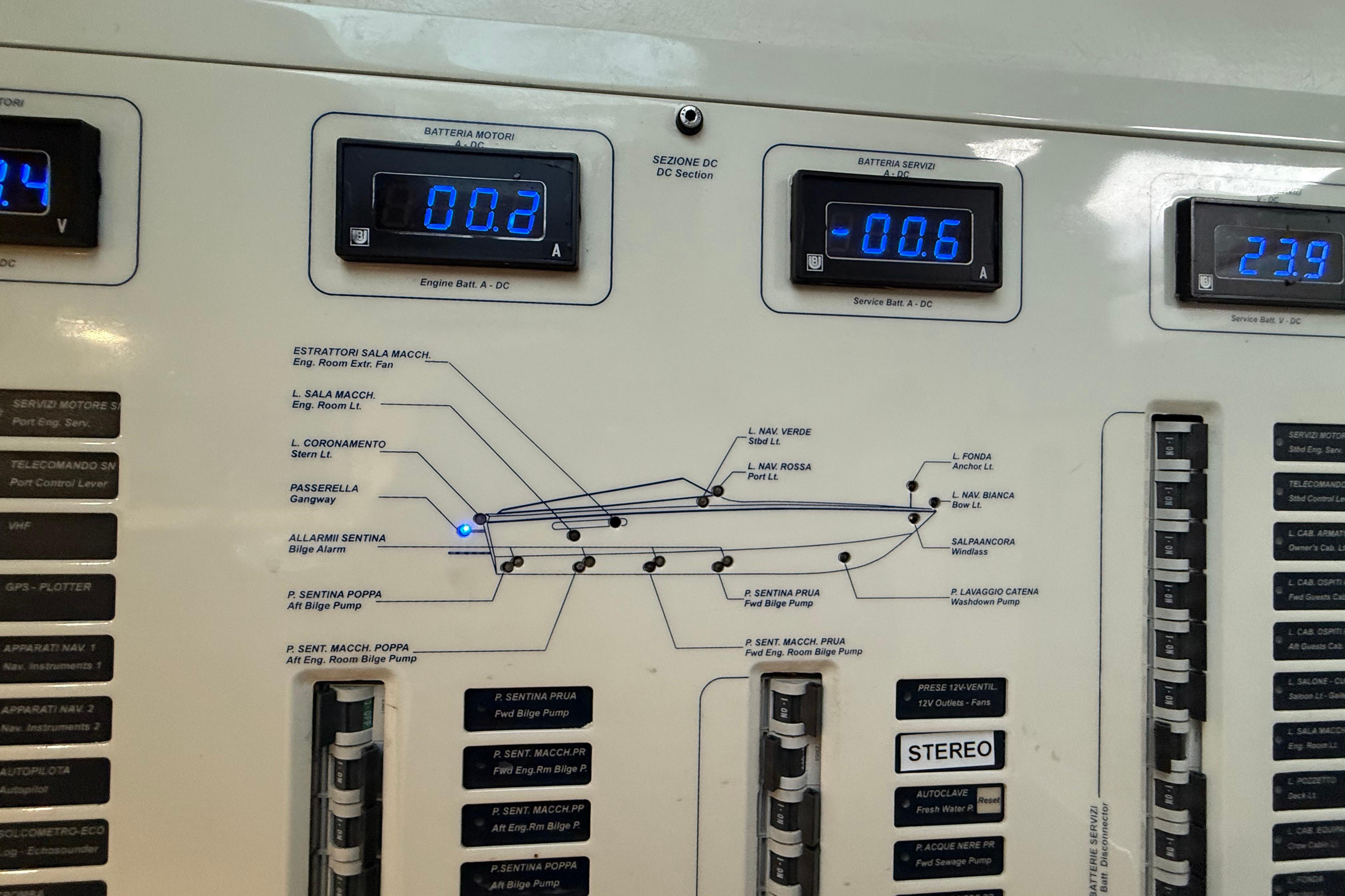 Horn, Bow thruster, Hydraulic gangway, Electronic speedometer, LED and halogen courtesy lights, Underwater lights, Ceiling light under the awning, Battery charger, ONAN 12kW generator, New generator electronic board (2025), 8 x 100 Ah batteries, 2 x 800 hp MAN engines, New shaft and propellers (2025), New through-hulls