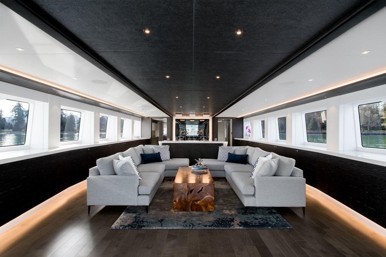 Natural light floods the interior through the yacht’s large panoramic windows, highlighting the clean, modern design and refined craftsmanship. High-quality joinery, luxurious fabrics, and tasteful soft furnishings create an inviting and sophisticated atmosphere throughout.