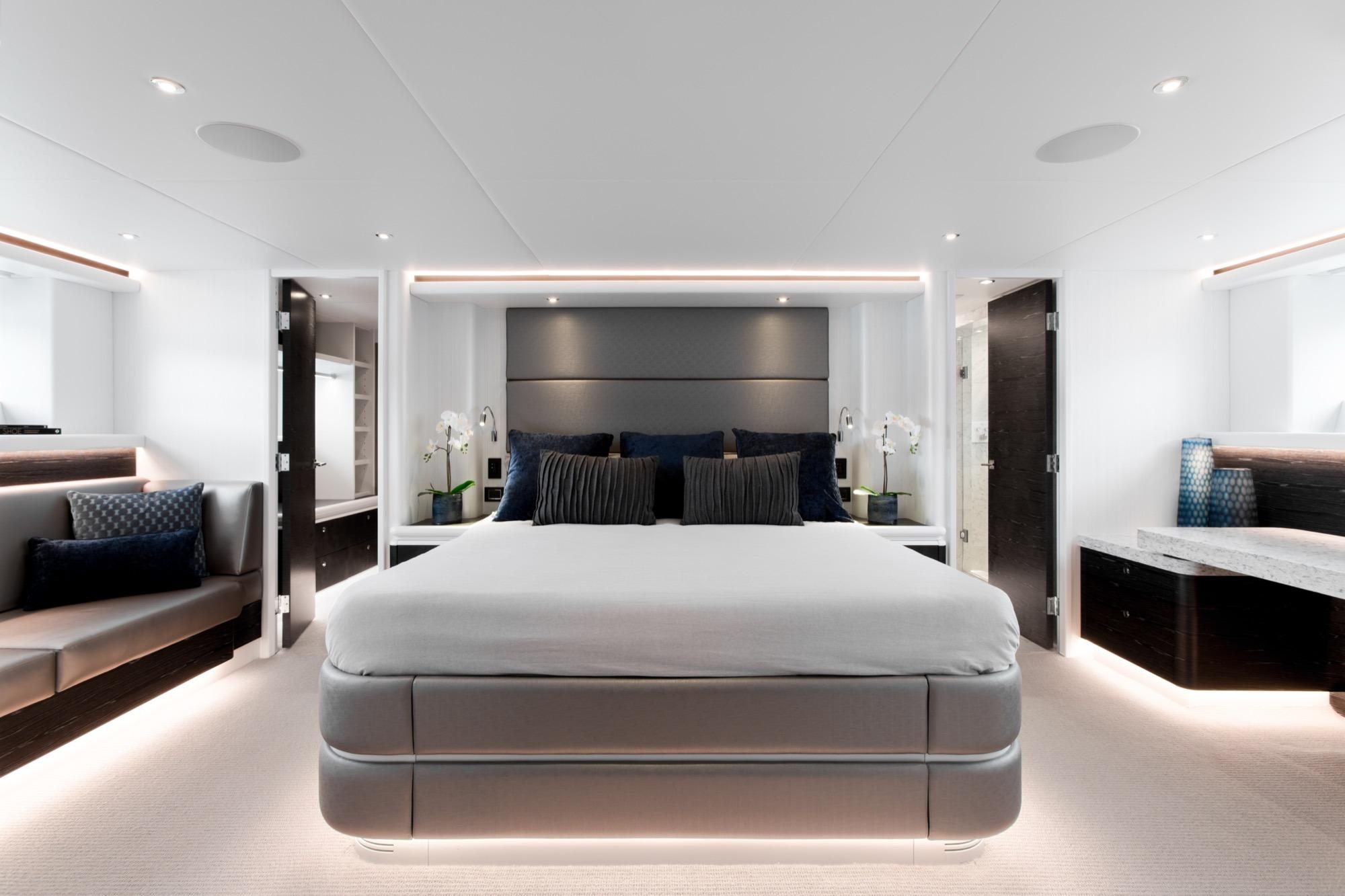 Full beam main deck master stateroom with walk around king berth, bedside USB charging, Crestron lighting, 56" Samsung TV with surround sound, quartz desk, seating area, and large cedar-lined walk-in wardrobe. Ensuite features dual Grohe faucets, Kohler sinks on quartz, Headhunter toilet, and Grohe Smart Thermostat shower with rainfall head, glass door, and seating area.