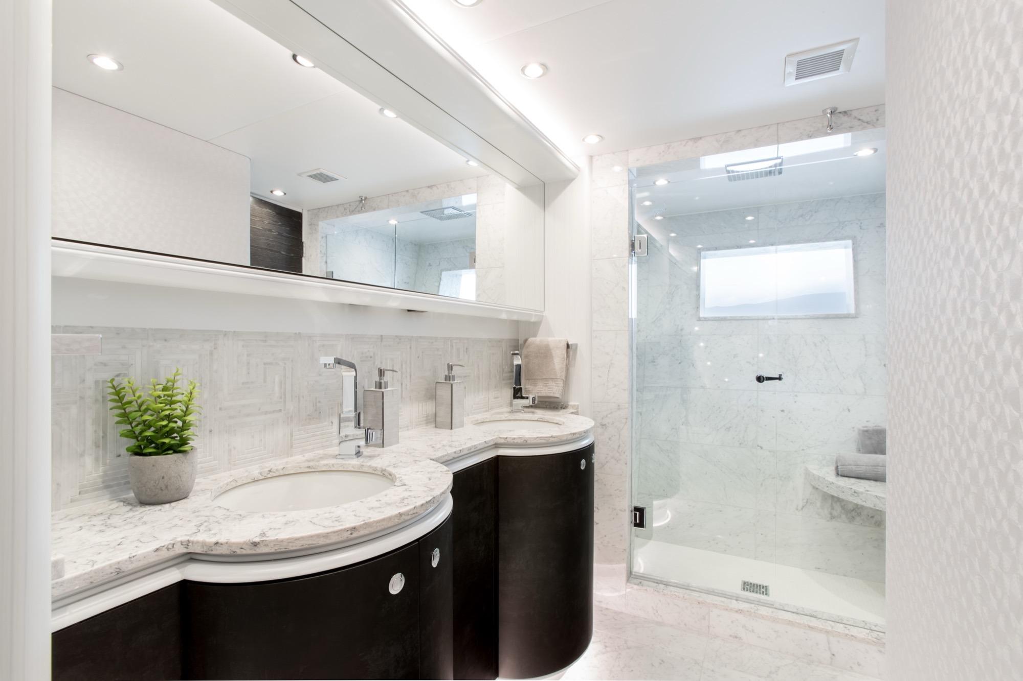Twin berths with reading lights, 24" Insignia TV, Hunter Douglas blinds, and Dometic climate control. Ensuite with Grohe and Kohler fixtures, quartz counter, Headhunter toilet, and shower with glass door and seating.