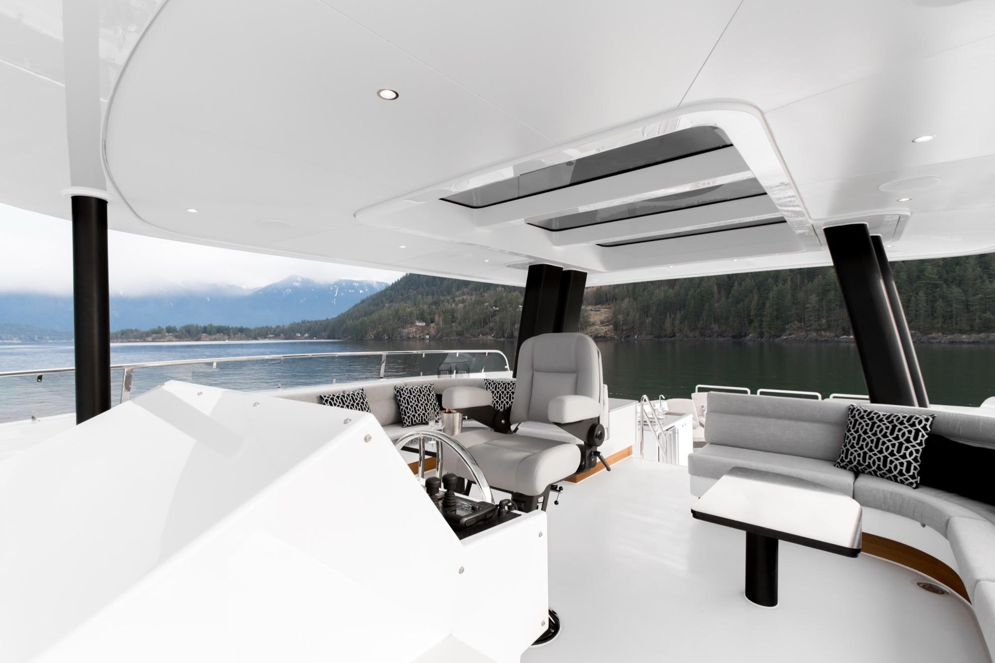 - Deck & Entertainment: Raised pilothouse with extra guest seating and wing stations; sundeck with Jacuzzi, lounging areas, BBQ, and tender storage