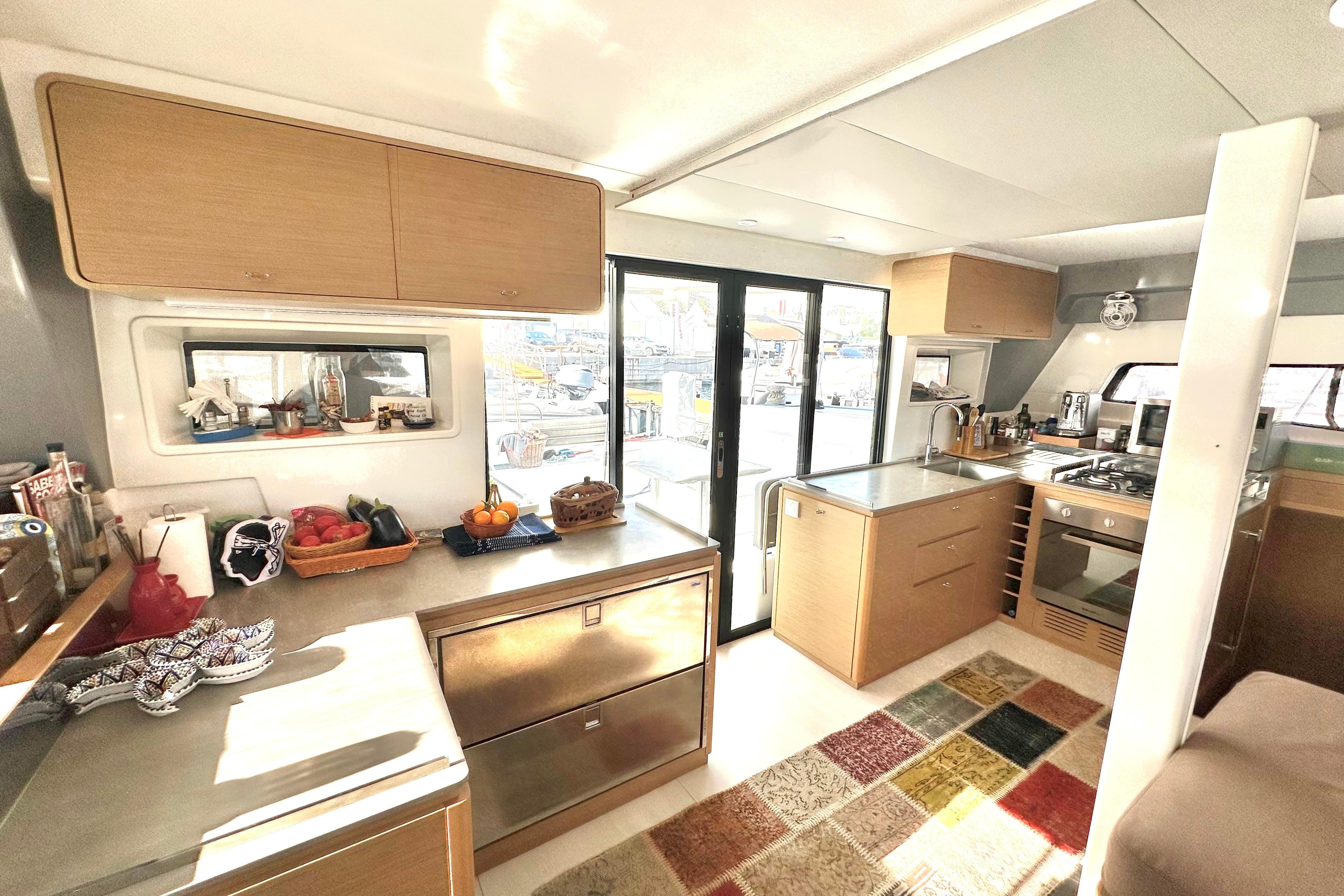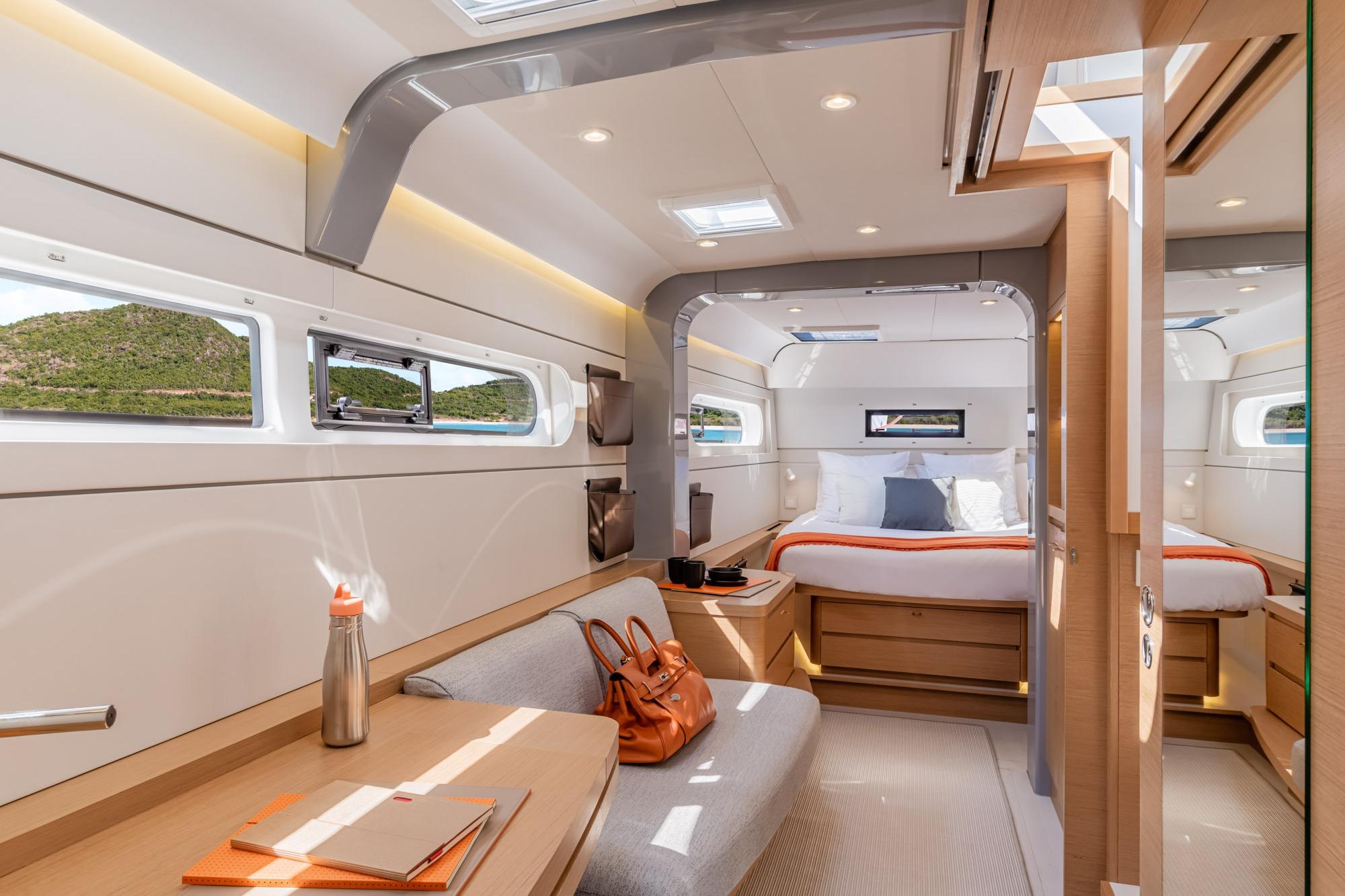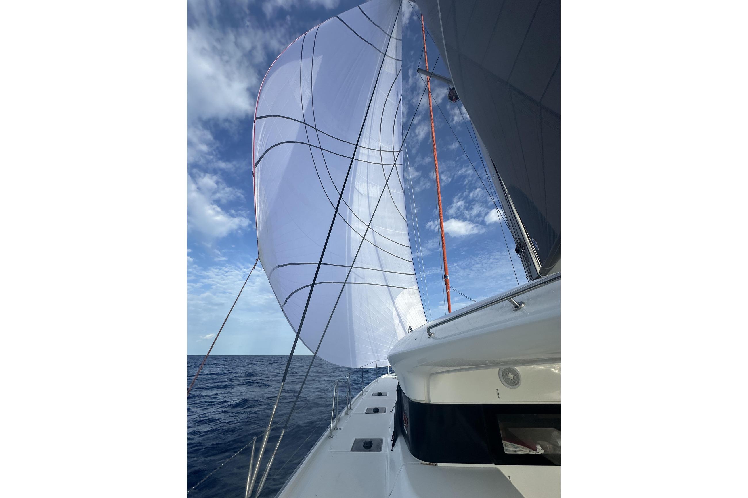 Her 25-meter mast supports a 125 m² sail plan for strong, responsive performance. Twin helm stations: one at the stern of each hull provide direct rudder control and clear visibility for precise handling.