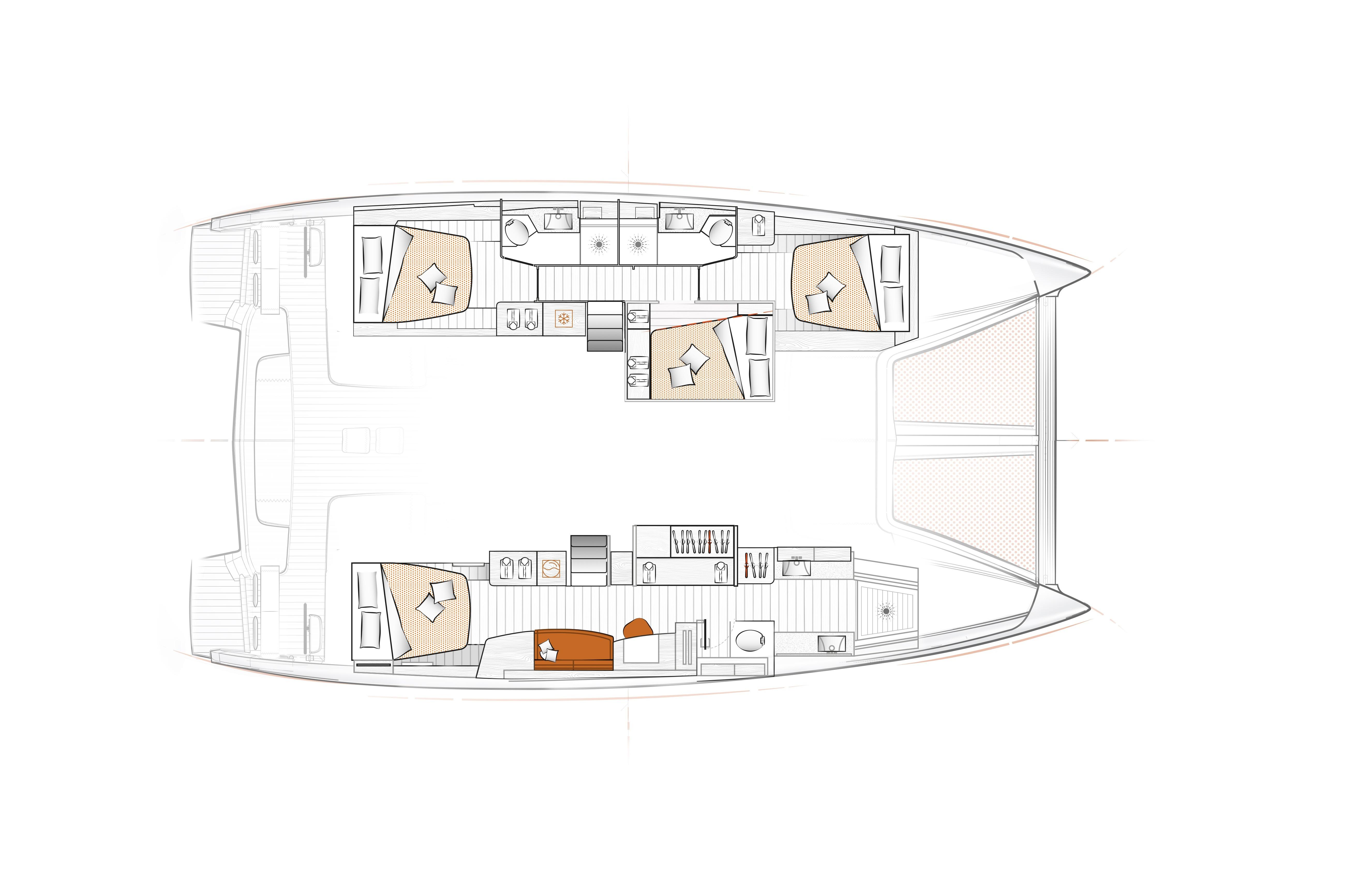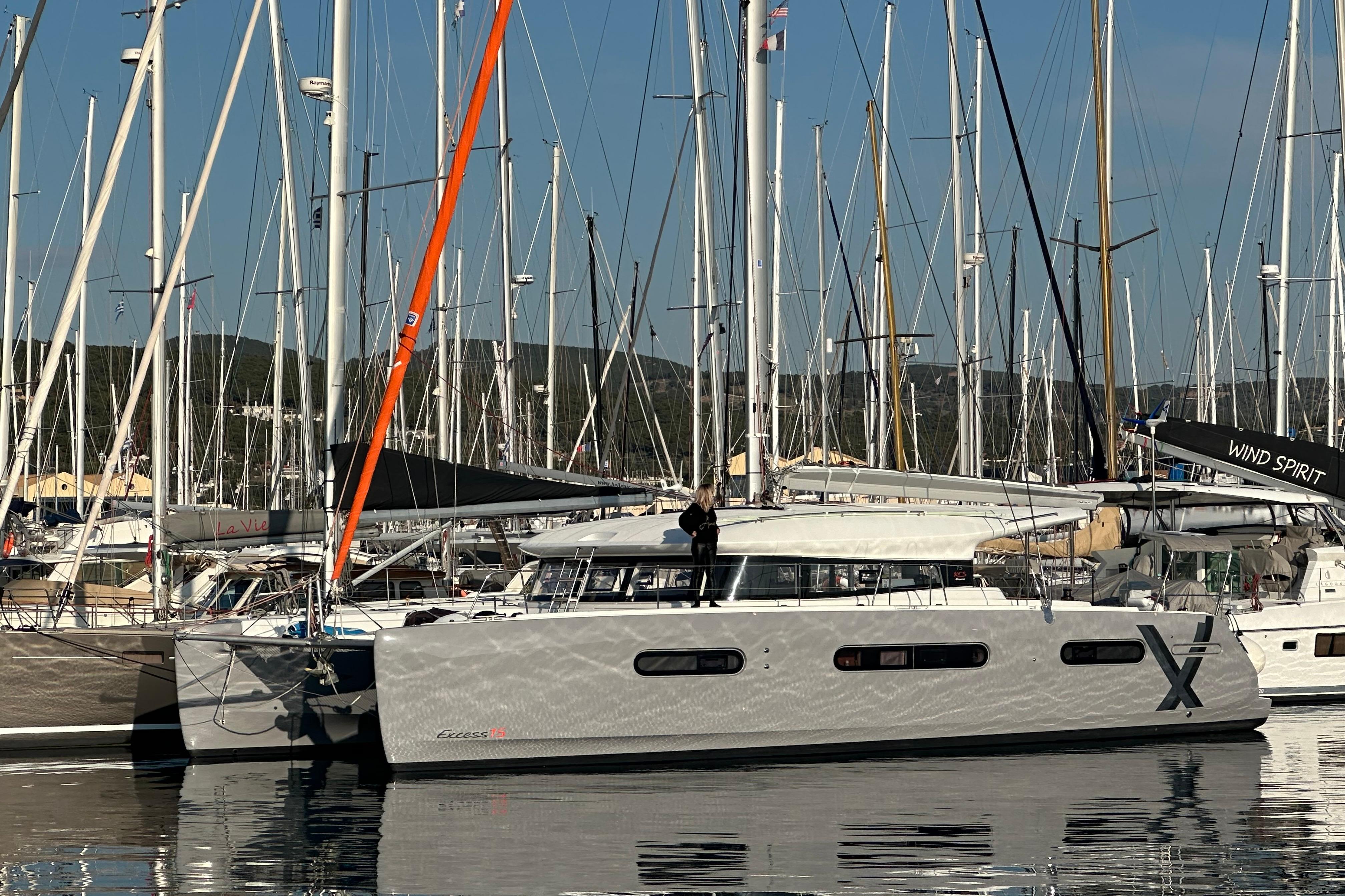 The hulls’ proportions and deck layout reflect Excess’s performance-oriented design, while maintaining the volume and stability expected of a modern cruising catamaran.