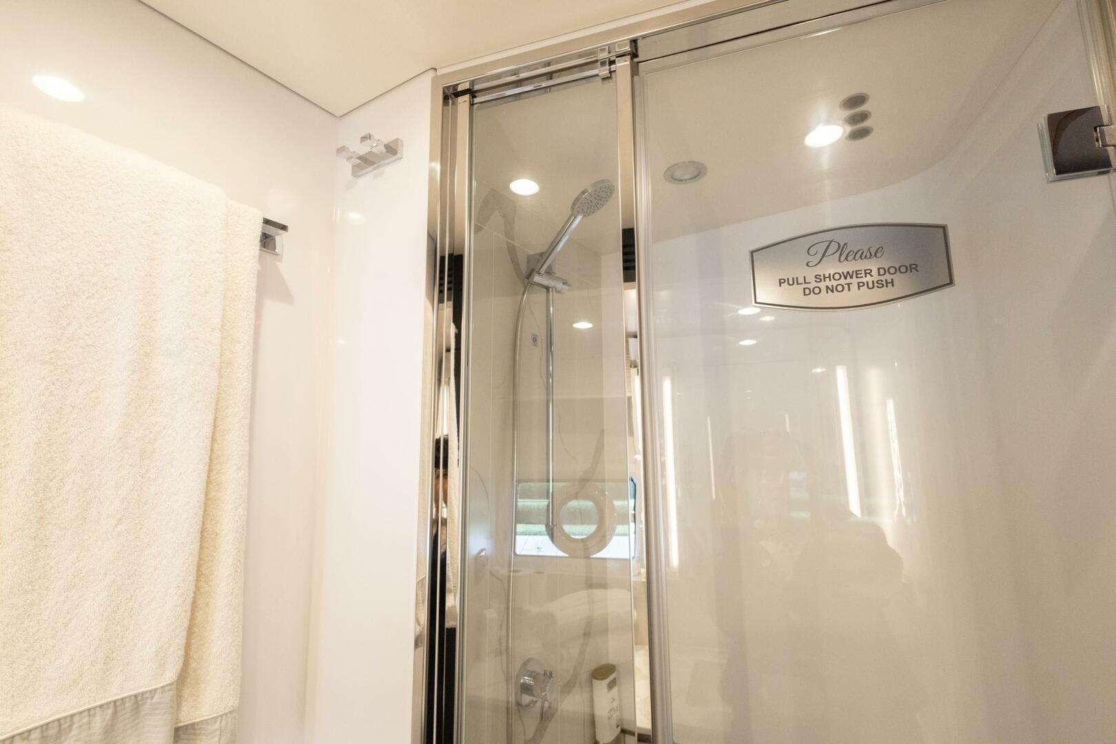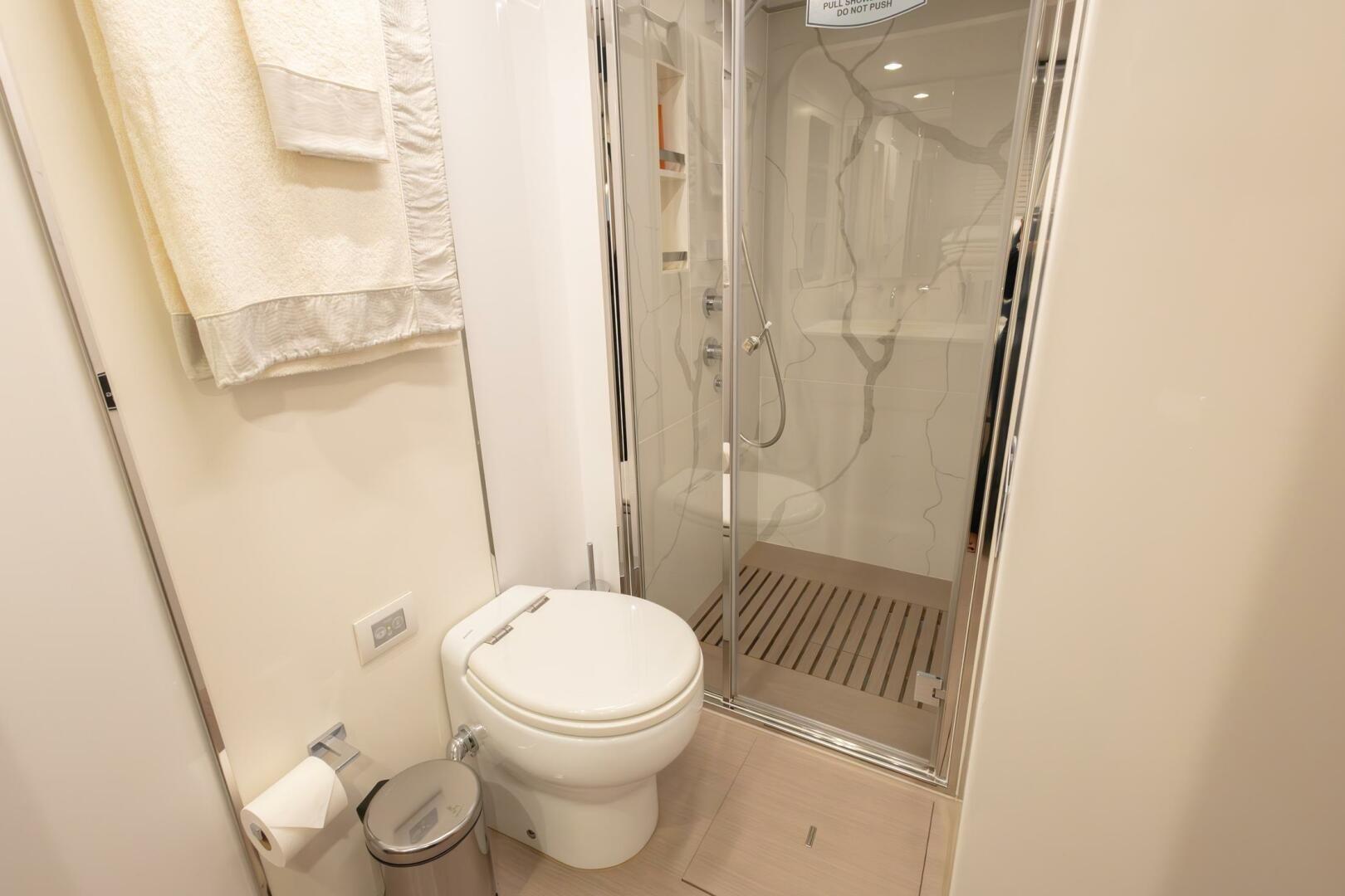 From the forward salon going down four steps brings you to the forward companionway. Moving forward is the VIP stateroom, highlights include island queen berth, long side windows, abundant storage compartments, TV, and ensuite head with separate shower stall. To port is a second guest cabin with a double berths. This stateroom has access to the guest/day head. Additional items include a large hanging locker, porthole, reading lights, and TV. The third guest stateroom is to starboard. There are two single berths, abundant storage, TV, and reading lights. The full beam master stateroom is midship. She has a walk around queen berth. Forward of the berth is a TV behind a mirrored wall. There are two large hanging lockers with abundant storage. To starboard is a seating area with a table. The large side hull windows allow natural light to bathe the cabin in a warm glow. The overhead has recessed LED adjustable lighting and the sole has burbur carpet. The ensuite head is well lit with large mirrors and a large vanity, electric head, large shower stall and tile sole.