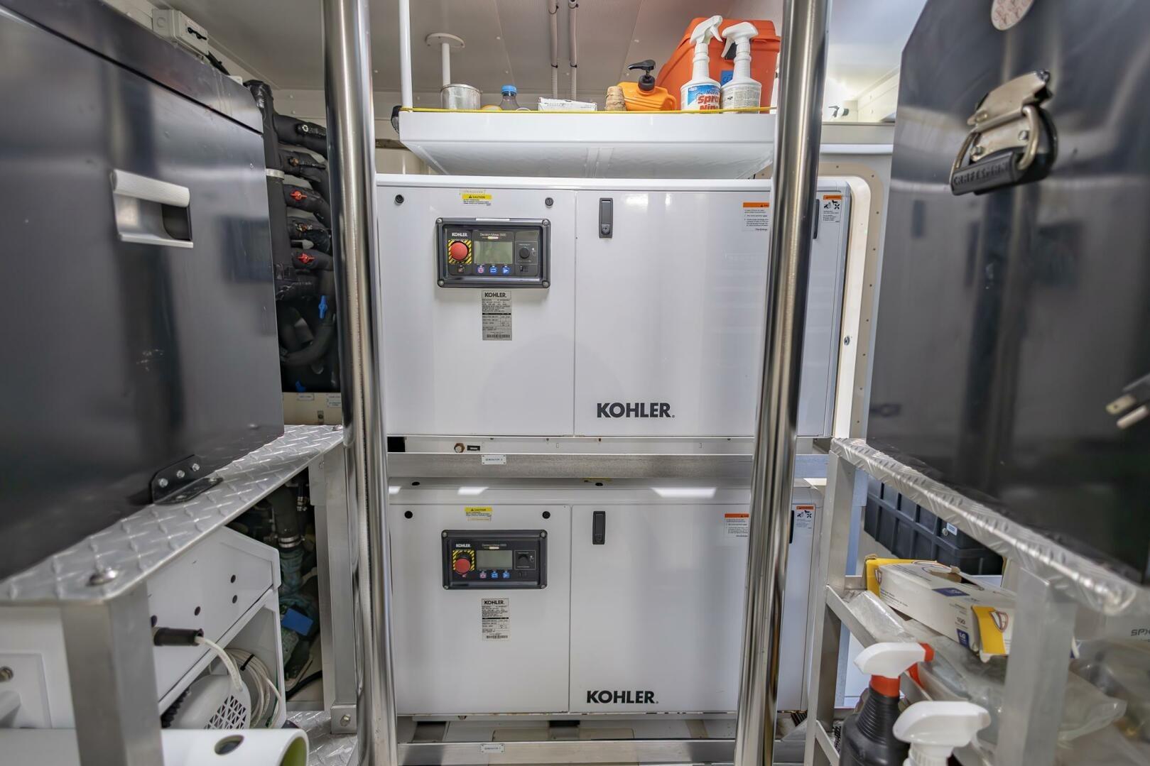 The massive fly bridge has a forward starboard helm with a full complement of electronics and mechanical equipment to allow captain to navigate with confidence. Across to port is a small table with wrap around seating, midship to port is a large dining table for eight. Across to starboard is a wet bar with an electric grill, icemaker, refrigerator, sink, and storage. The aft bridge has two corner seating areas and a wrap around stainless steel hand rail. The fiberglass hard top has a retractable soft top and the sole is teak.