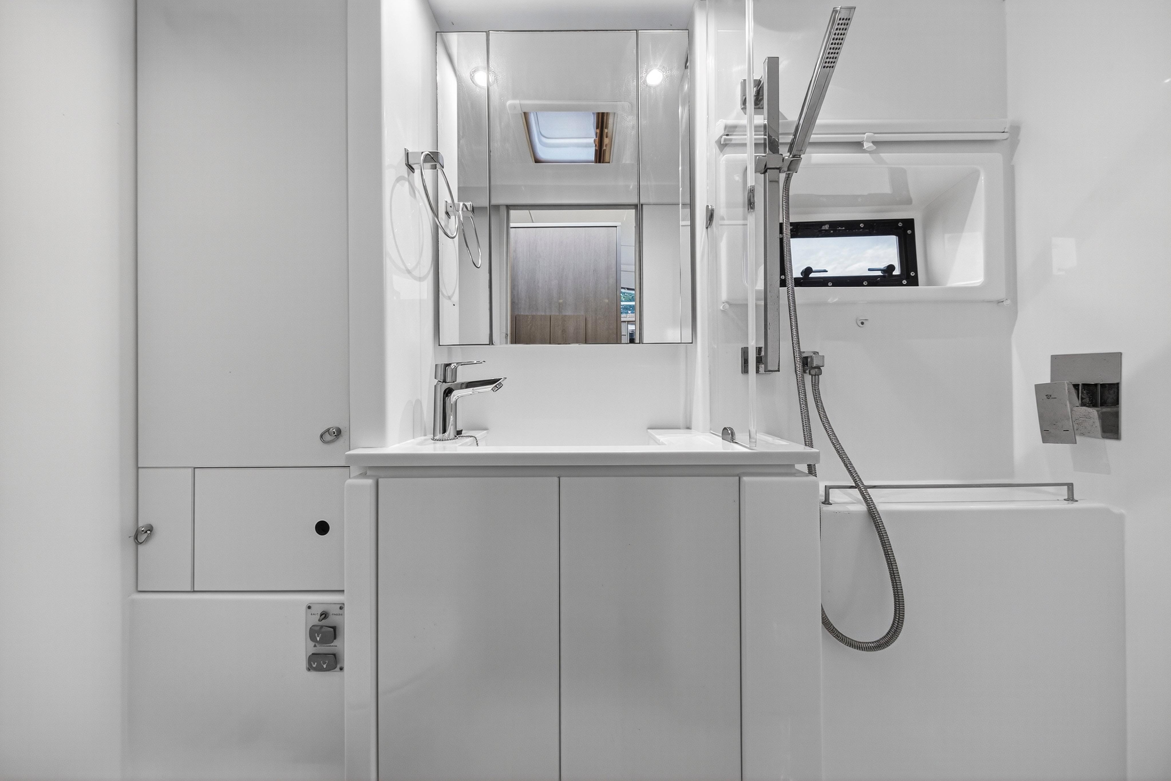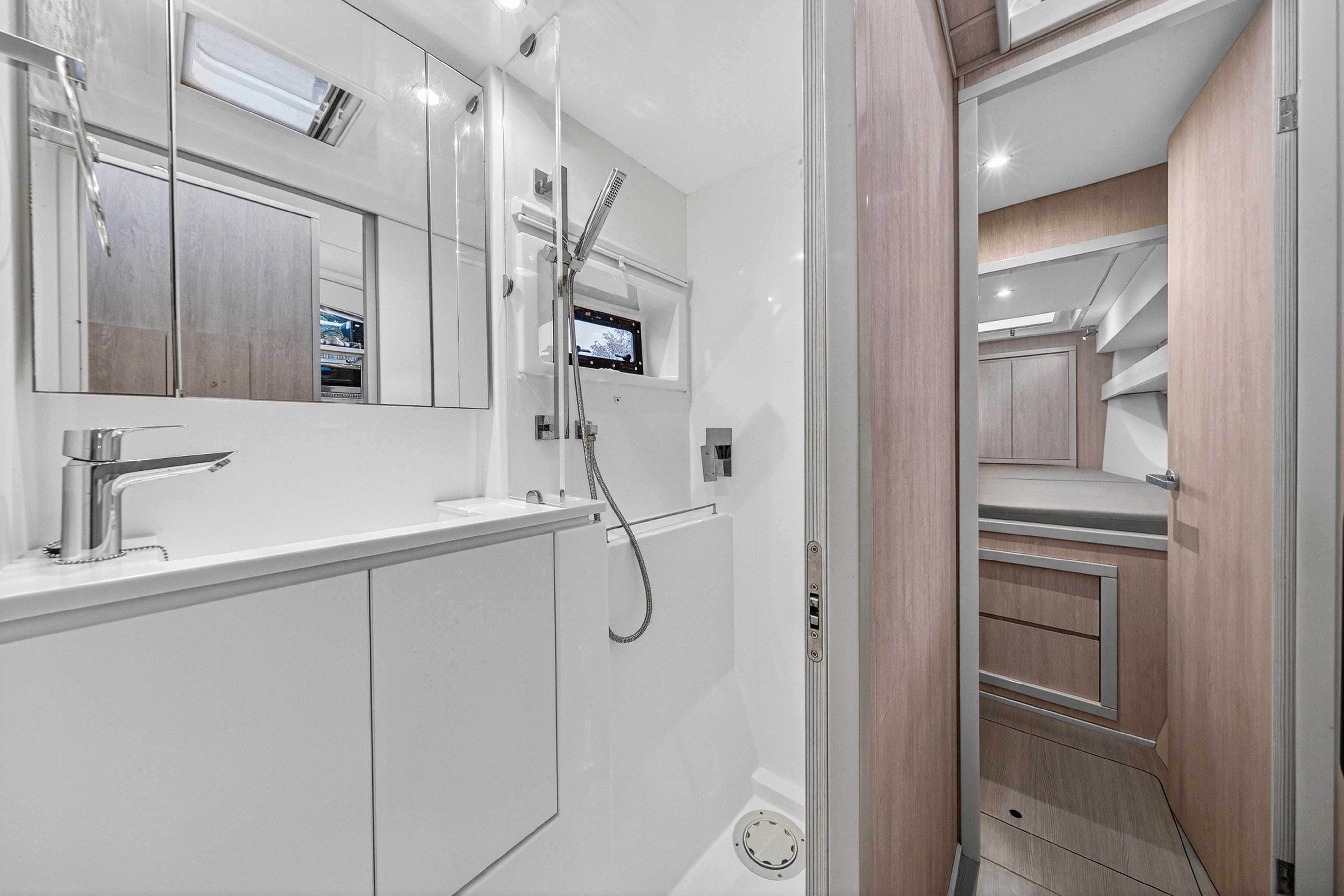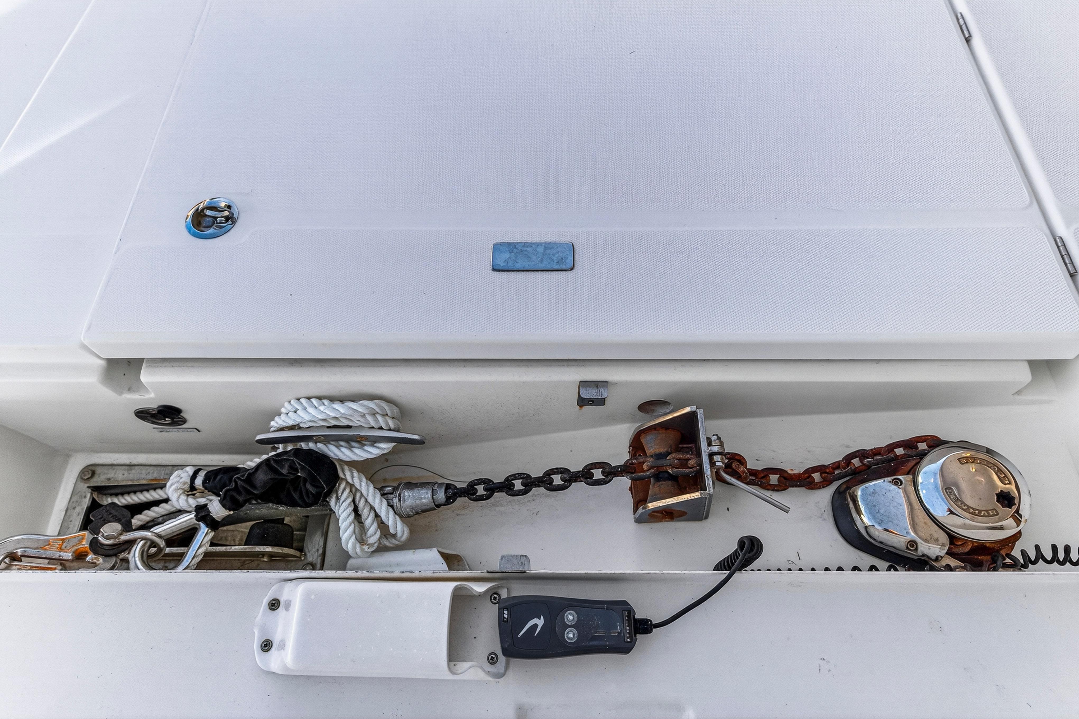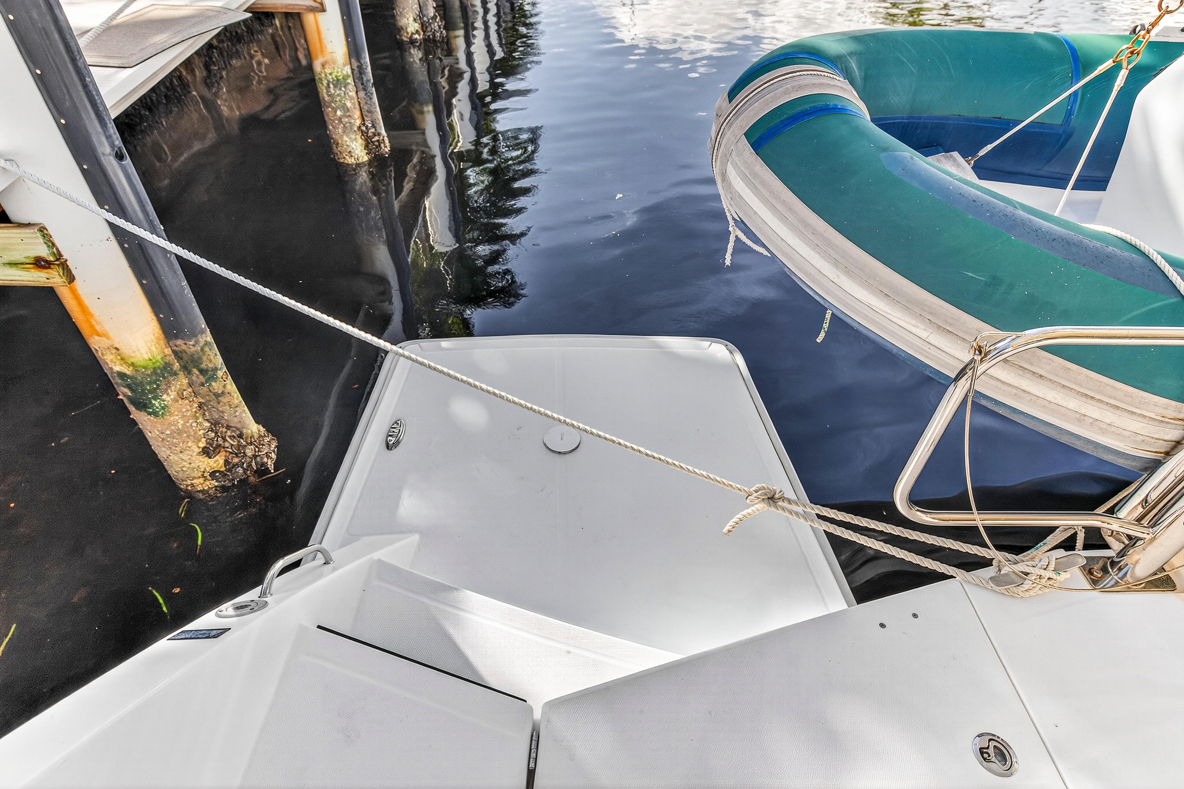 Custom fabricated steps from sunpad to front deck, 2nd lock on dinghy davits, x2 Red LED lights in salon with dedicated switch, Freshwater flush selectable heads, Freshwater Quick connect on Flrybridge