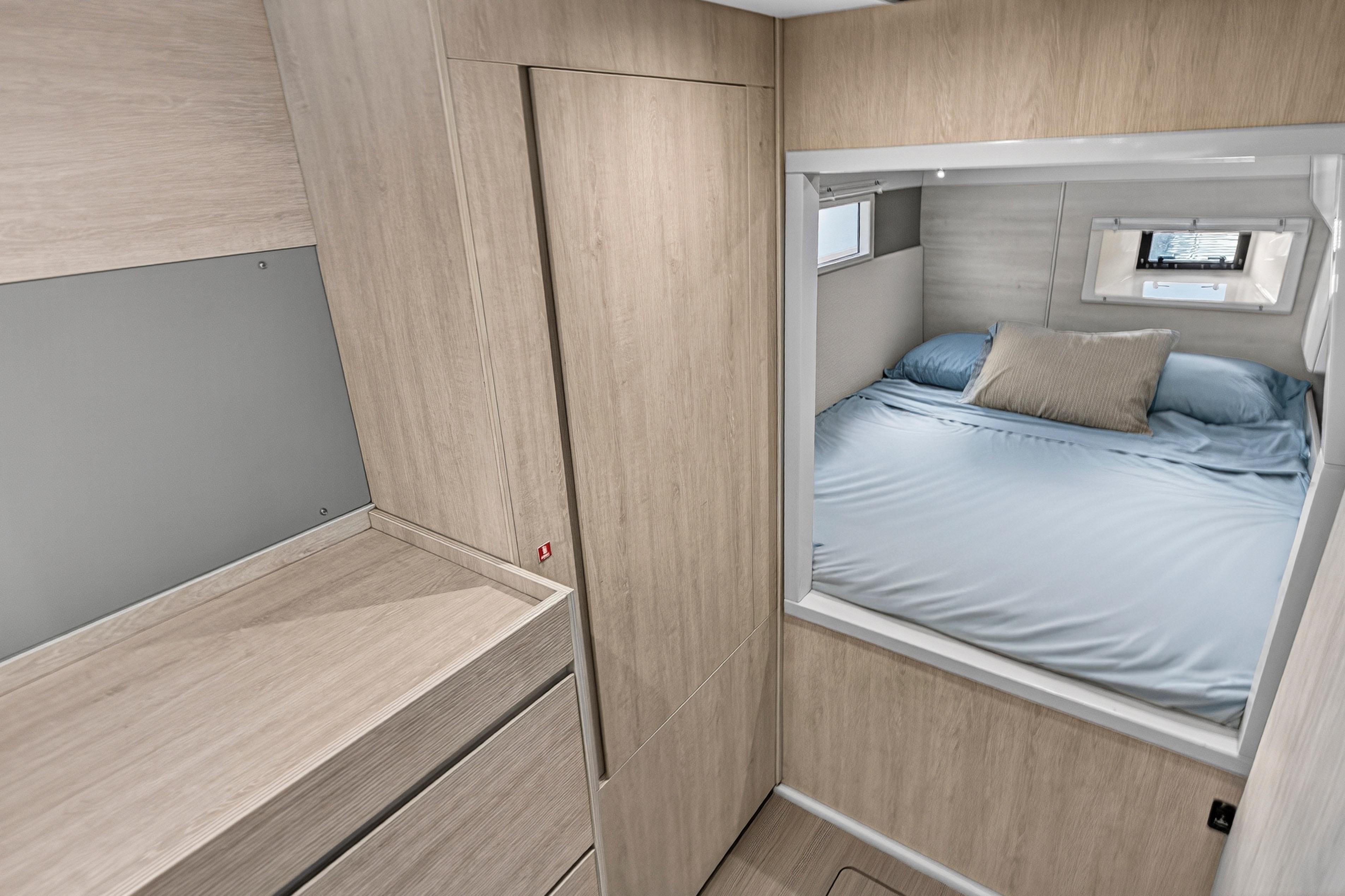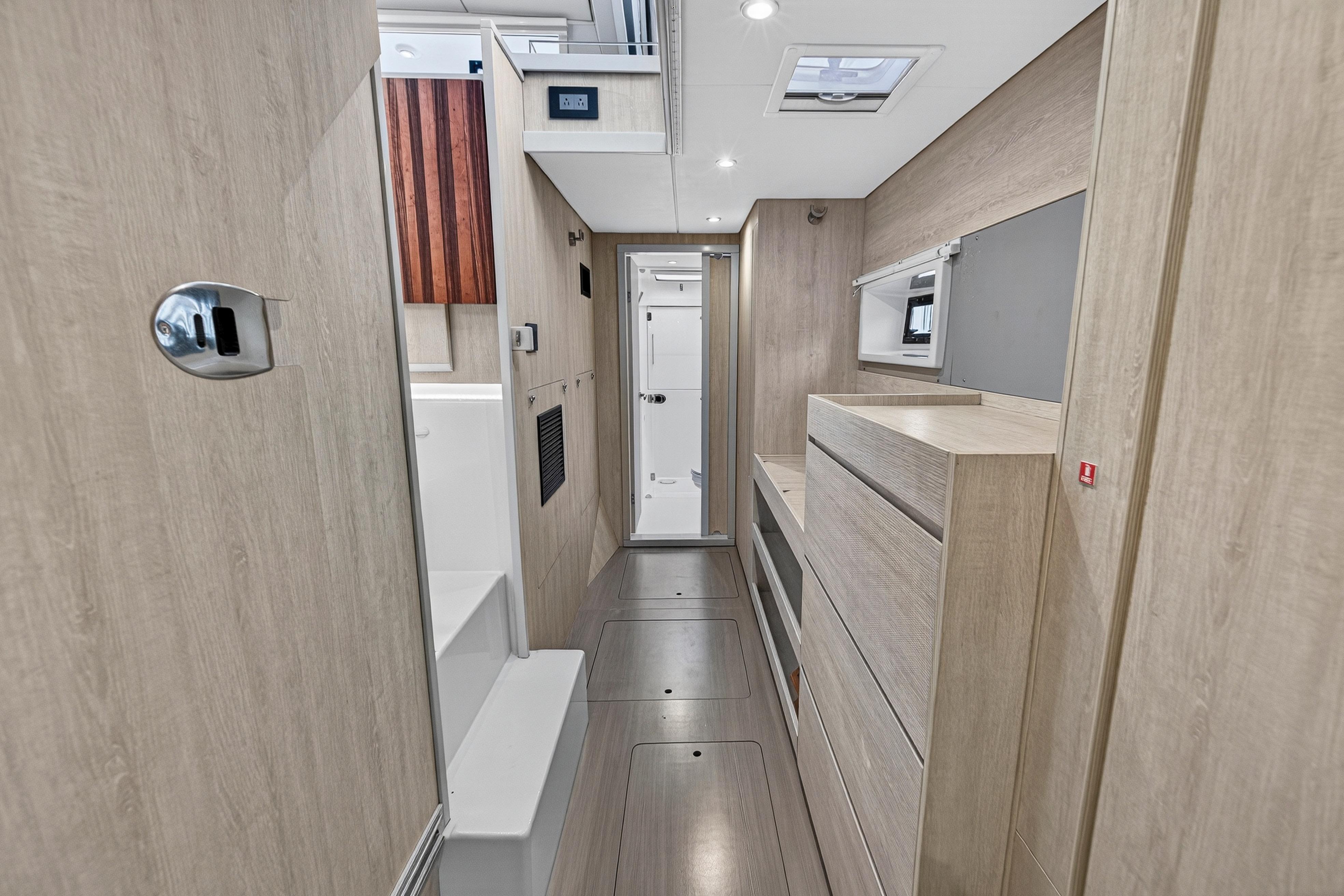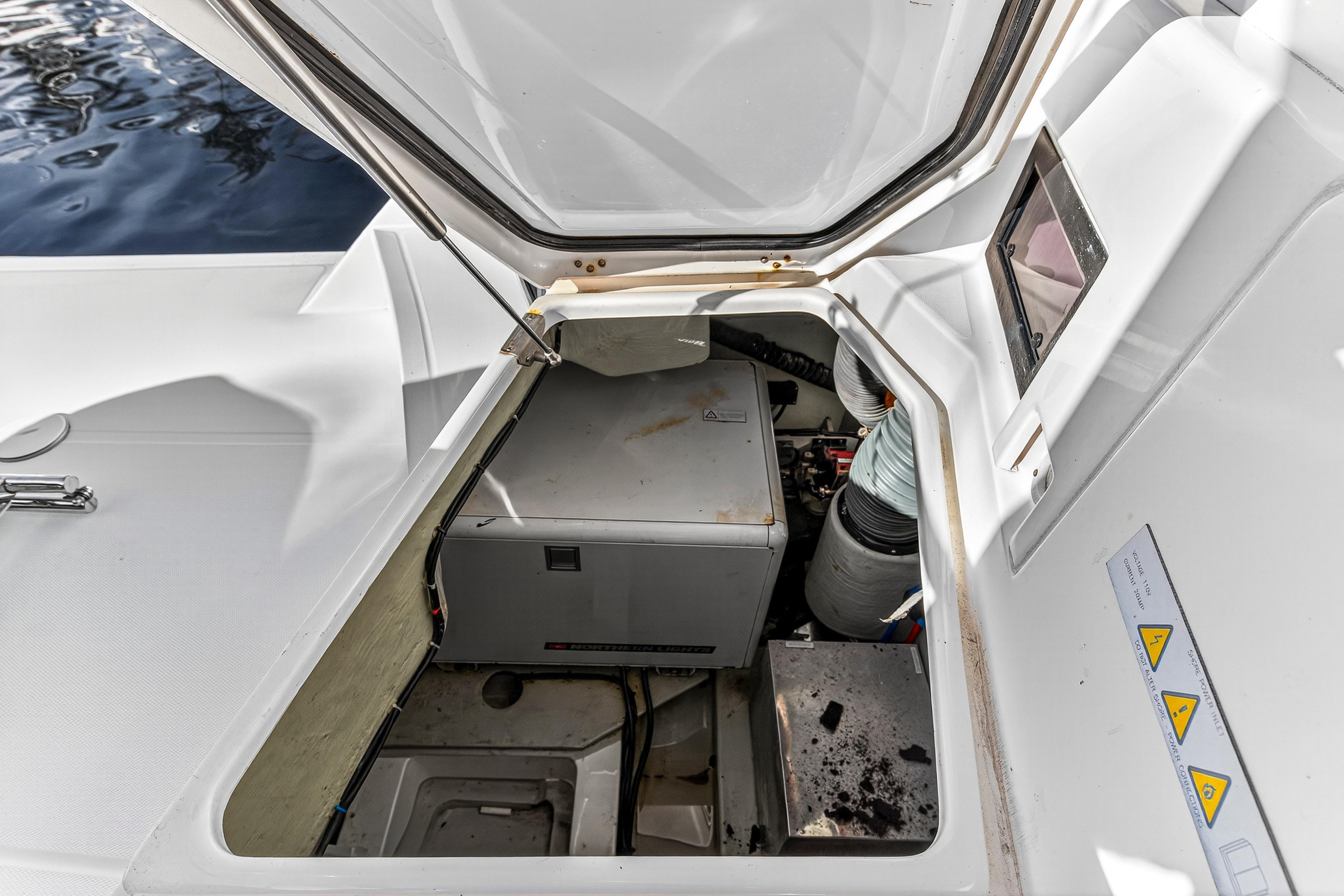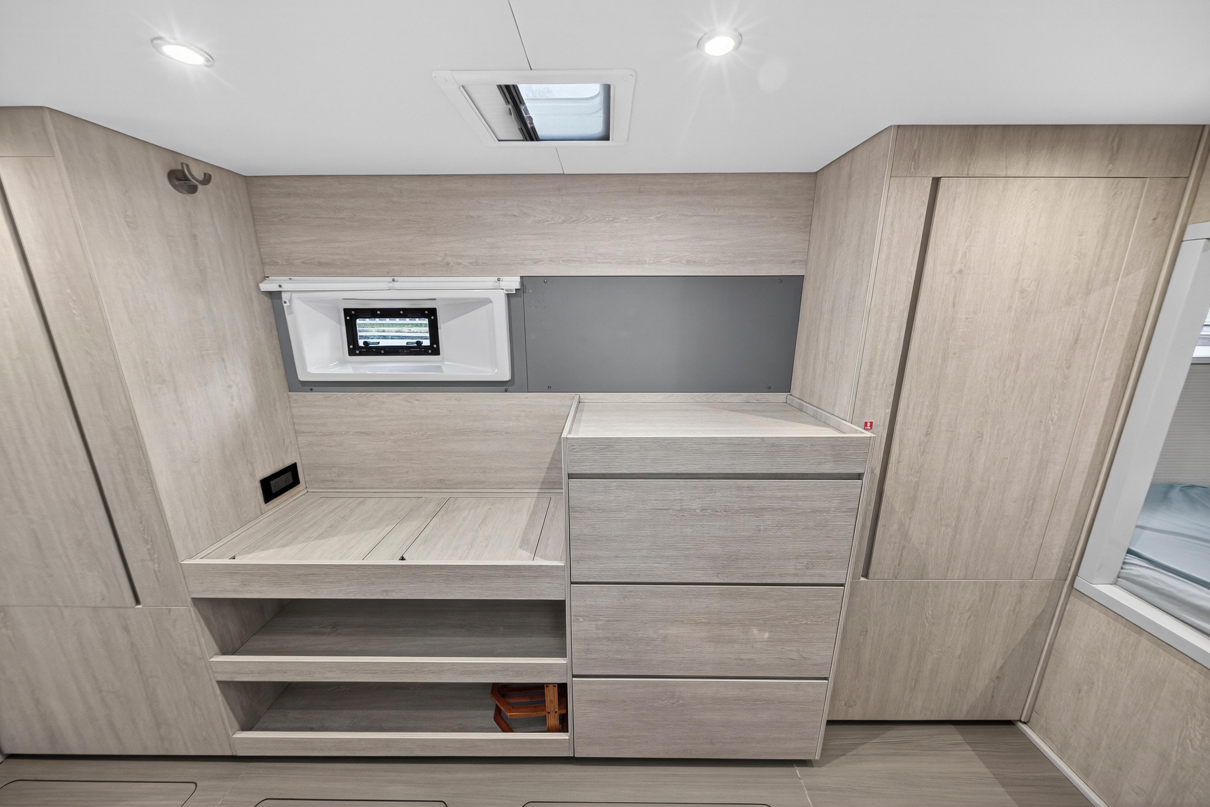 Additional floor storage in salon, Cabinetry to access under salon setee, Custom shelving In master cabin, Custom cutting board installed, Upgraded Isotherm Refrigerator, Folding Salon Table convertible to Bed,