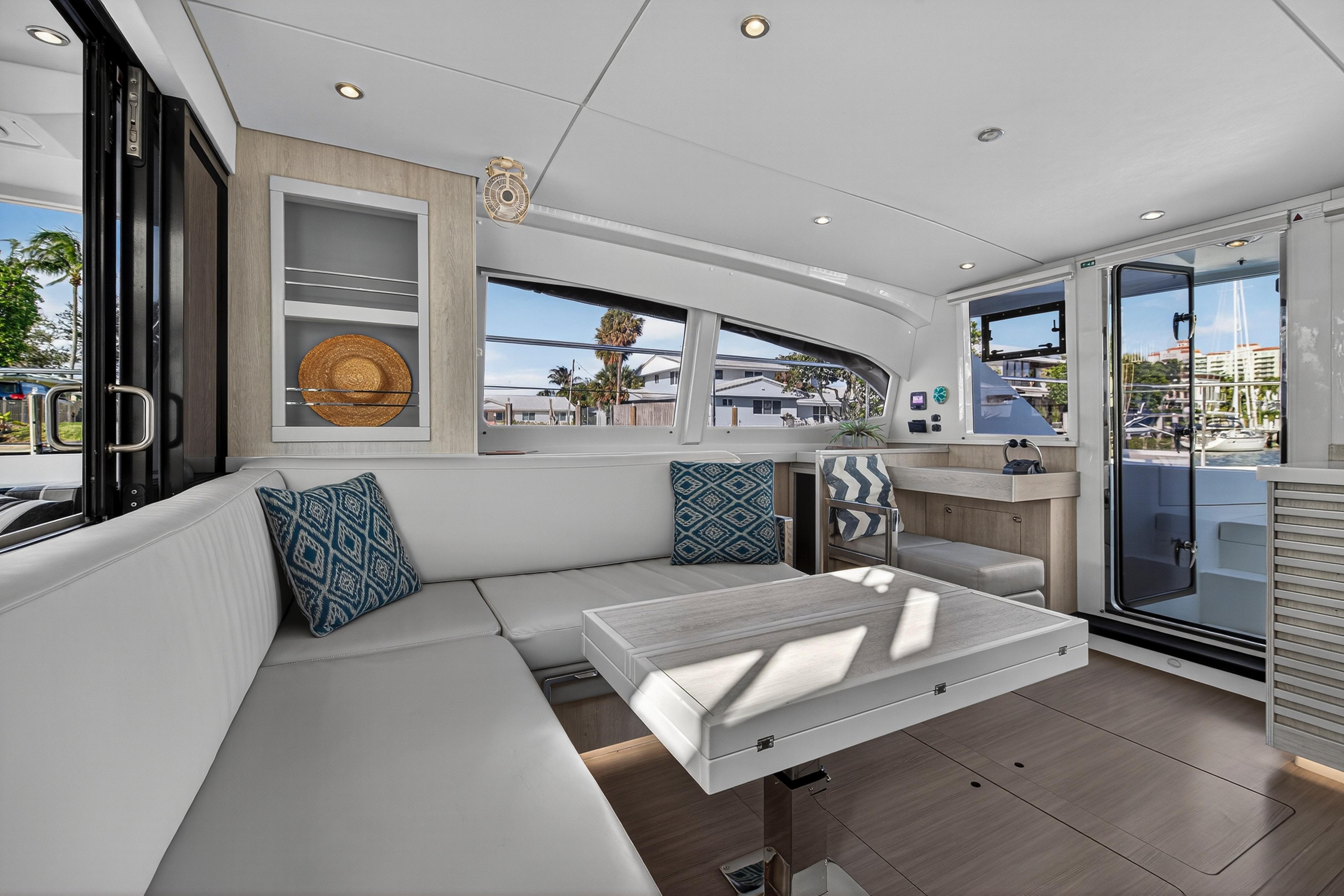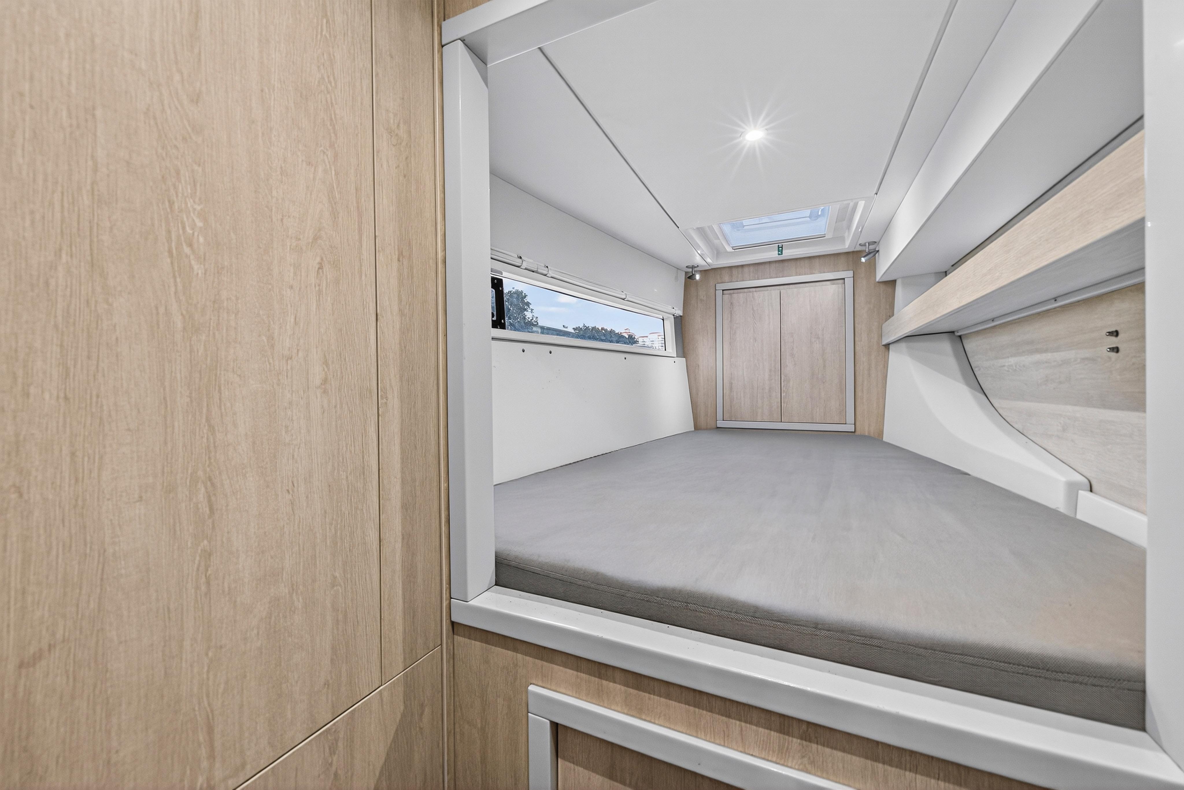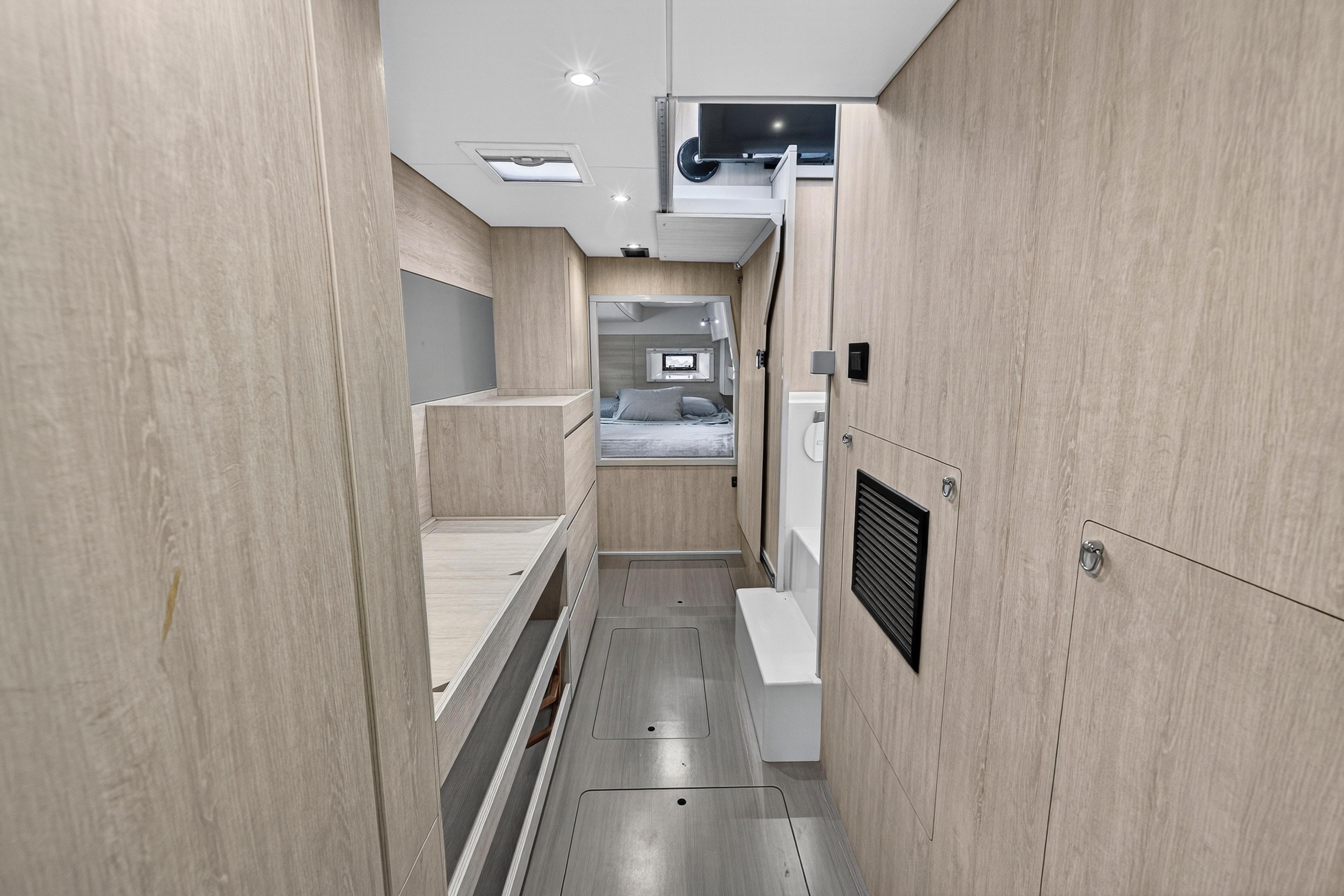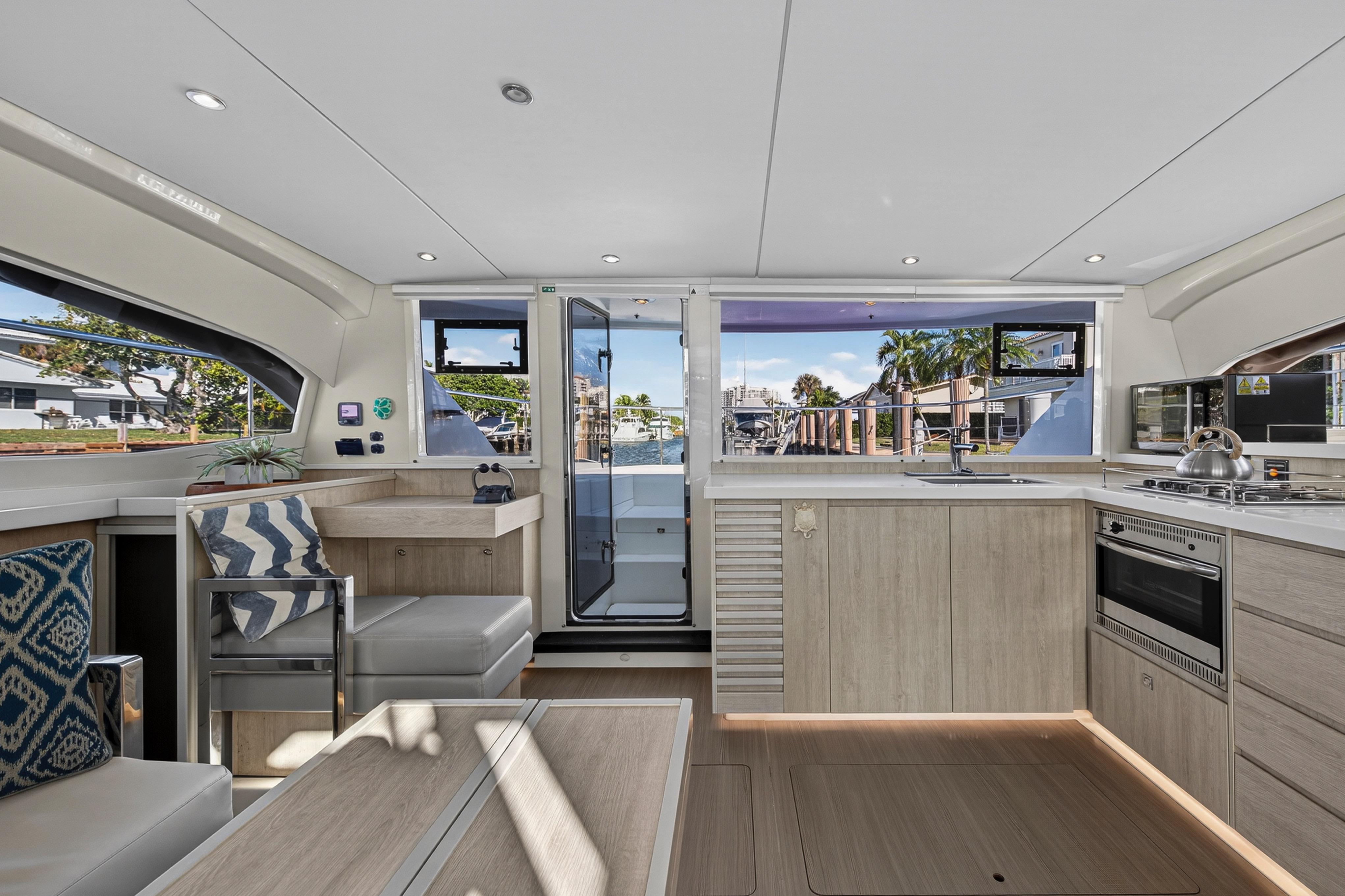 Additional floor storage in salon, Cabinetry to access under salon setee, Custom shelving In master cabin, Custom cutting board installed, Upgraded Isotherm Refrigerator, Folding Salon Table convertible to Bed,