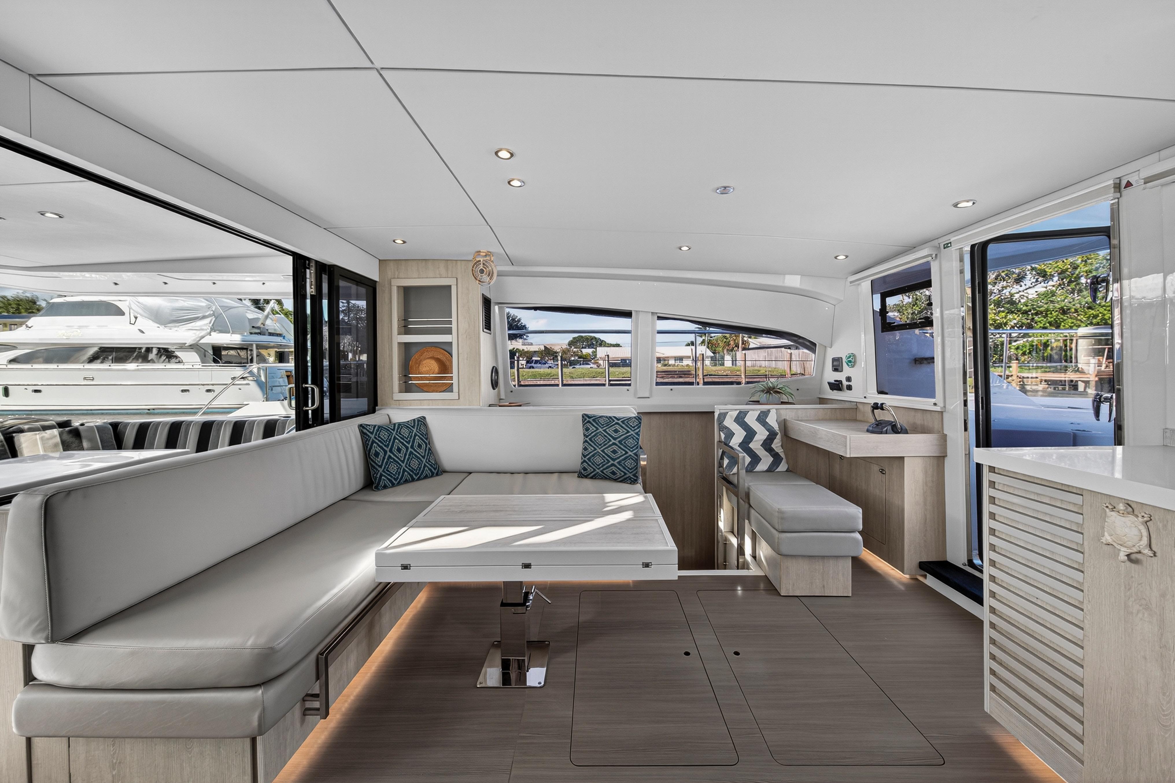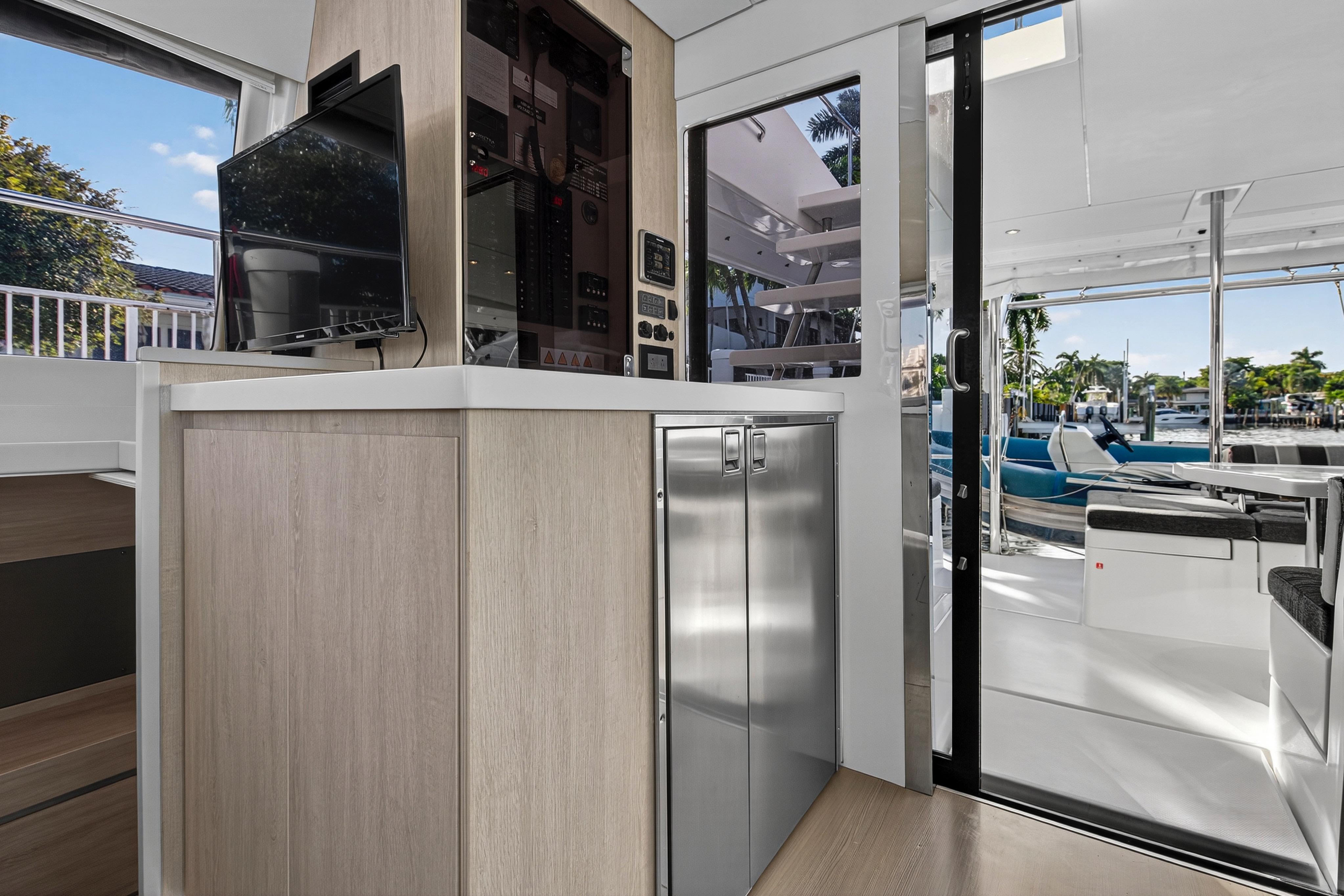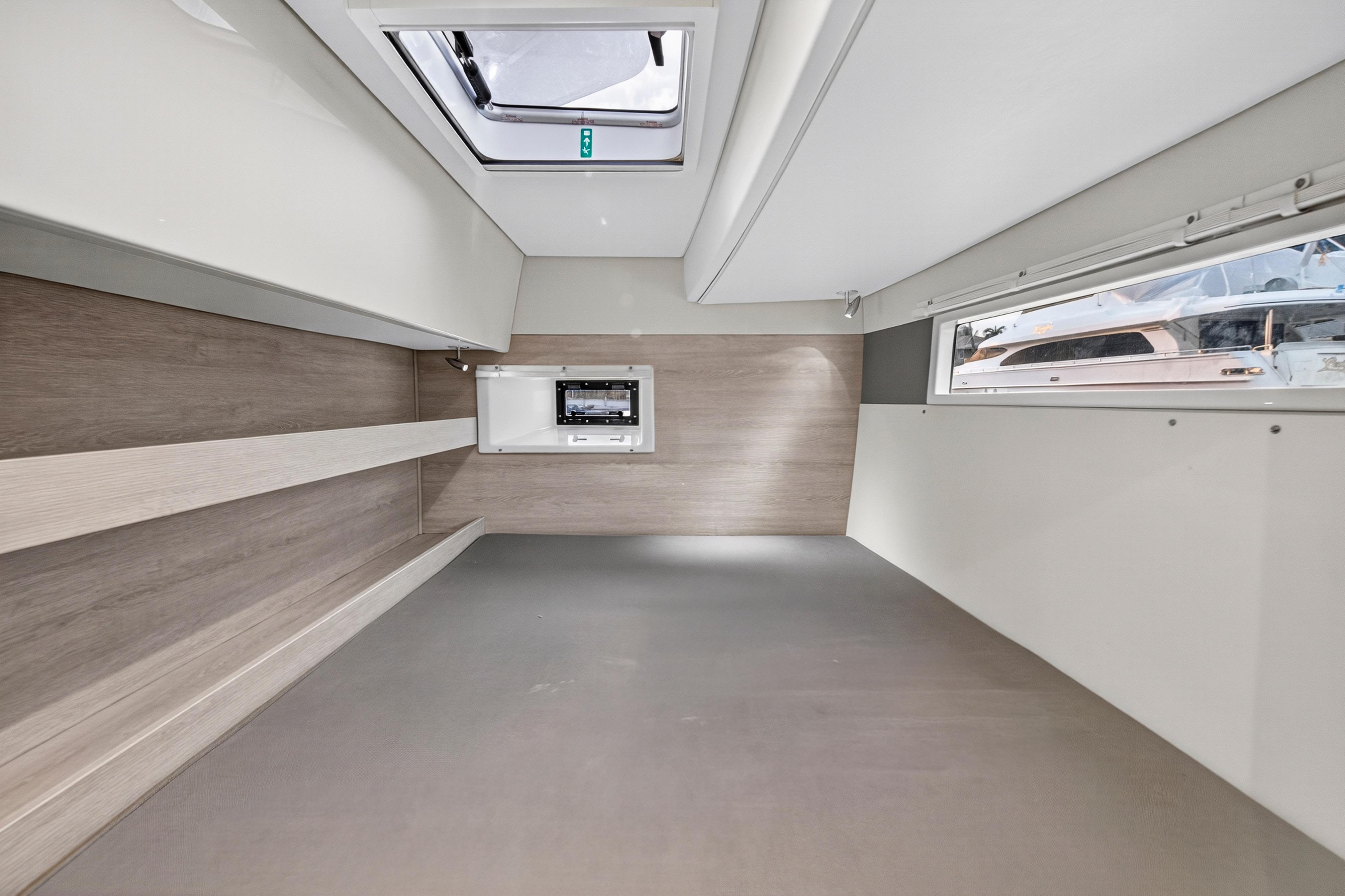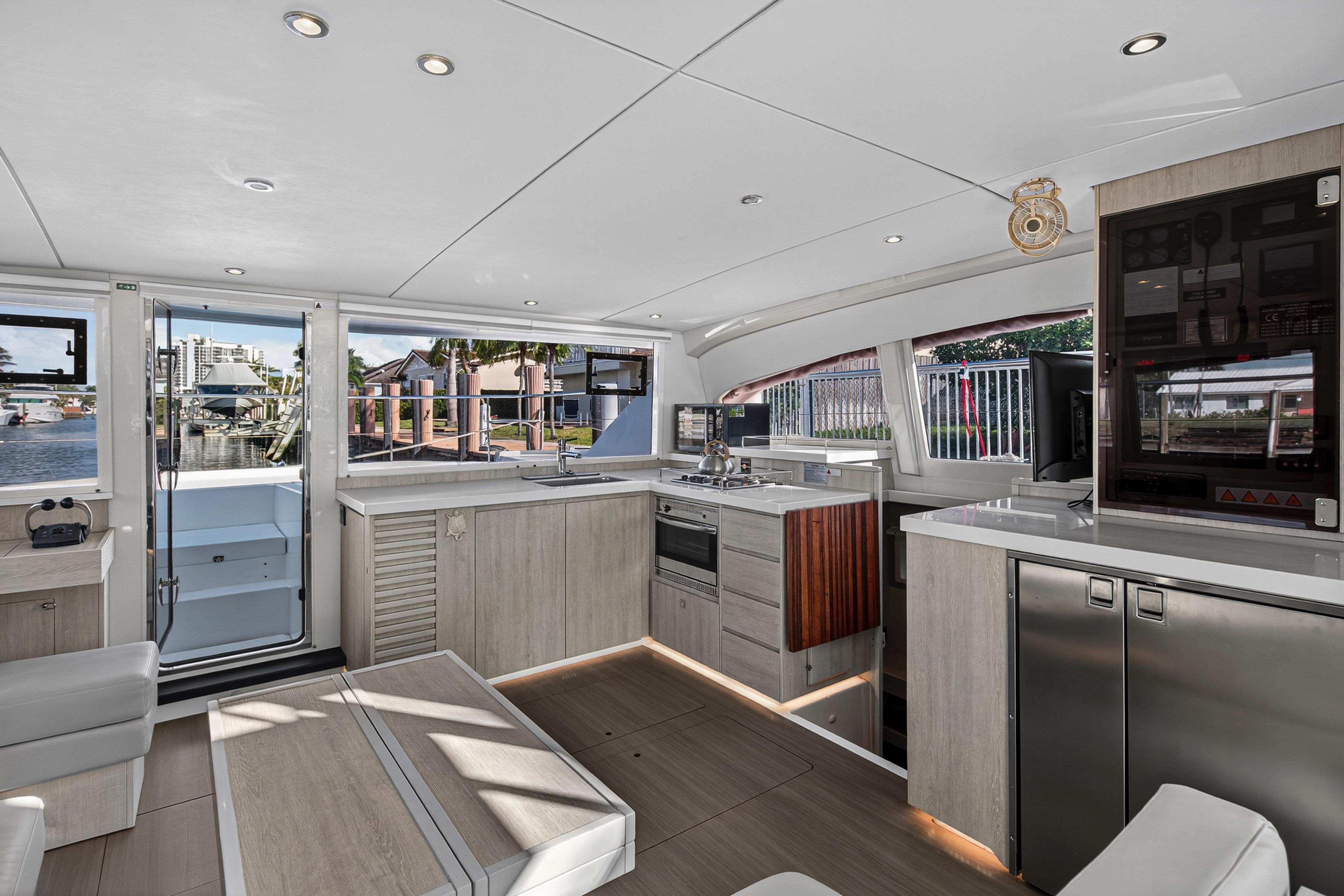 Additional floor storage in salon, Cabinetry to access under salon setee, Custom shelving In master cabin, Custom cutting board installed, Upgraded Isotherm Refrigerator, Folding Salon Table convertible to Bed,