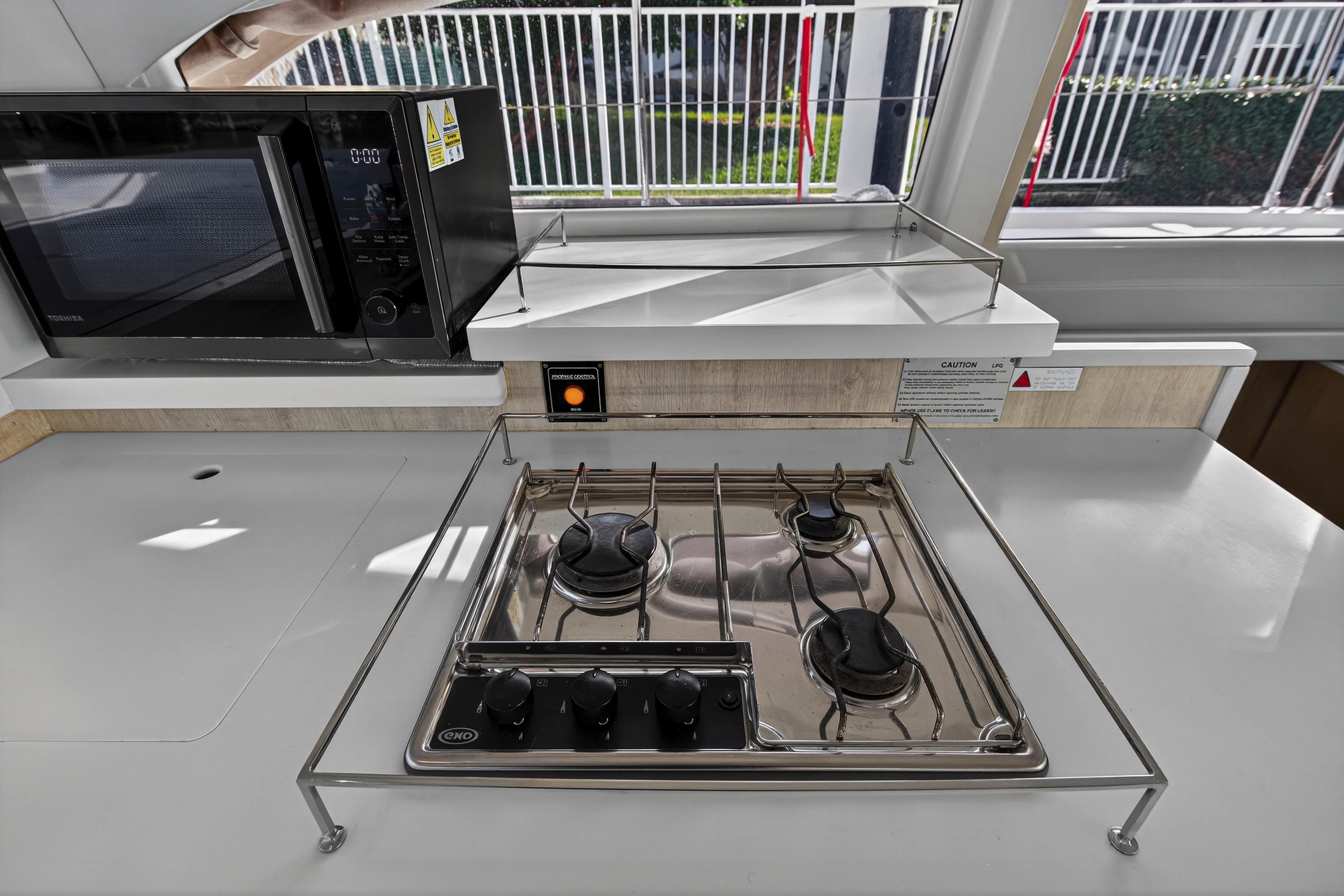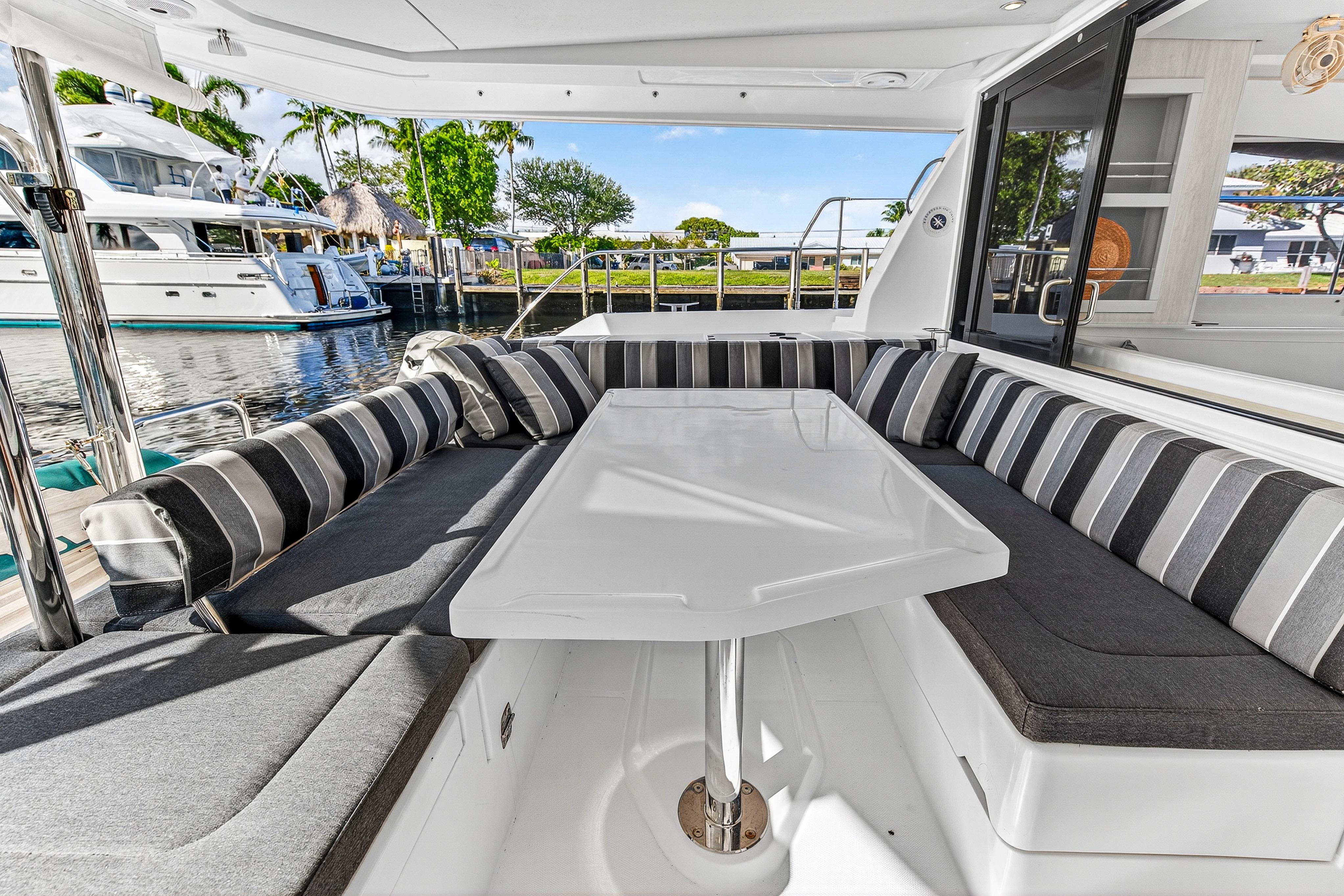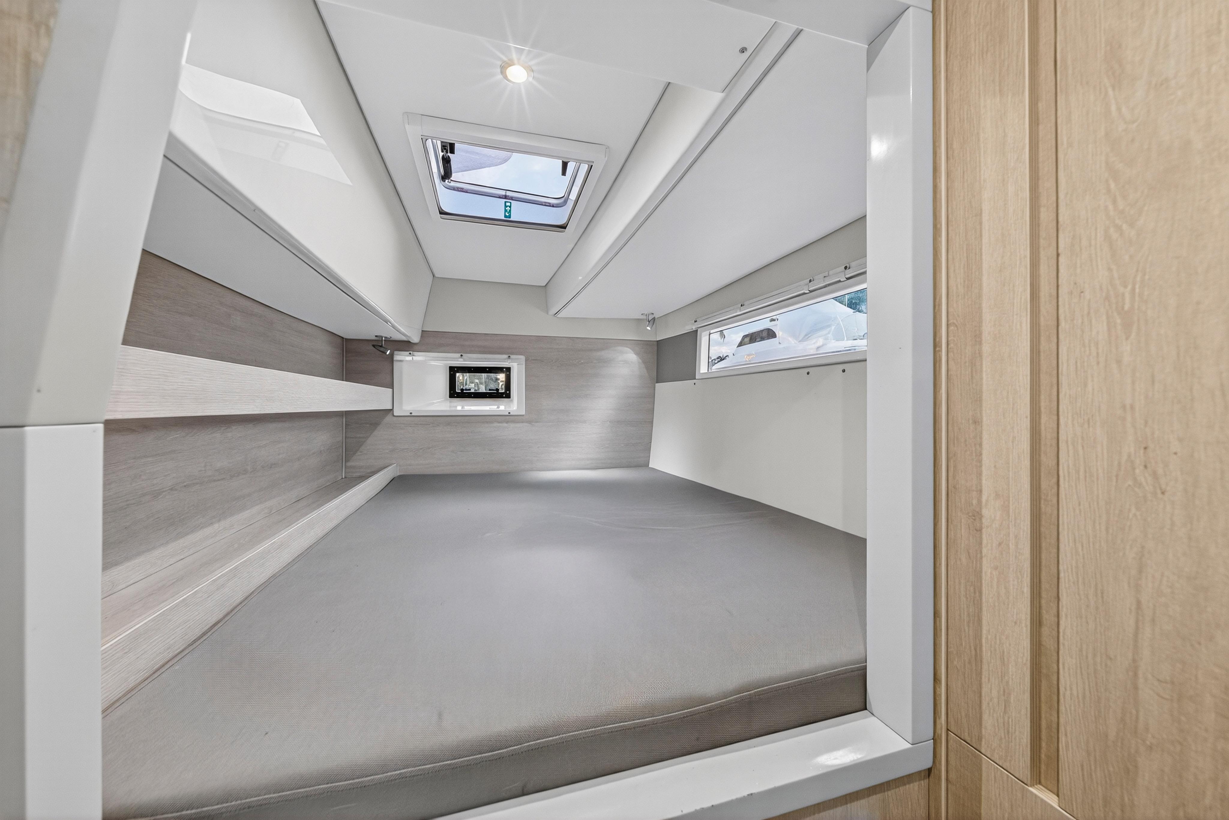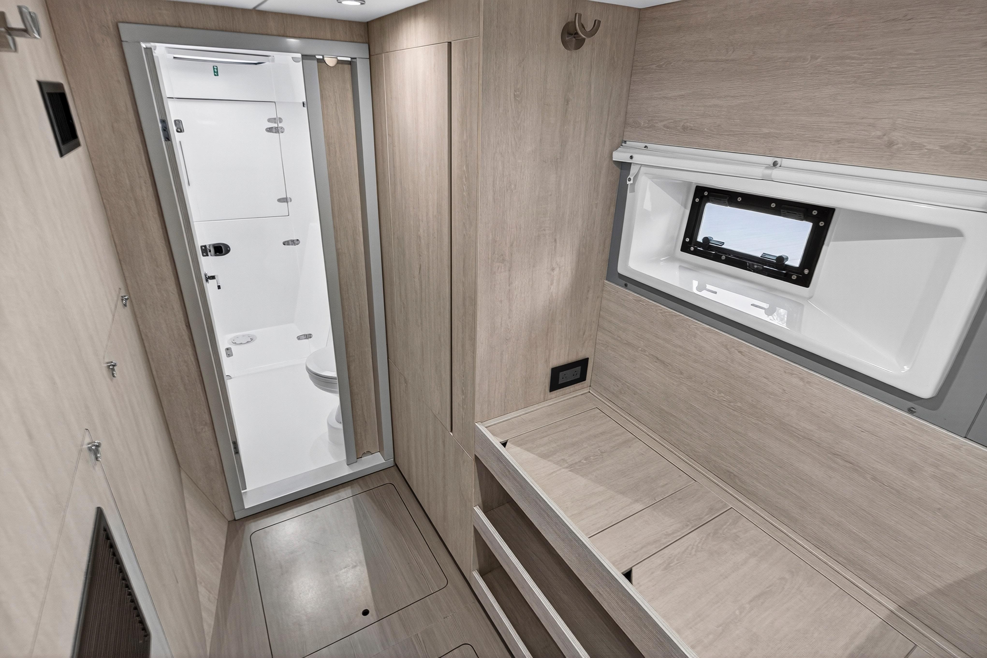 Additional floor storage in salon, Cabinetry to access under salon setee, Custom shelving In master cabin, Custom cutting board installed, Upgraded Isotherm Refrigerator, Folding Salon Table convertible to Bed,