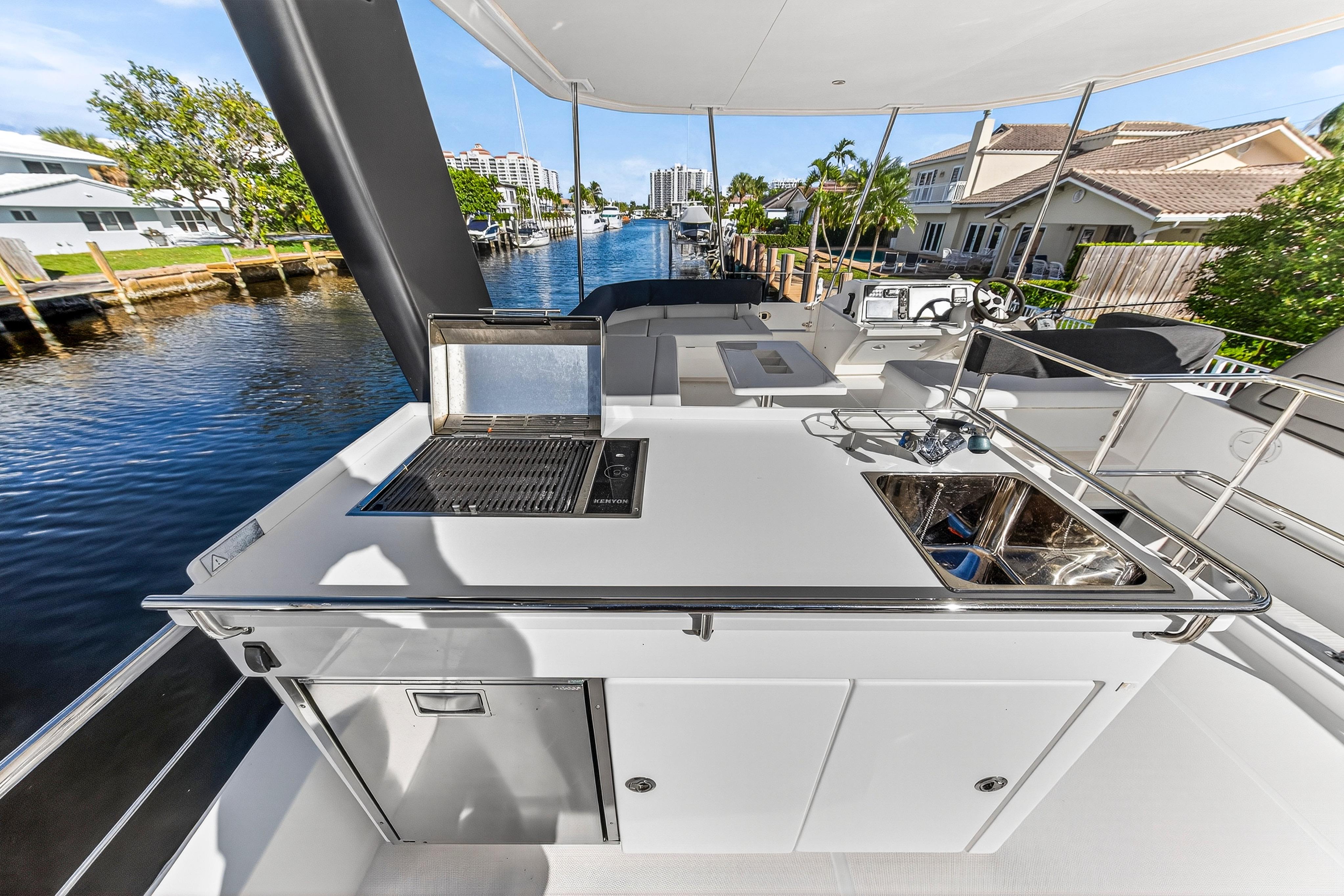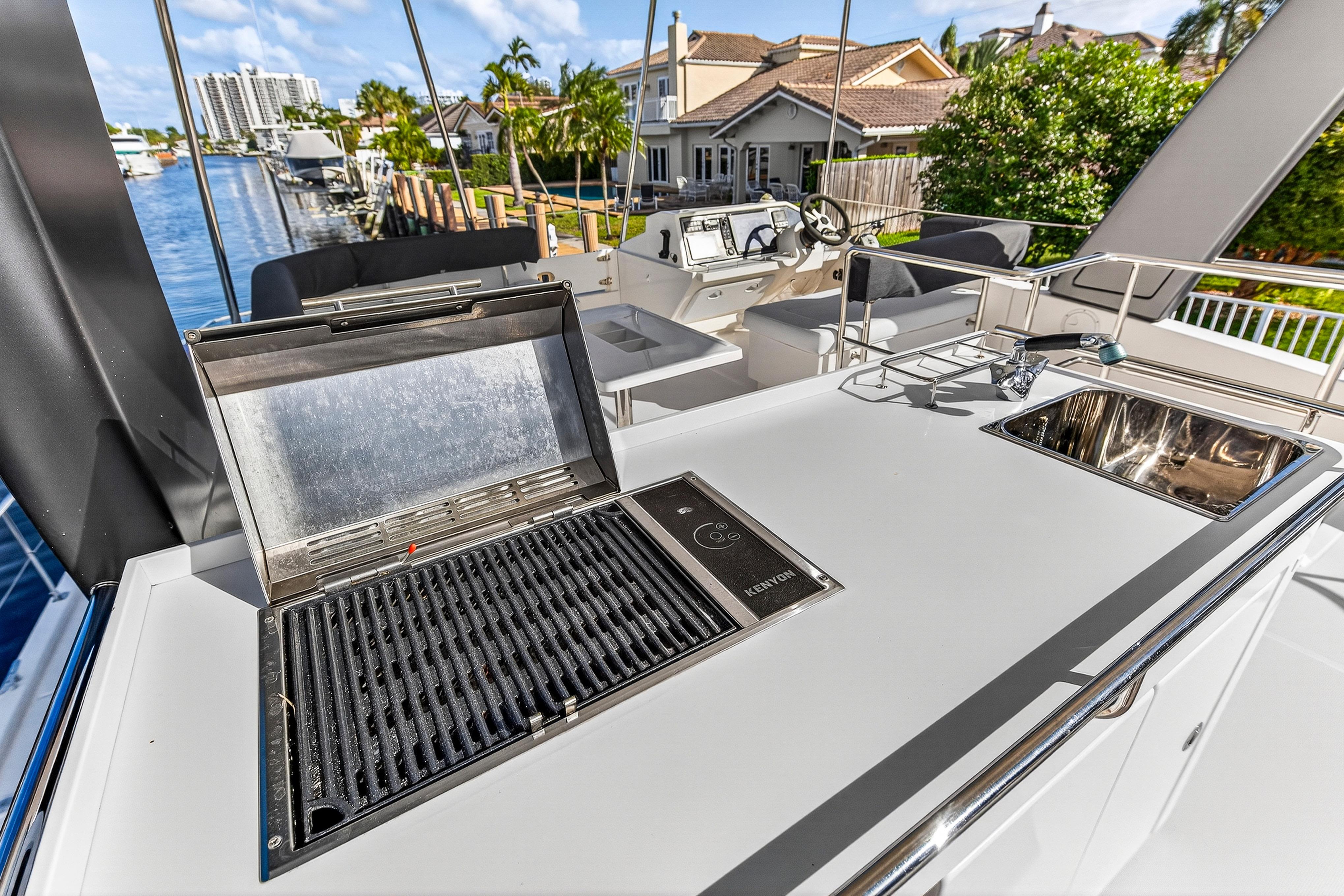 Kenyon BBQ on Flybridge with Sink, Refrigerator Storage and trash bin and Extra Large Deep Freezer installed on Flybridge