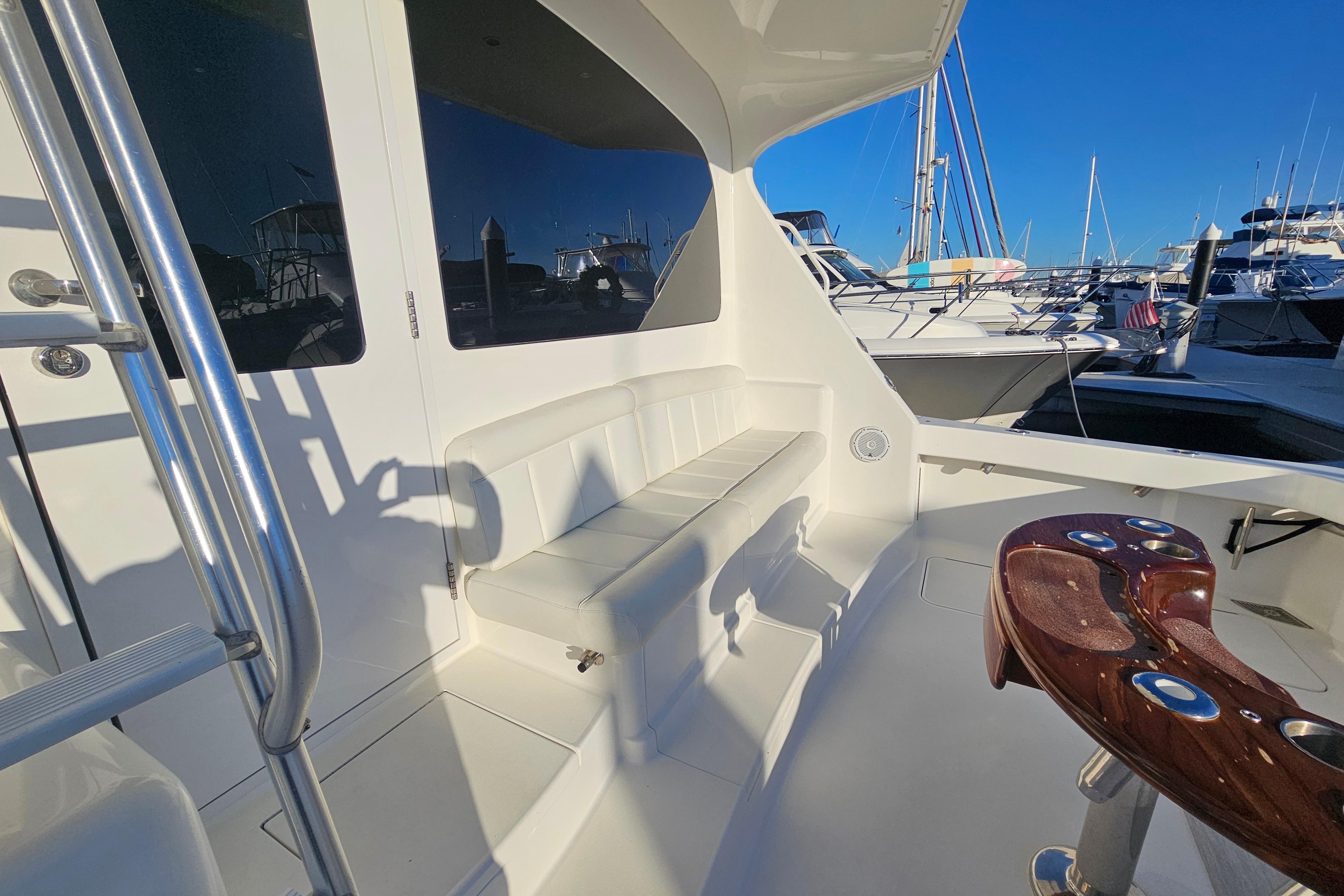 - The 122 square-foot cockpit is ideal for cruising and fishing with recessed fish and stowage boxes beneath the molded non-skid fiberglass sole, as well as built in factory bait tank and Tuna Tubes across the transom. The observation mezzanine features hinged seating with stowage below, room for an available freezer and engine room access. A step box cooler at the salon entrance also can be refrigerated. Four stainless-steel flush rod holders, a transom door with lift gate, fresh and raw-water wash down systems, indirect lighting beneath the rounded coamings, a molded in aluminum deck plate for a fishing chair or a cocktail table, a tackle locker with drawers, and a transom fish box are among the standard features.