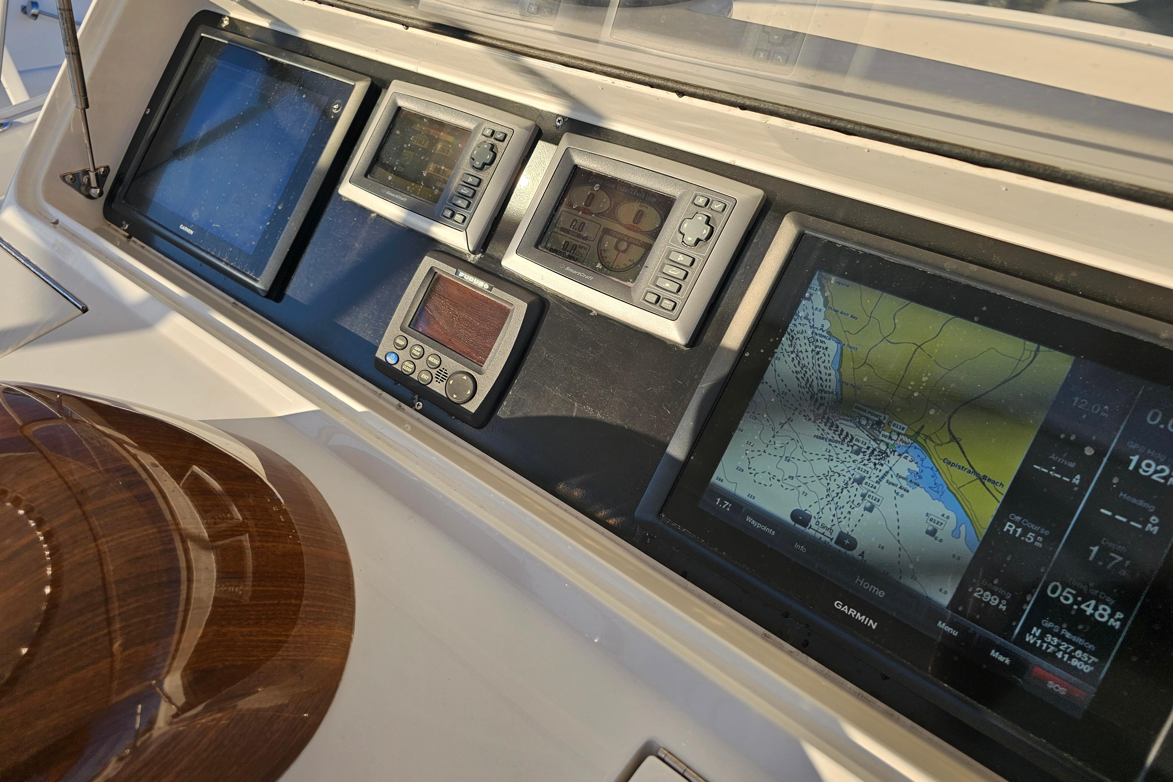 - Business and pleasure merge on the flybridge where the tournament style center console helm affords great visibility and practicality. The raised dash with its clear acrylic front is the safe, dry home for electronics and standard SmartCraft engine instrumentation. Recessed compartments house accessory switches to port and the pod system joystick control to starboard. A pair of Murray Products white ladder back pedestal seats nicely complements port, starboard, and forward lounges.