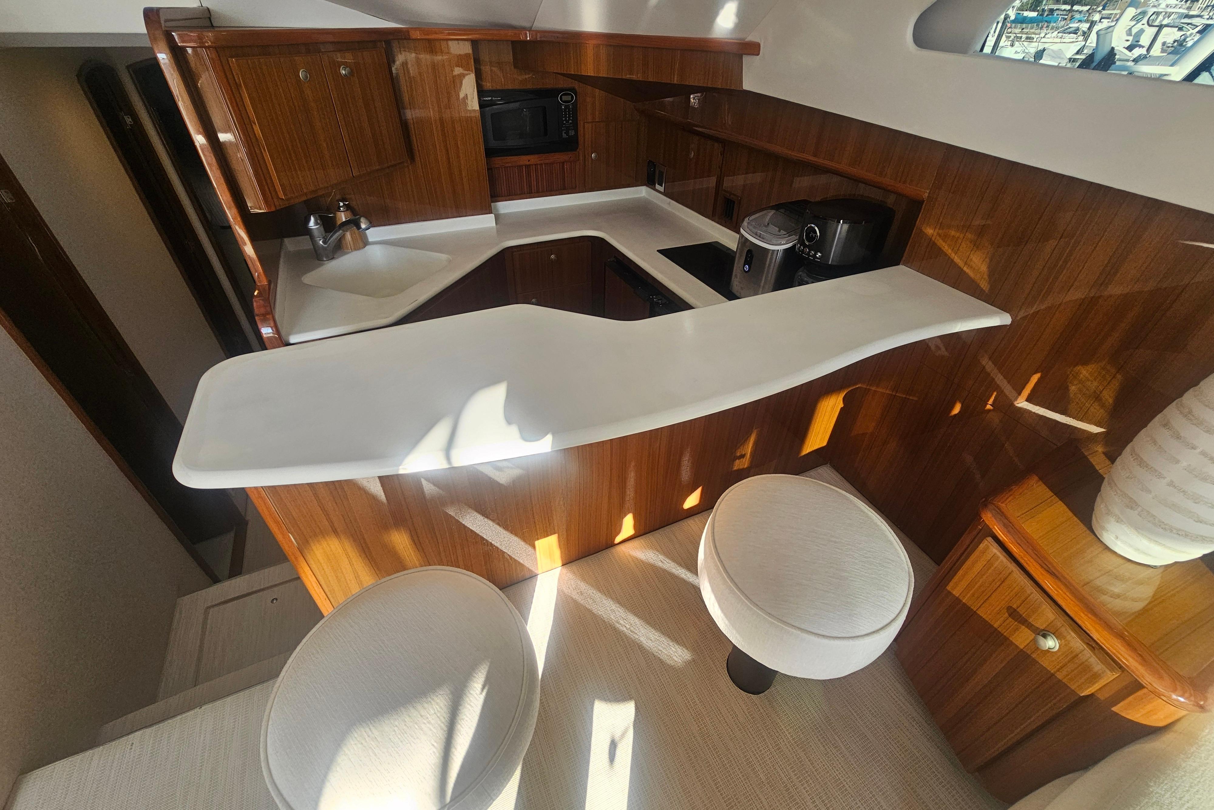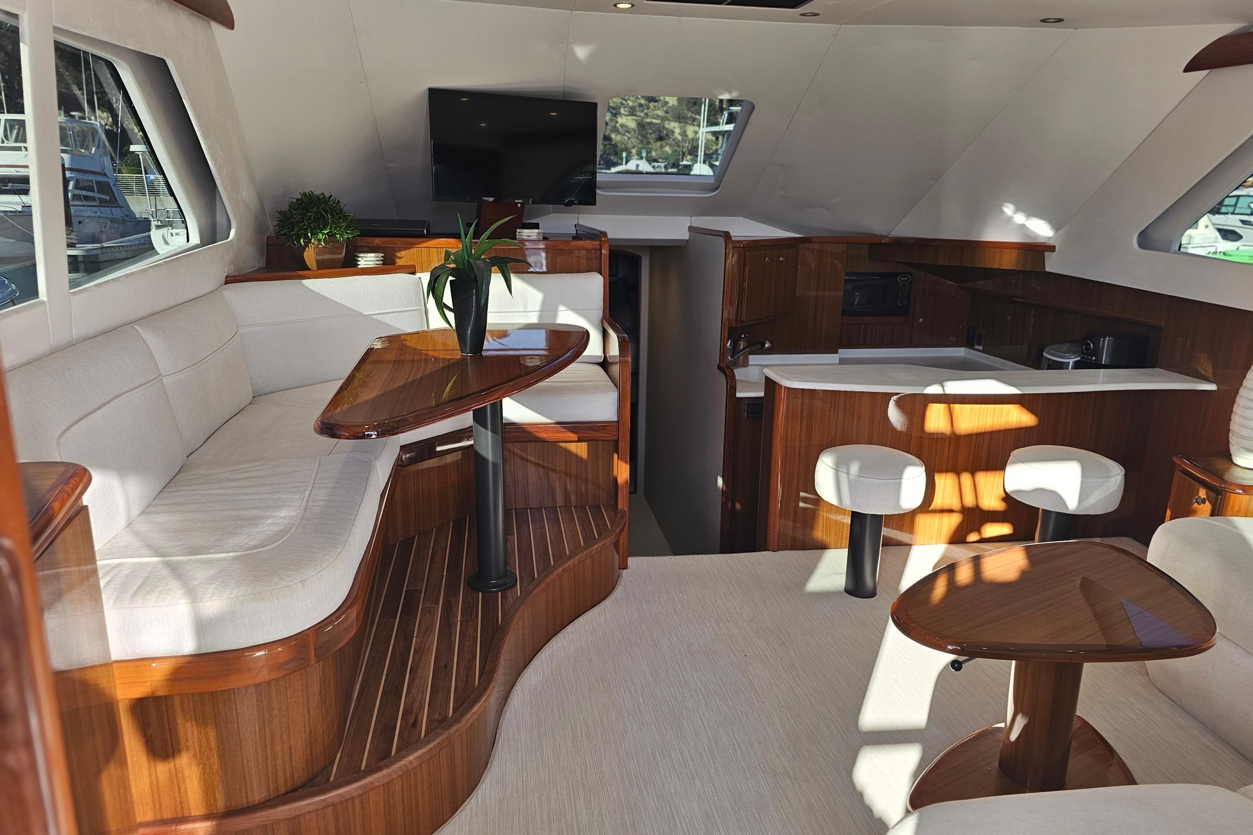 The dinette is raised above the main carpeted sole defining the area while opposite a pair of bar stools increases dining space at the galley counter. Two steps down, the starboard side U-shaped galley is cleverly designed to take advantage of natural lighting. Corian counter space is generous and hand-finished high gloss teak drawers and cabinetry is plentiful.