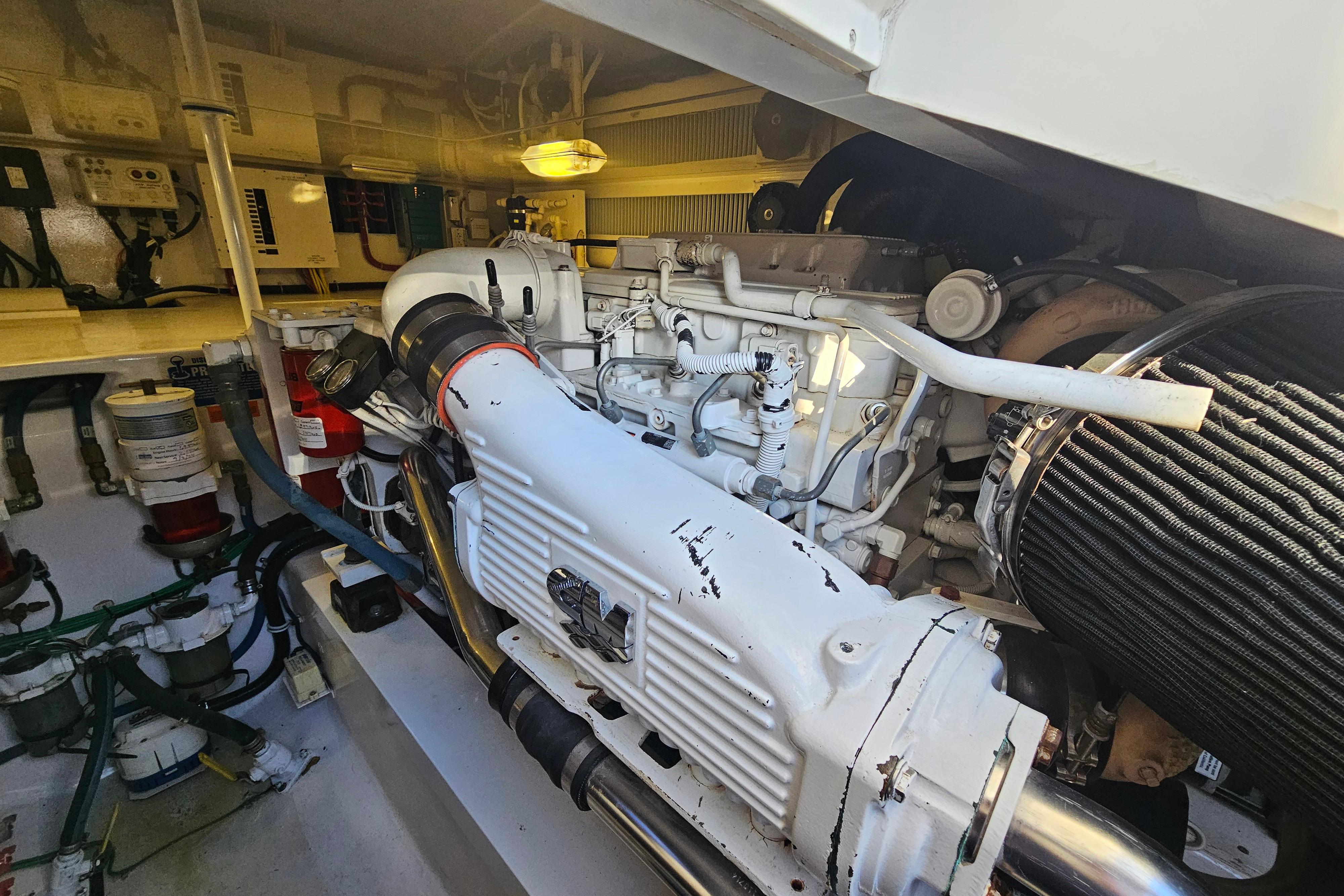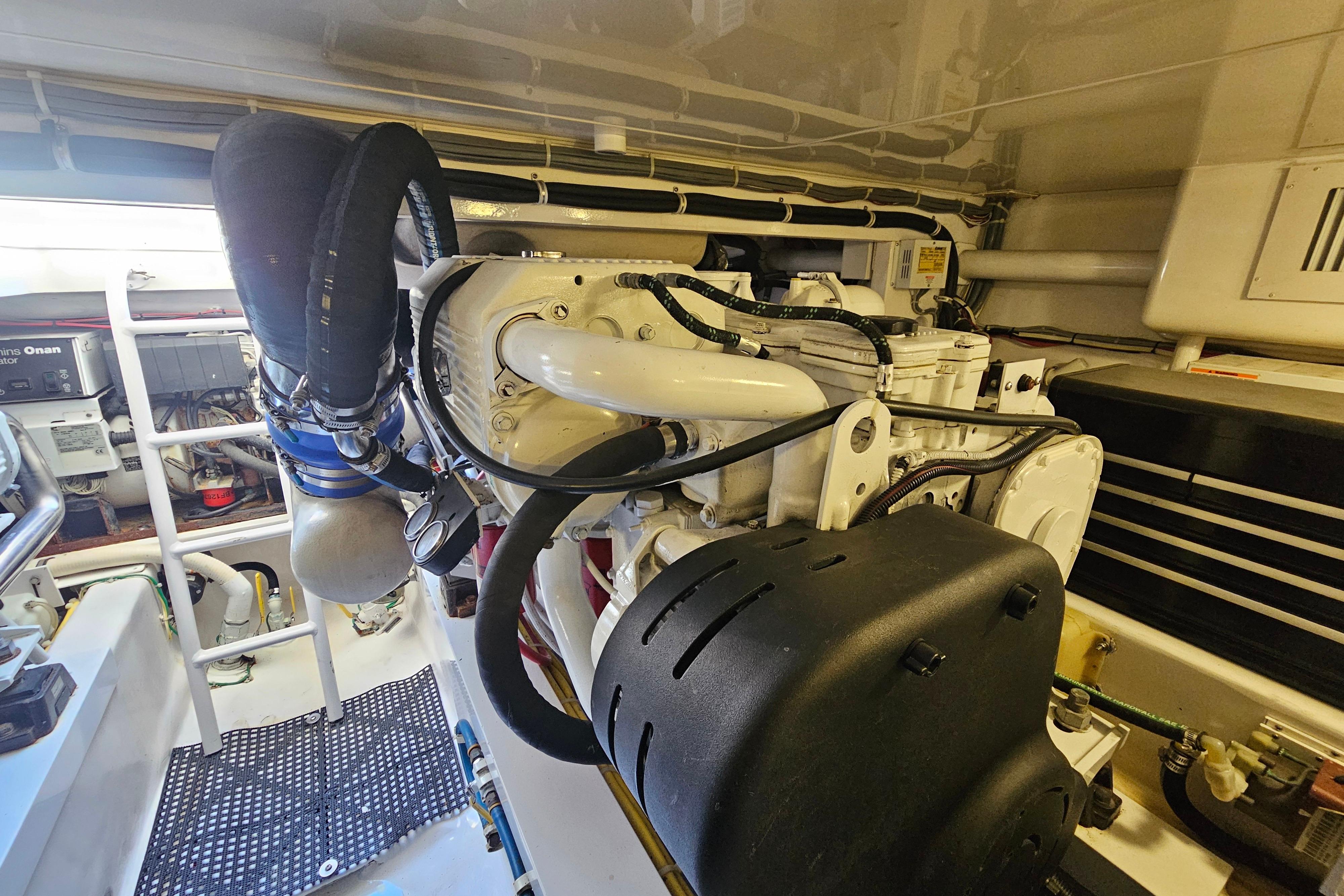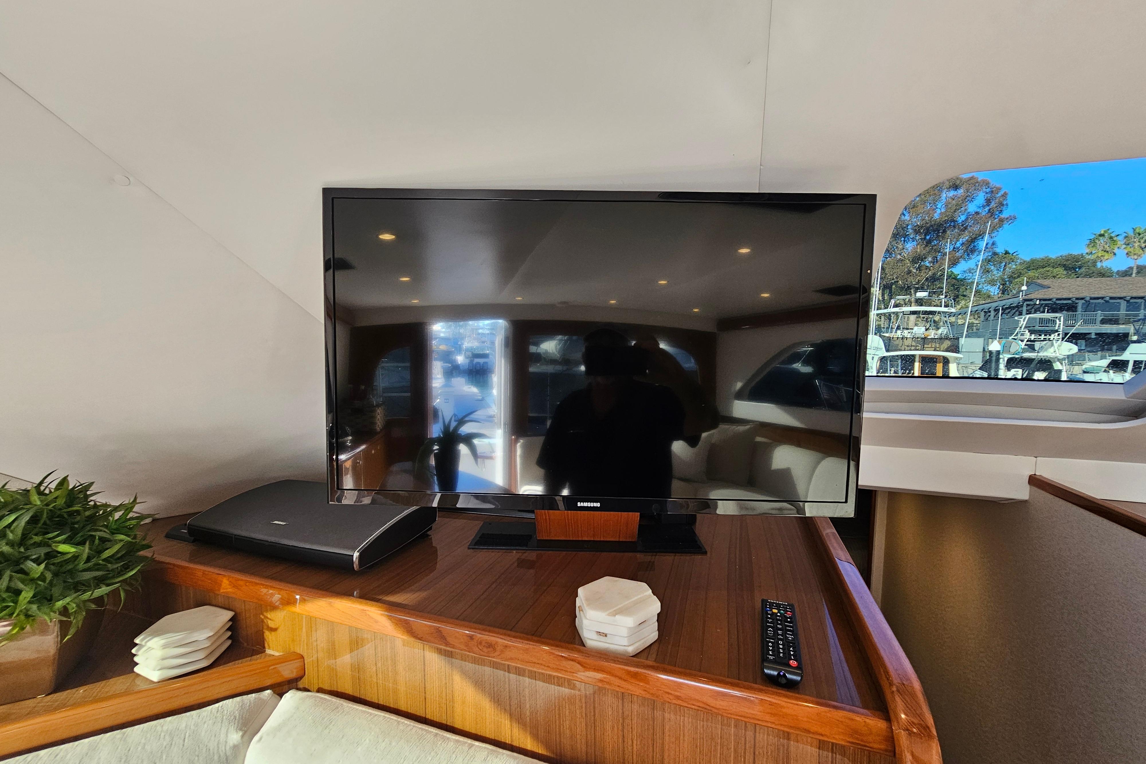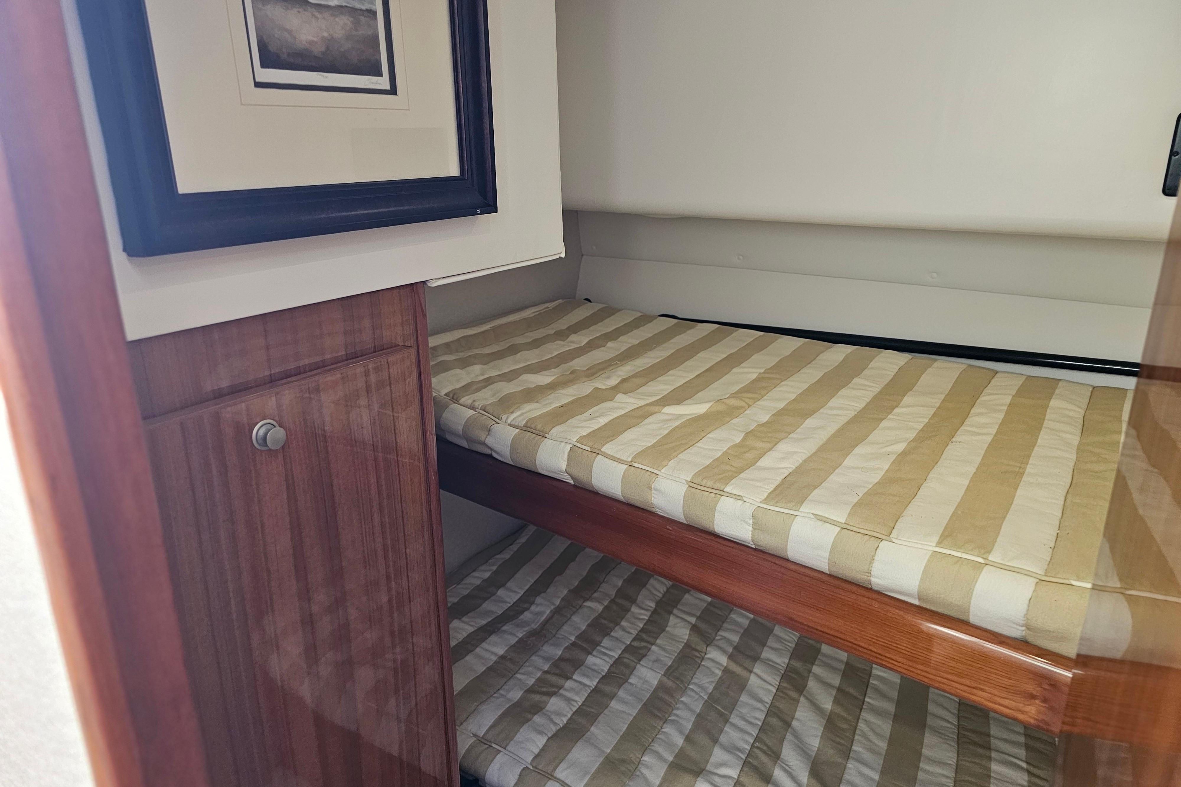 The master stateroom forward has a queen-size walk-around berth, a flat screen television, hull side lockers and stowage galore. A privately accessed head includes a full fiberglass shower stall. Adjacent to the second head, a portside stateroom features upper and lower berths.