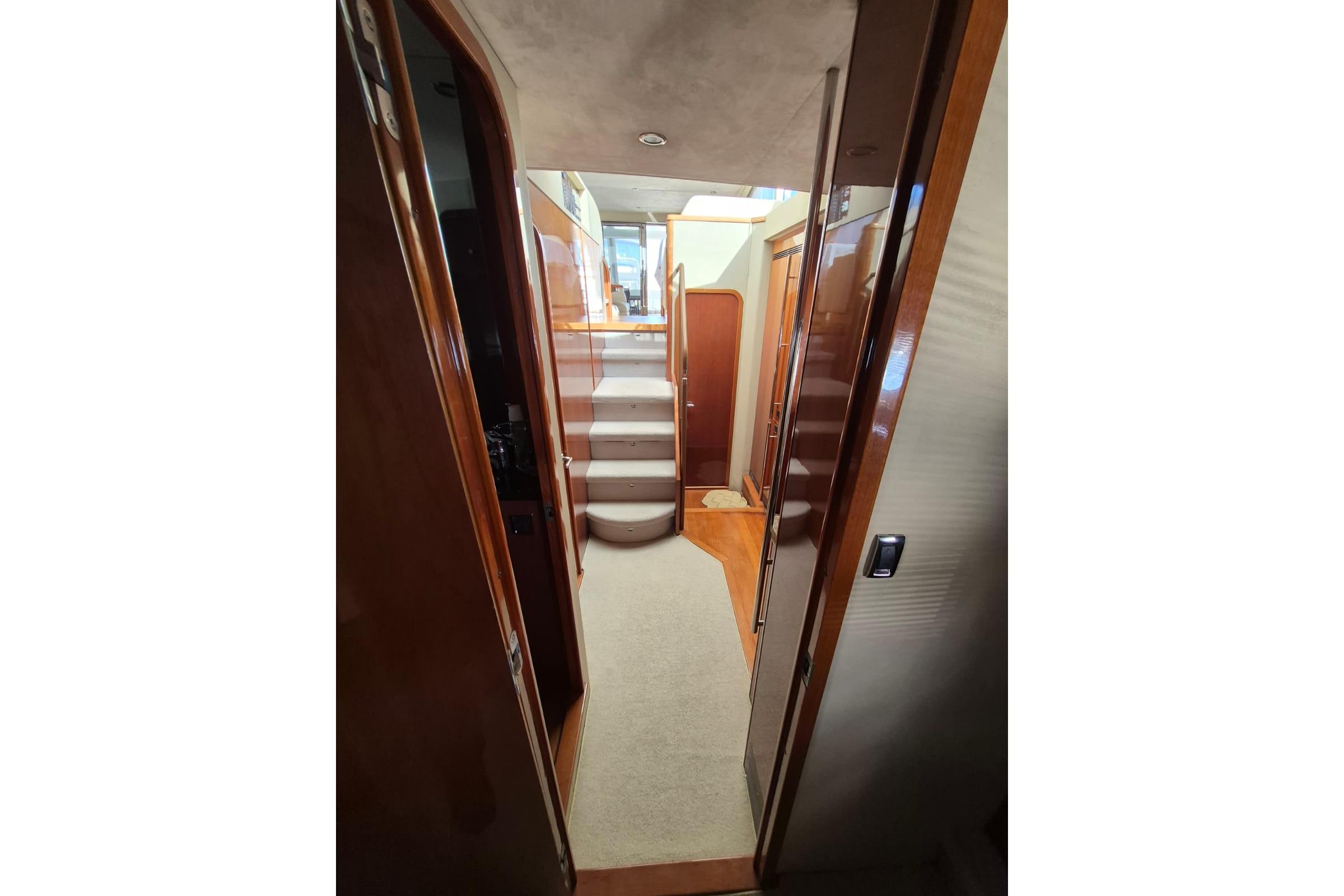Teak-laid transom platform/cockpit deck/flybridge stairway/stairs to side decks