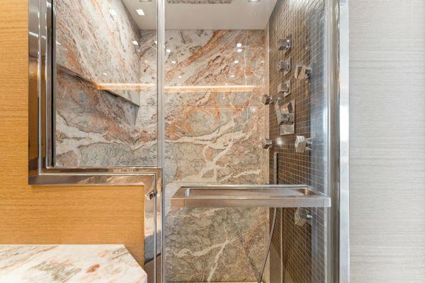 - Floor in teak - Ceilings in Skay and mirror - Doors in oak and printed leather, door handles in satin stainless steel Lower deck – Owner cabin - Furniture in oak and sycamore wood with hi-tech fabric - Tops of all furniture in leather - Walk-in closet with soft fabric walls - Carpet floor - Walls in oak wood and soft fabric - Bed head in fabric - Ceilings in Skay - Sofa in fabric - Bedcover in fabric - Interior of furniture in maple wood Lower deck – owner bathroom - Stone basin integrated in the top - Mirror - Furniture in oak wood - Doors covered with leather - Mosaic shower walls - Floor in teak