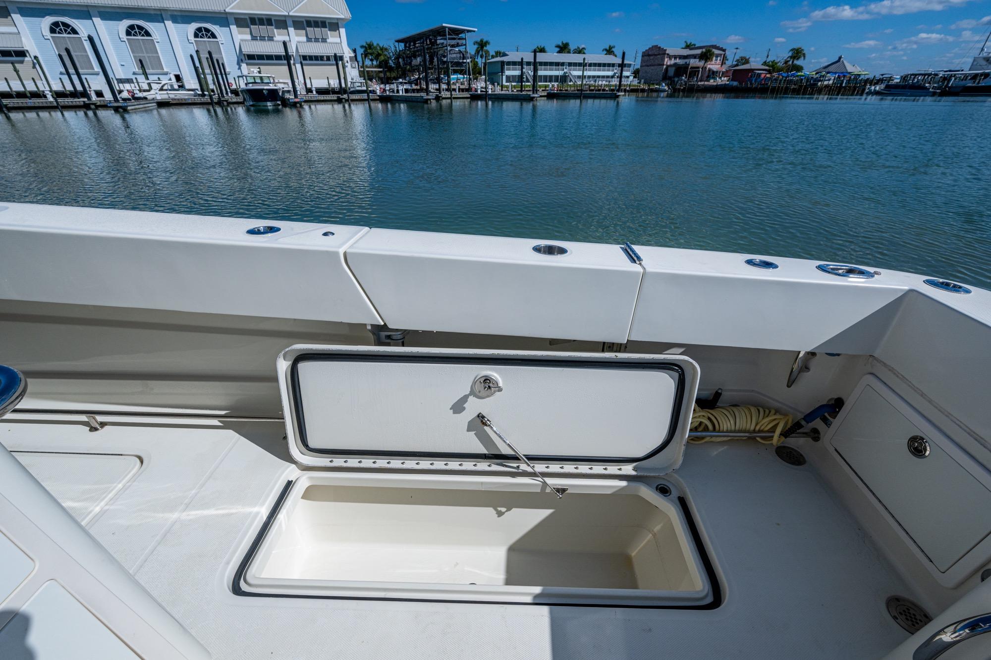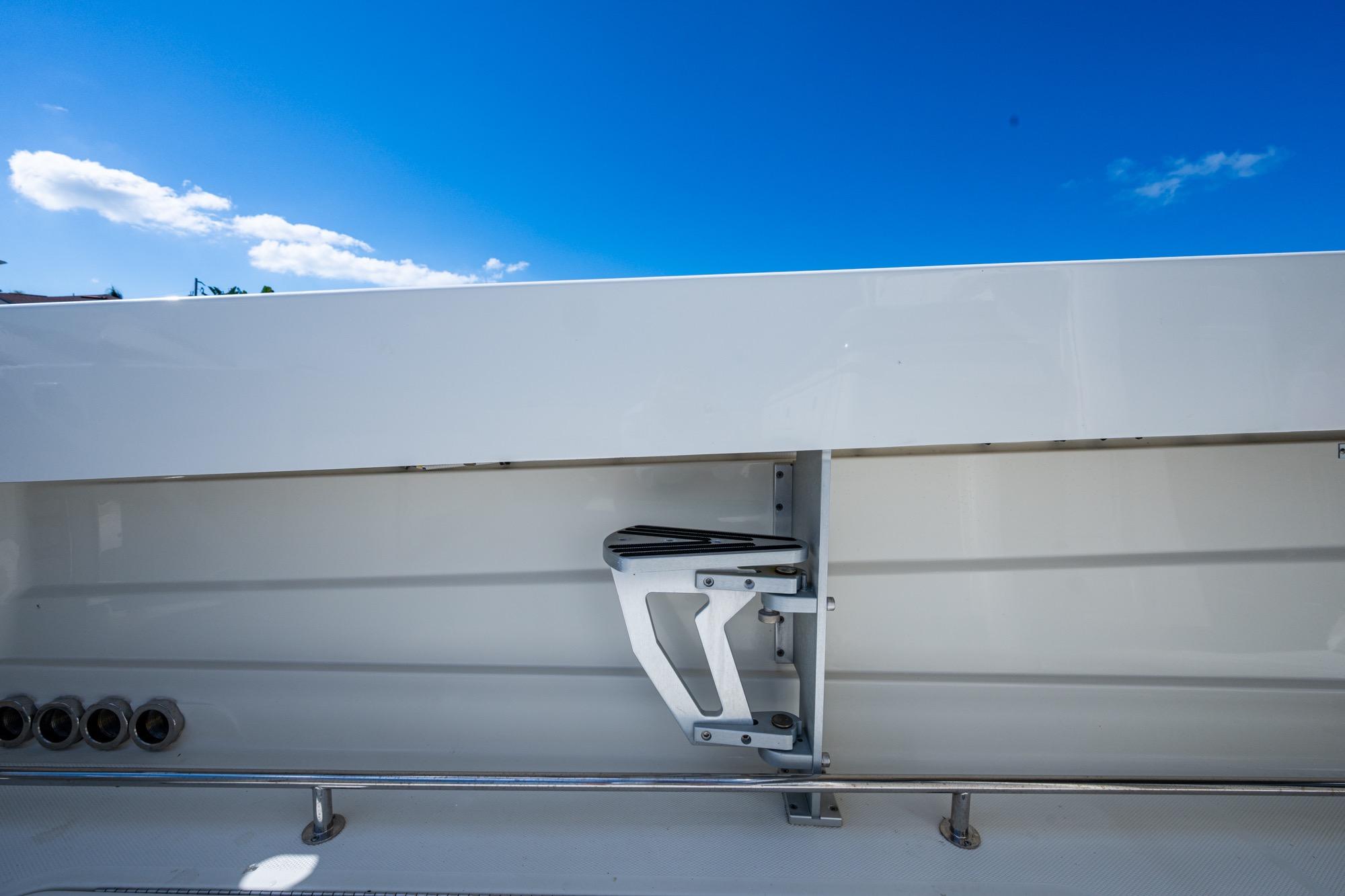 - Summer Kitchen located behind the second row of helm seats, it includes a grill, Refrigerator, sink, cutting boards, and storage