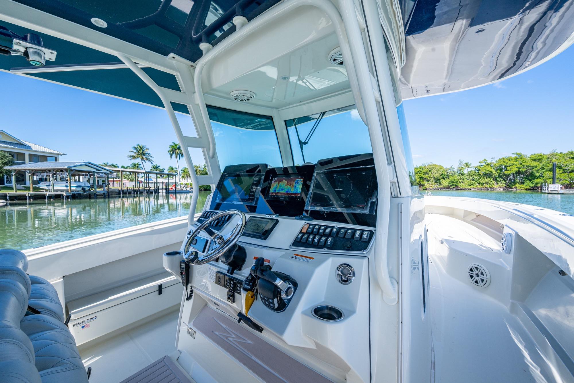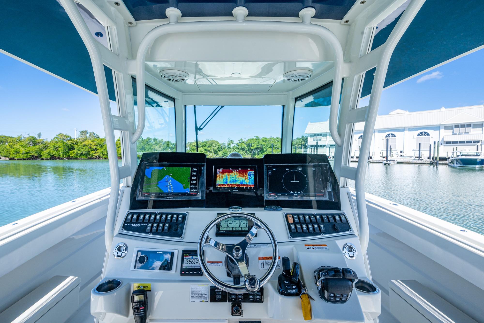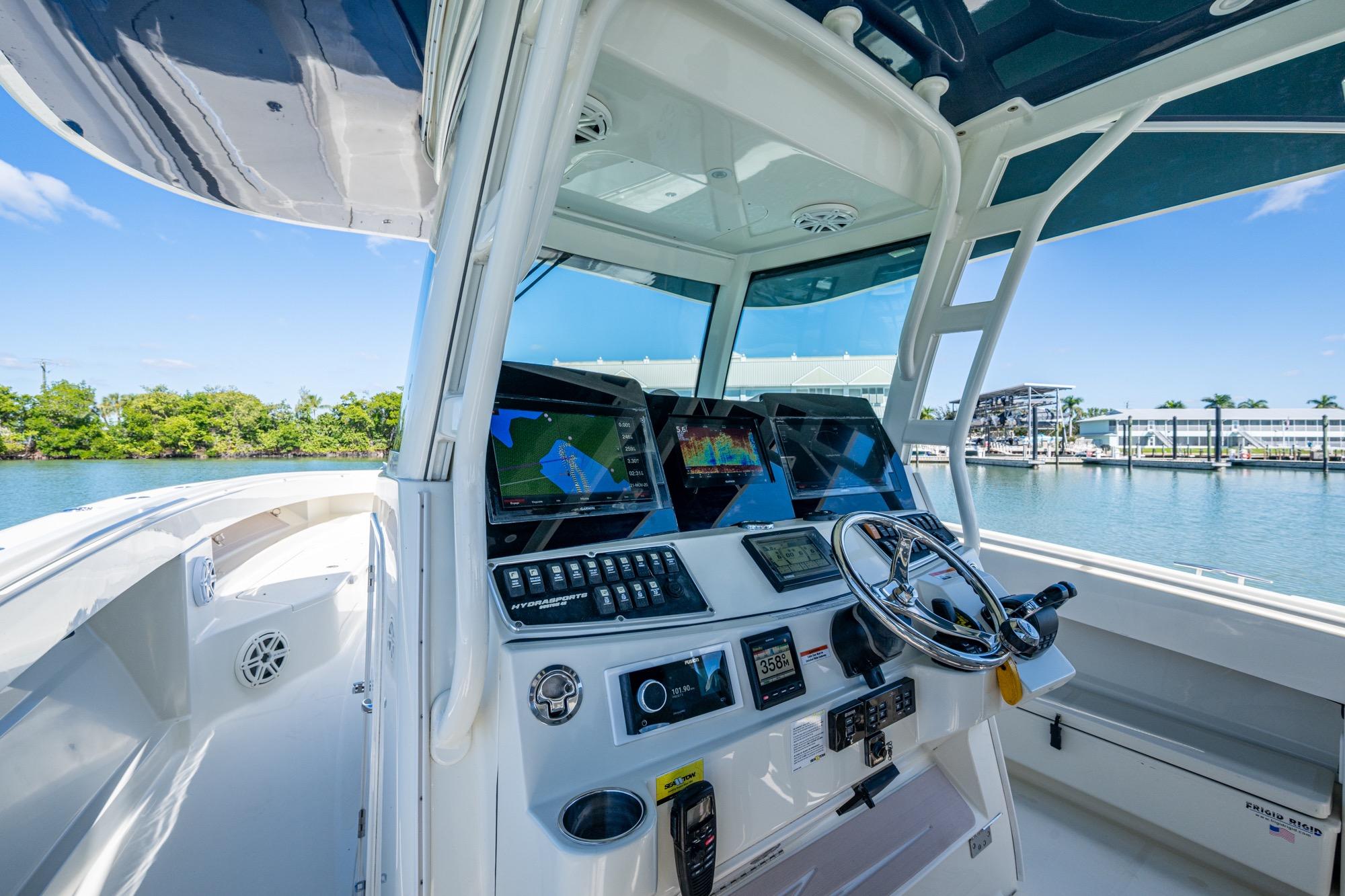 - Triple Garmin screens, Garmin autopilot display, and a Helm Master Joystick