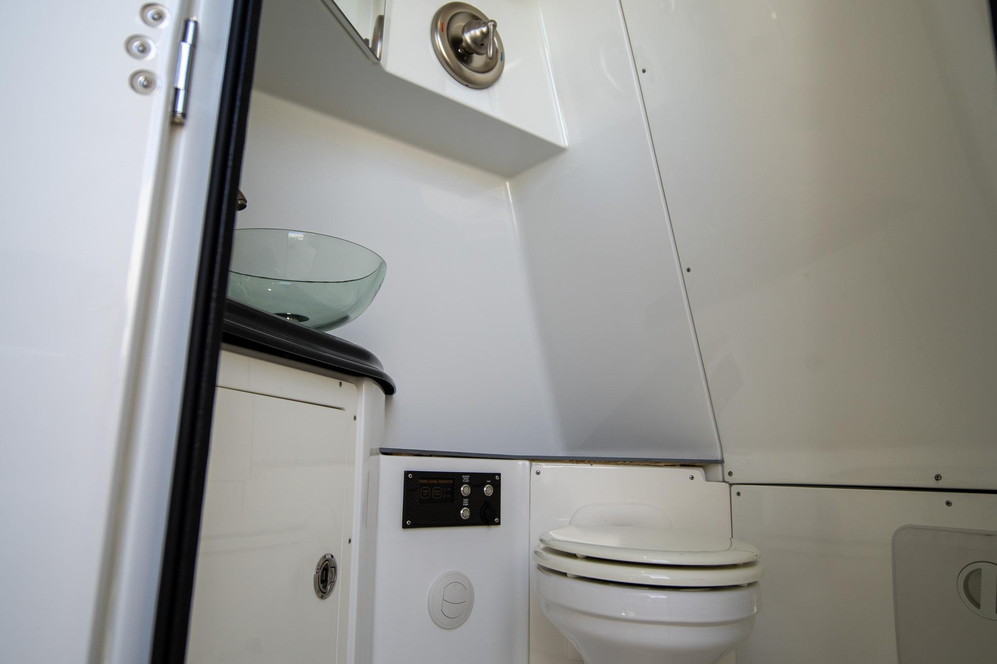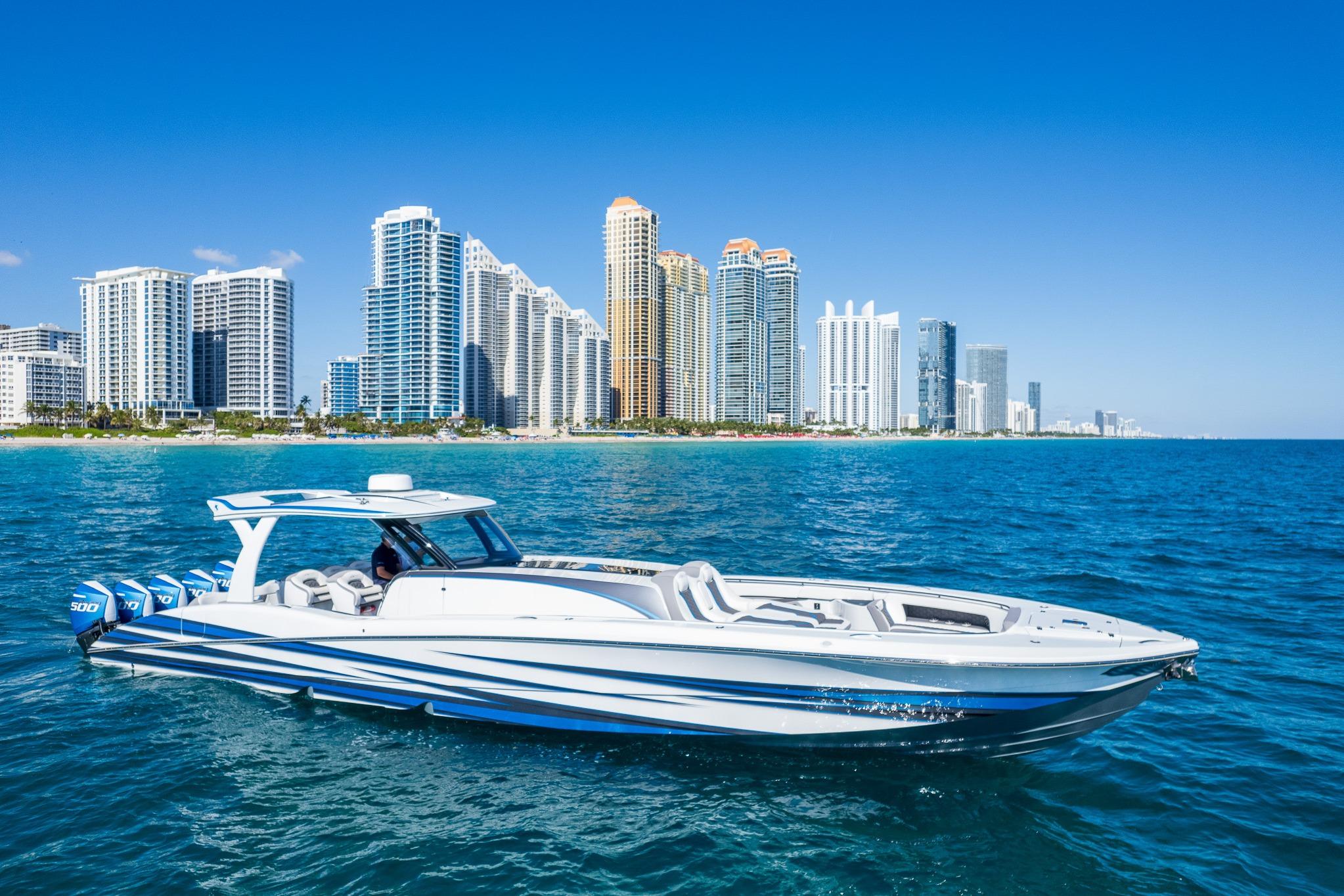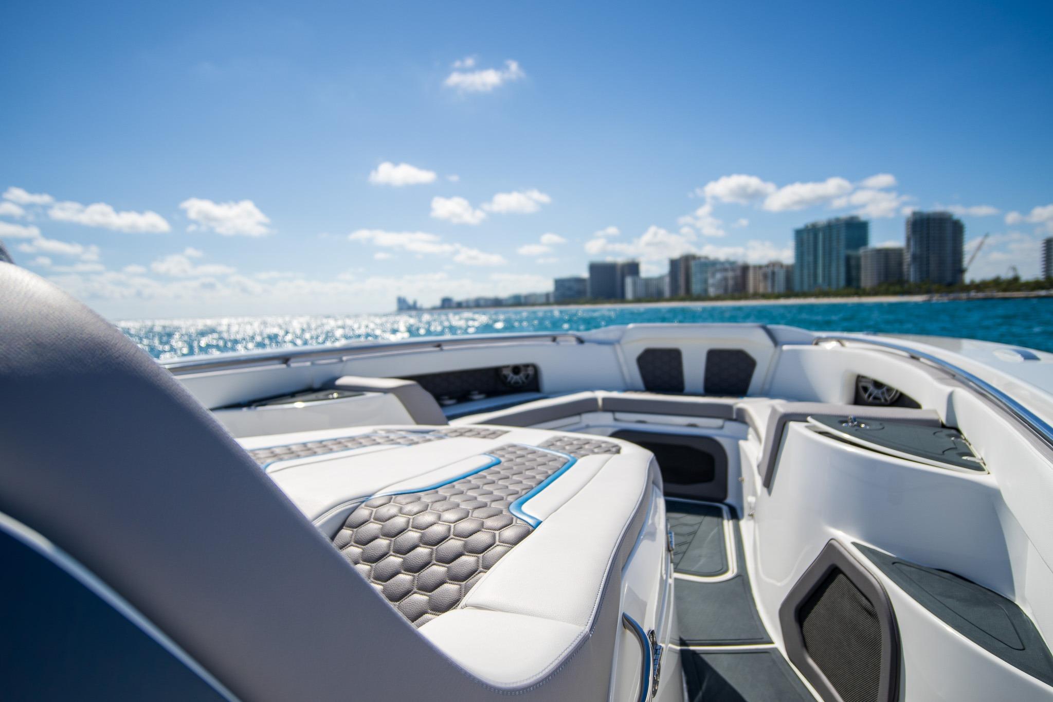 Grey gel coat bottom. Stage 2 Paint. Cool Touch Interior. SeaDek Flooring. Bow Pop Up Table. Cockpit cooler with chill plate and bottle storage. Garmin electronic package. 24 inch in center and 2. 17 inches on the sides. XM Weather. 24” Garmin Dome Radar. Stage 3 Stereo. Wing speaker. Hidden pop up Bow Speakers, Rear View Camera. Bow and Stern Sun Shades, Cabin Wardrobe closet with Wine Cooler. 32”TV in Cabin. Power Inverter with Air Conditioning in Cabin. Bow FLIR Night-Vision Camera, Full Boat Cover with sectional covers. Underwater lighting. Color changing interior lights. Bow and Stern Thrusters.