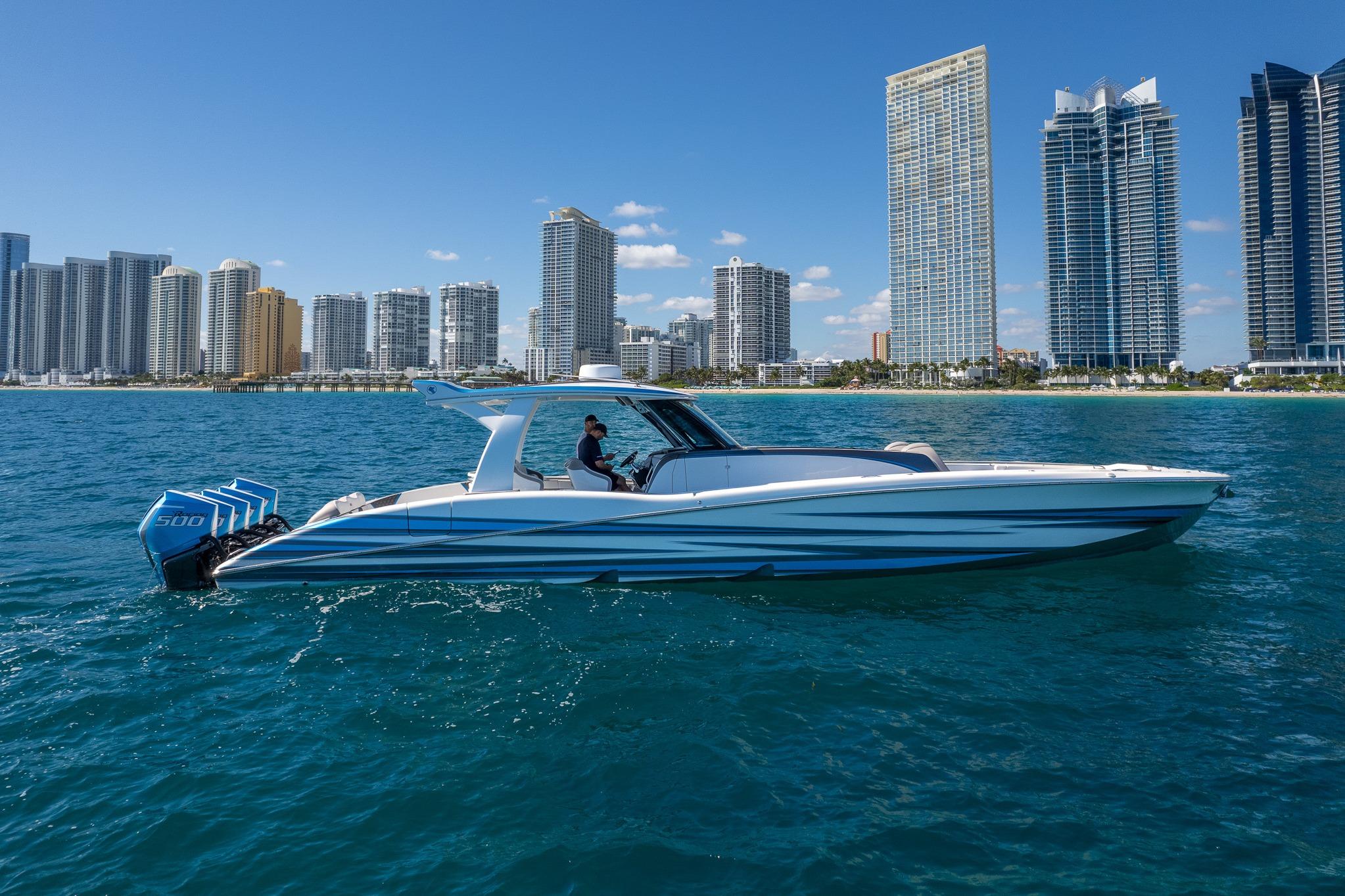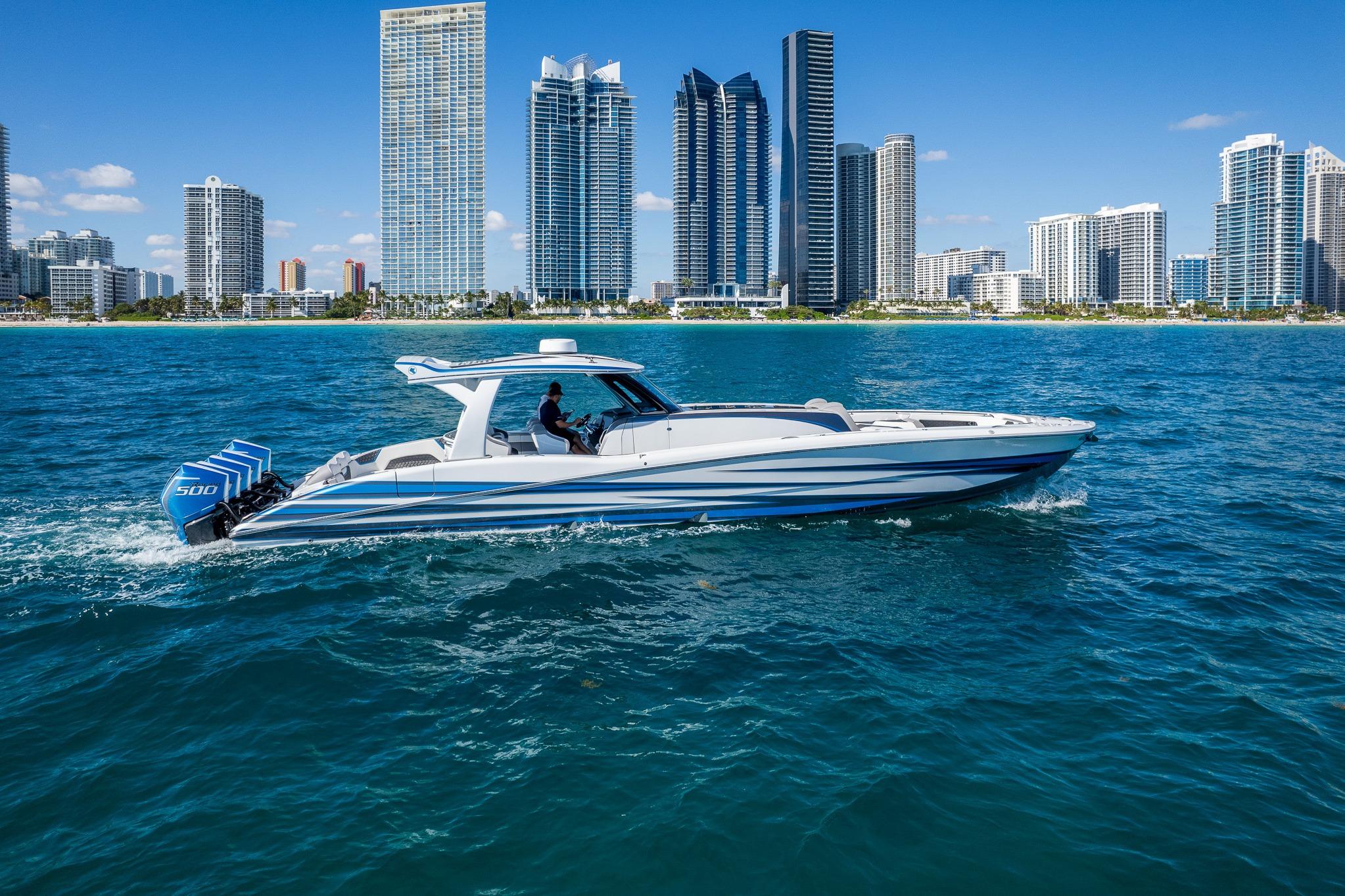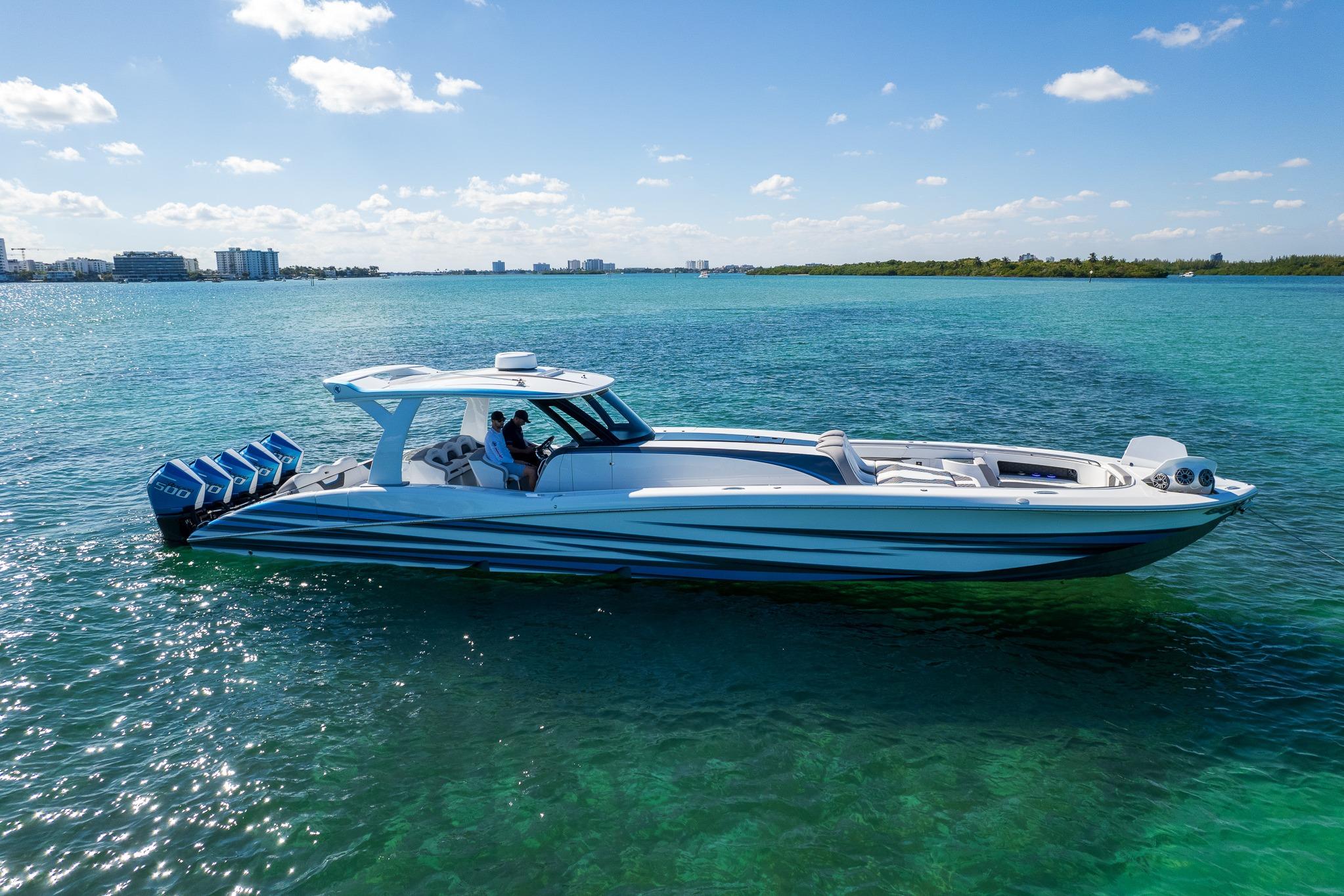 2022 MTI V50 powered by Quint Mercury Racing 500R’s with approx. 395 hours. Custom Painted Grey to match hull MYCO Trailer included.
