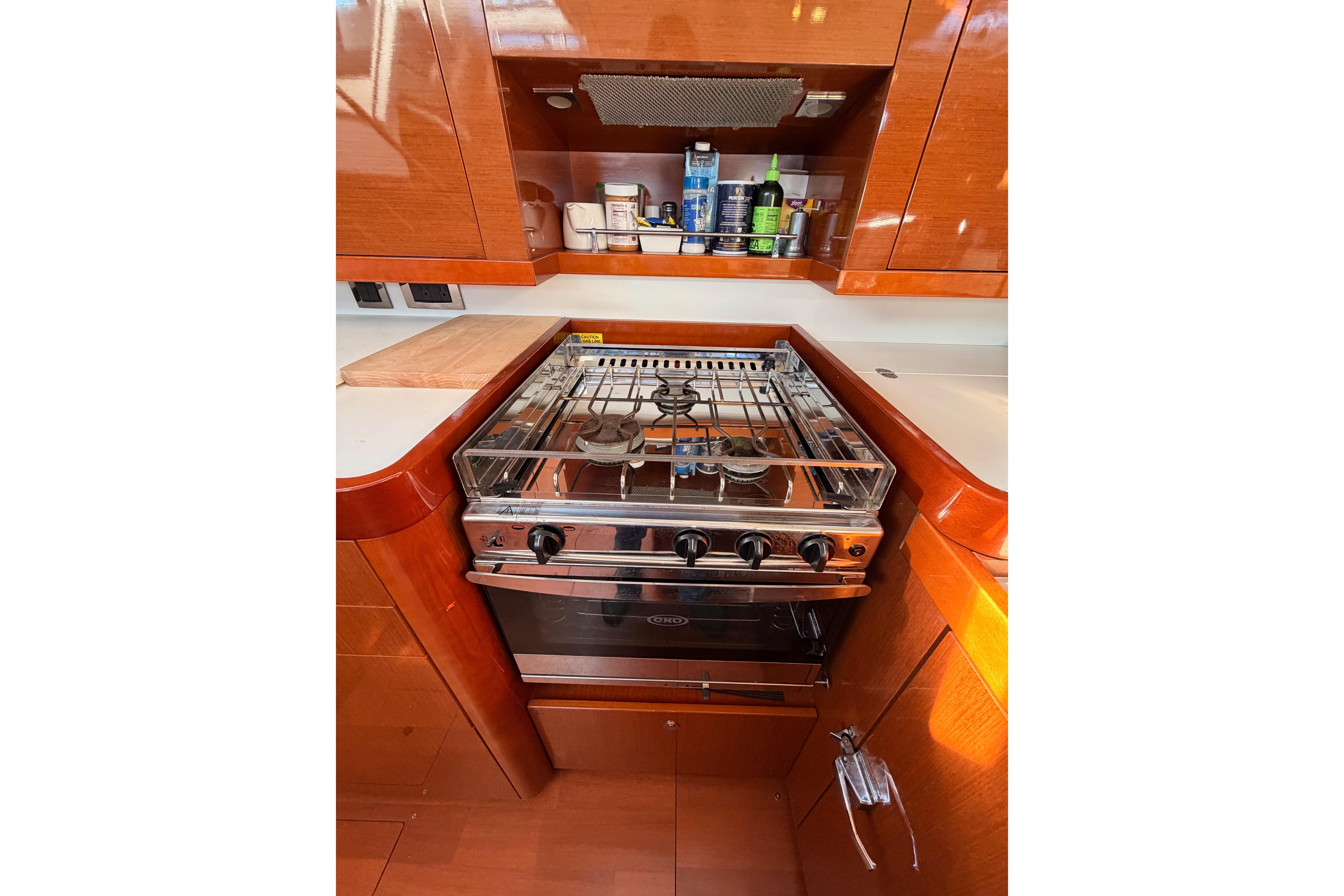 - Galley: The full-beam galley is located forward, providing a large work area with tall cabinets, deep drawers, and ample refrigeration.